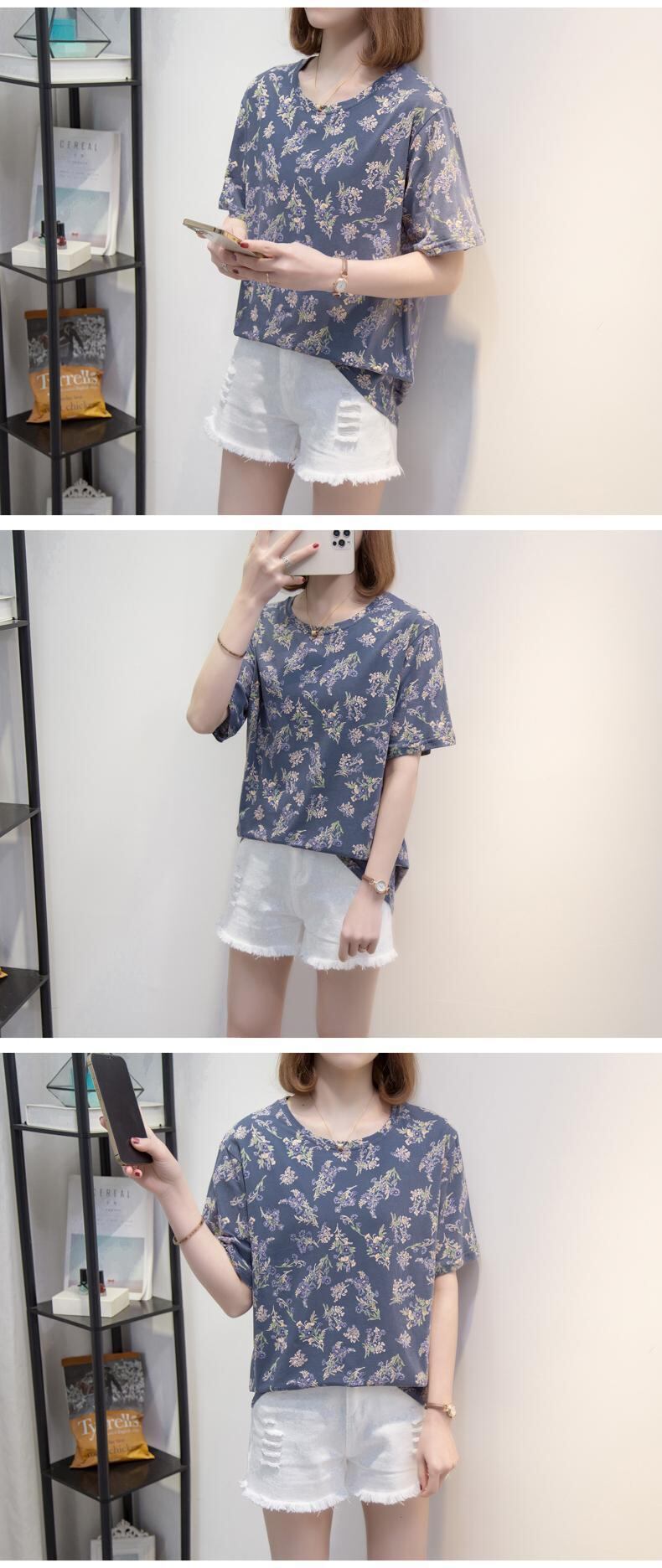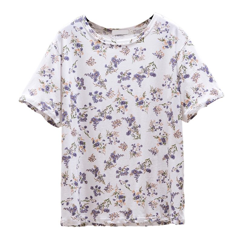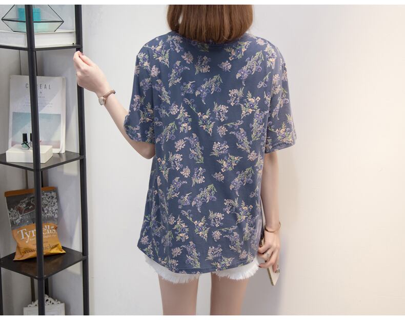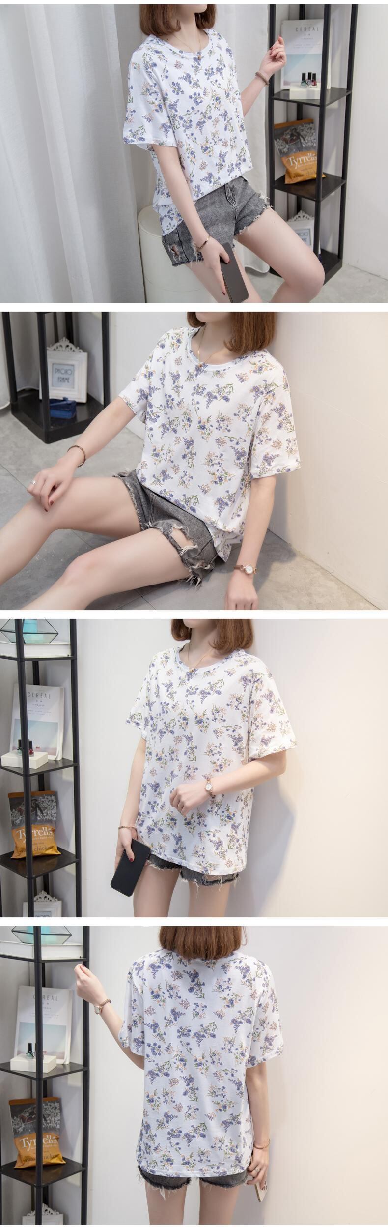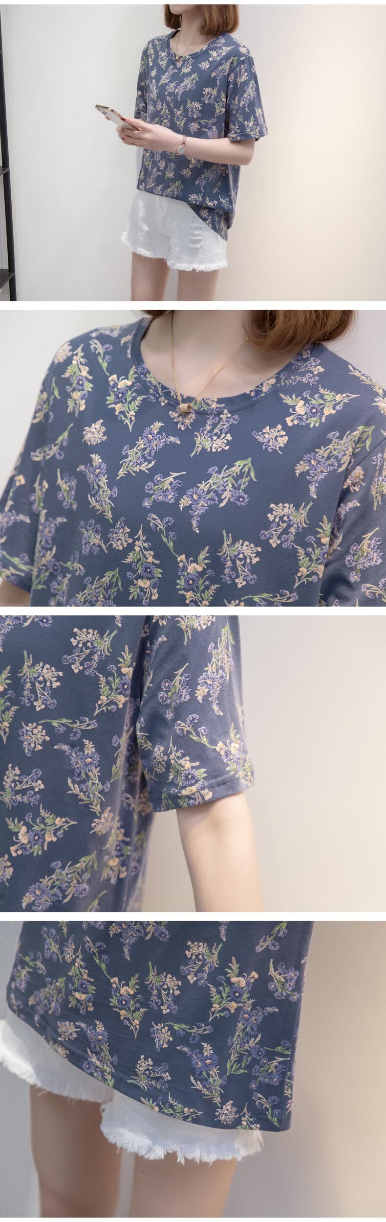 大きいサイズの婦人服 2023 夏の新しいファット シスター ルーズで薄いバージョン ラウンド ネック花柄フレンチ カジュアル Tシャツ 大きめサイズ サマー 夏物 Oネック 8884171975727042