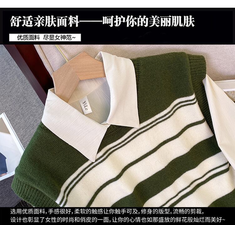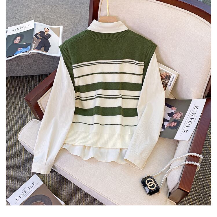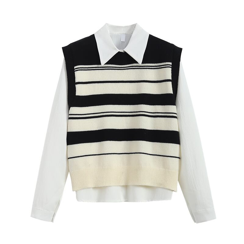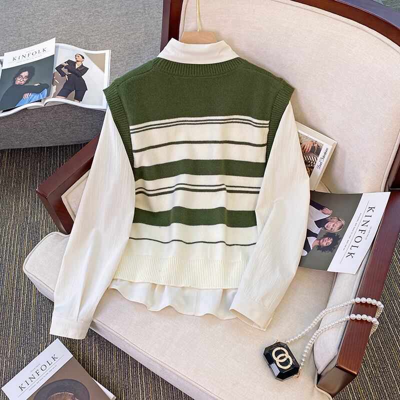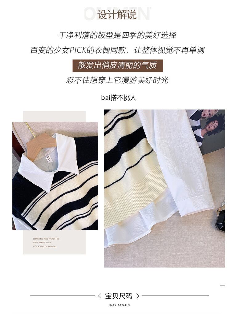 プラスサイズの婦人服 2023 春服ファットシスターズ新しいファッション白いシャツコントラストカラーストライプベストツーピーススーツ ホワイト 大きめサイズ スプリング 春物 8884127989458968