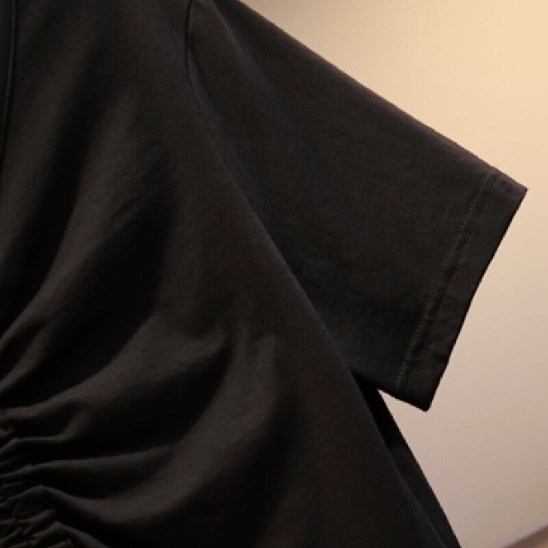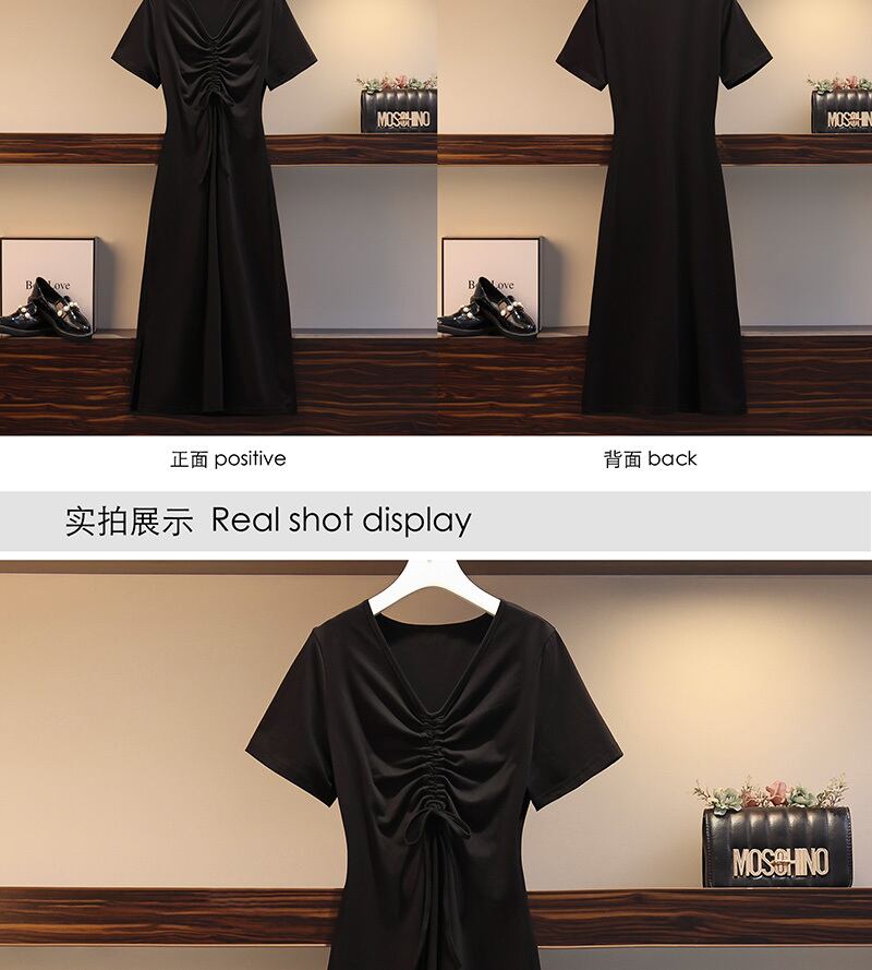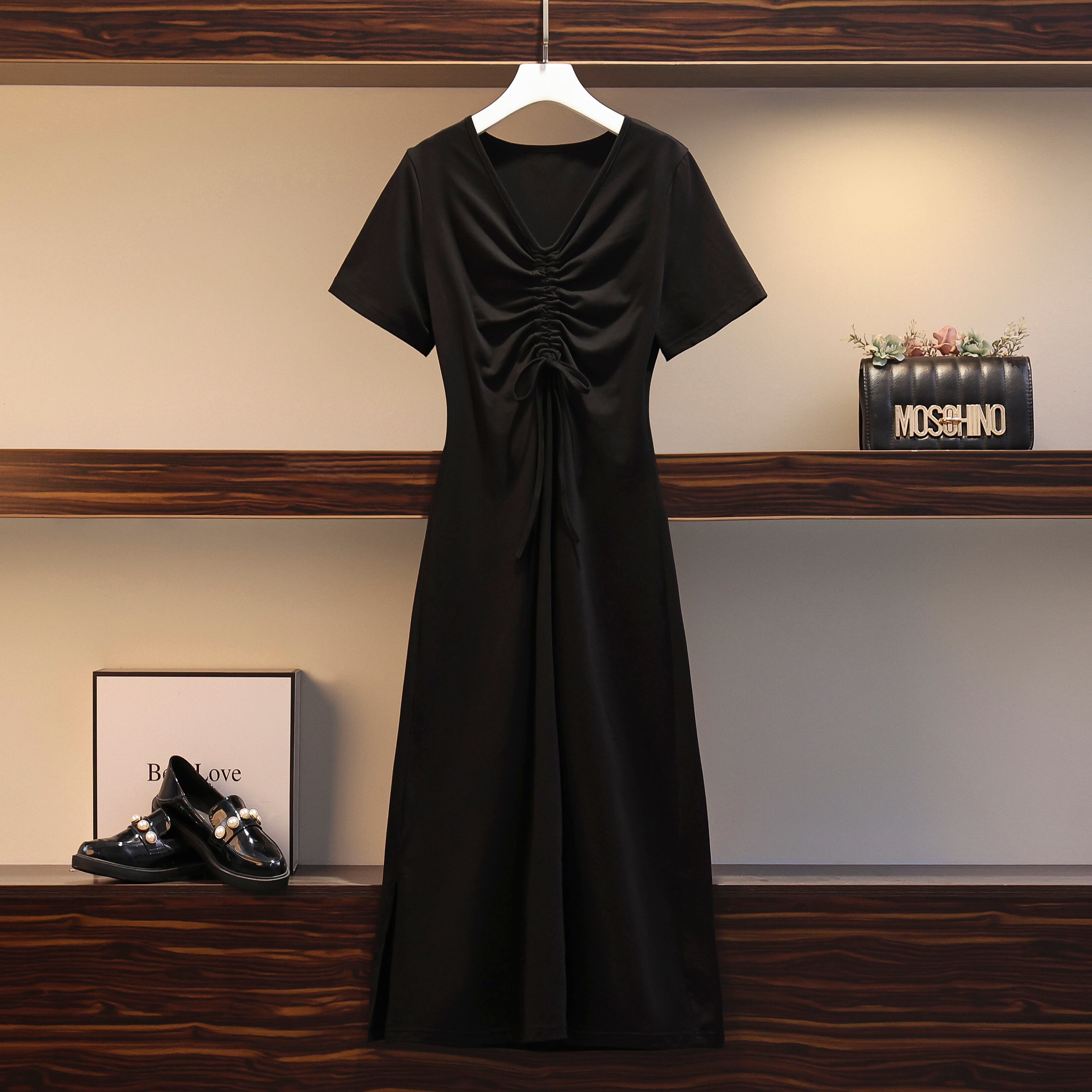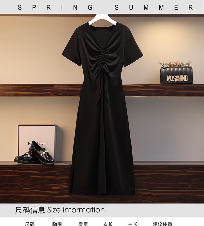 大きいサイズの婦人服 2023 夏の新しいファットシスターファッションウエスト巾着 V ネック薄い無地のドレスの女性 大きめサイズ サマー 夏物 Vネック ソリッドカラー 8884183480353456