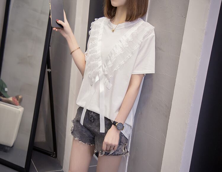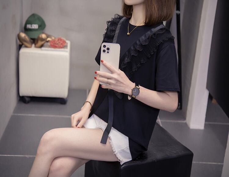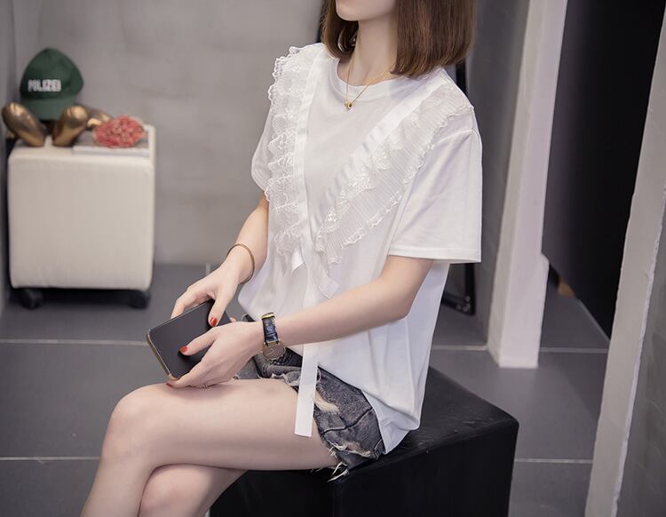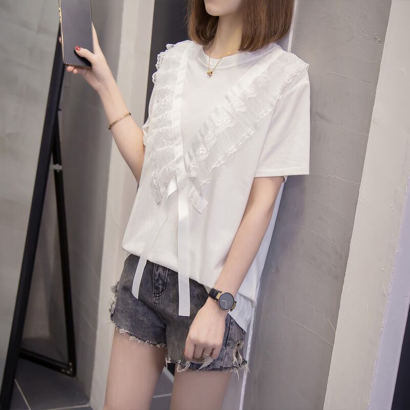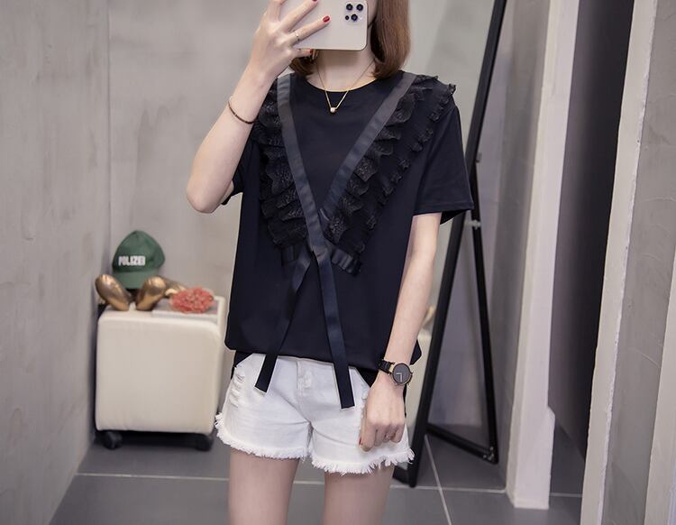 プラスサイズの女性の2023年夏の新しいファットシスターバージョンルーズで薄いレースのラウンドネックのシックなTシャツ年齢の削減 大きめサイズ サマー 夏物 Oネック 8884131518407736