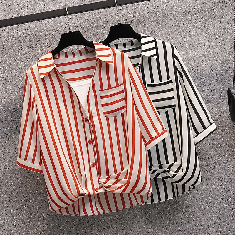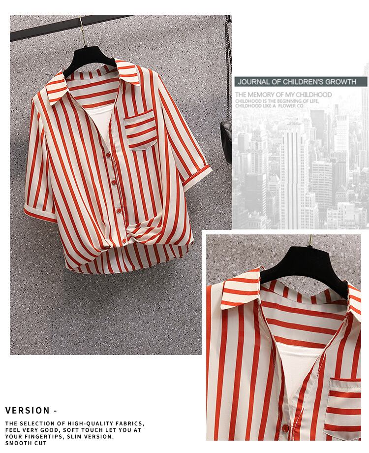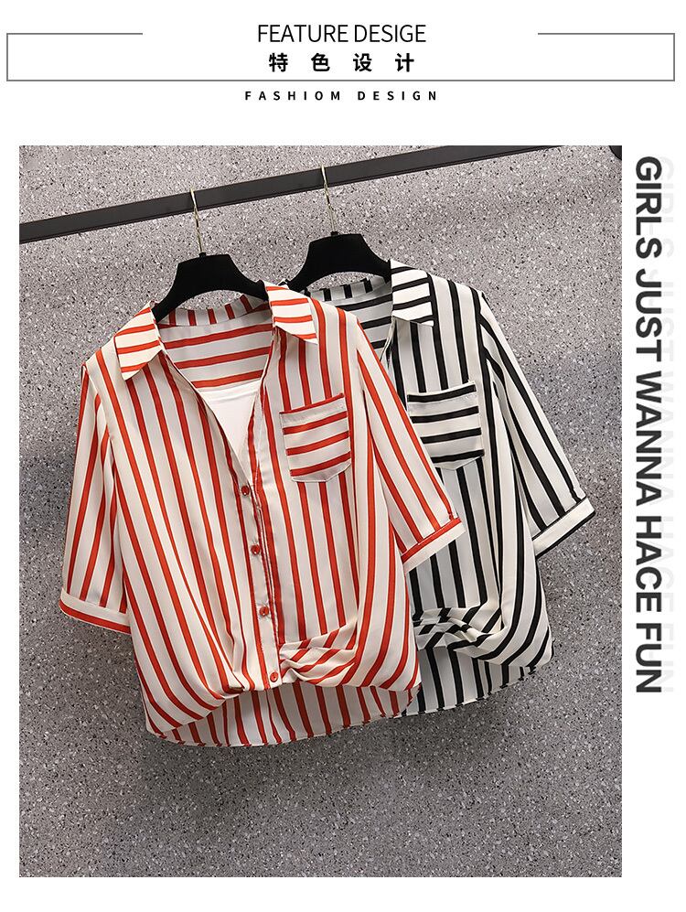 プラスサイズの婦人服 2023 ファットシスター夏新ストライプシャツショートルーズウエスタンスタイルプルオーバー半袖トップ 大きめサイズ サマー 夏物 8884174076482622