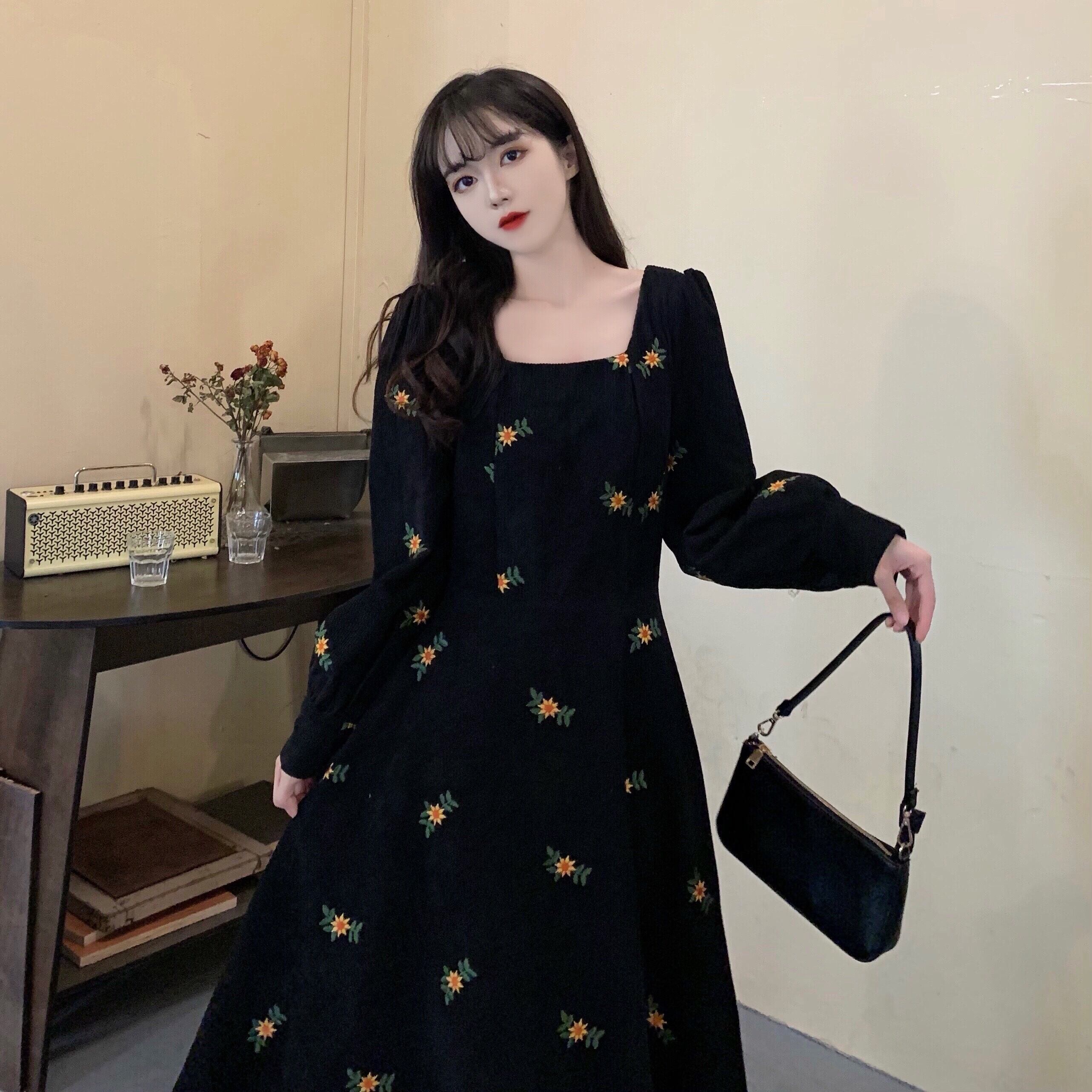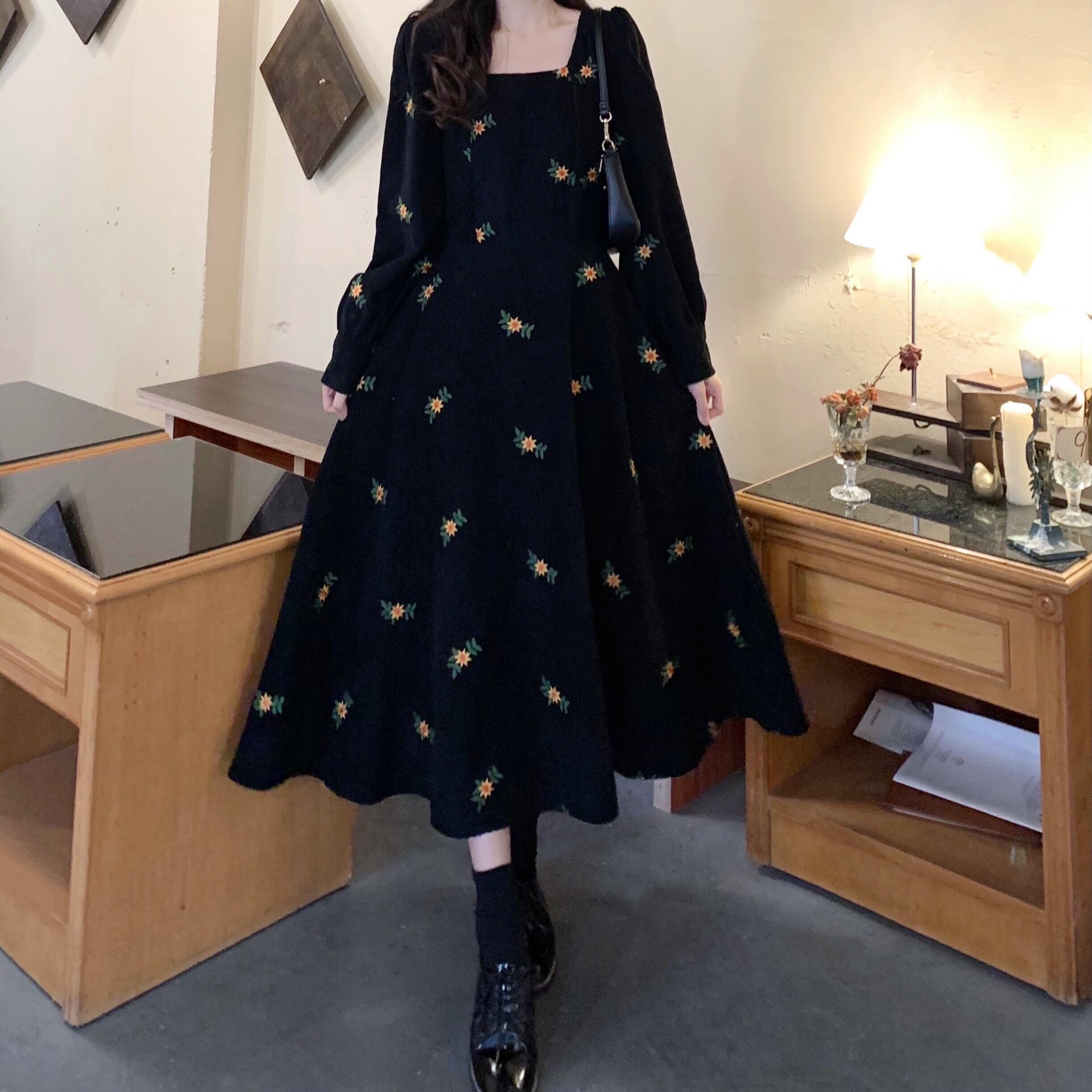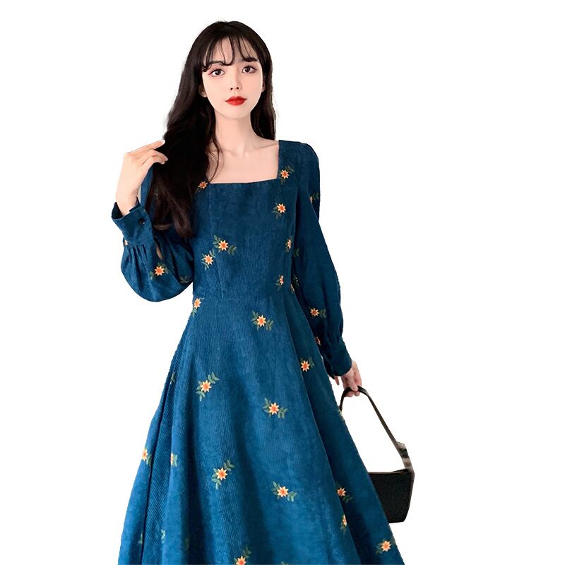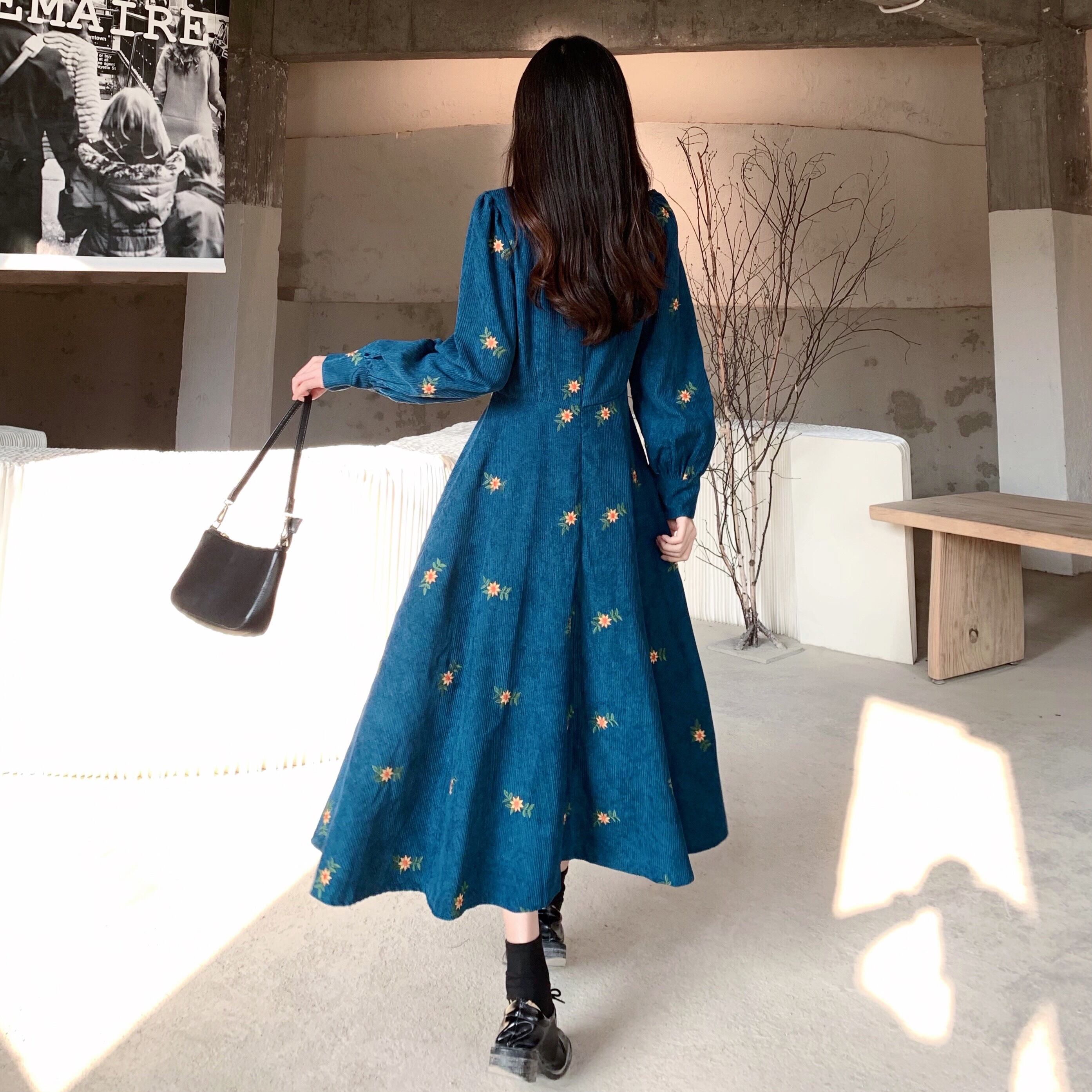 プラスサイズの婦人服 2023 ファットシスター春の新ファッション気質スリムレトロ刺繍コーデュロイドレス 大きめサイズ スプリング 春物 8884111836477131