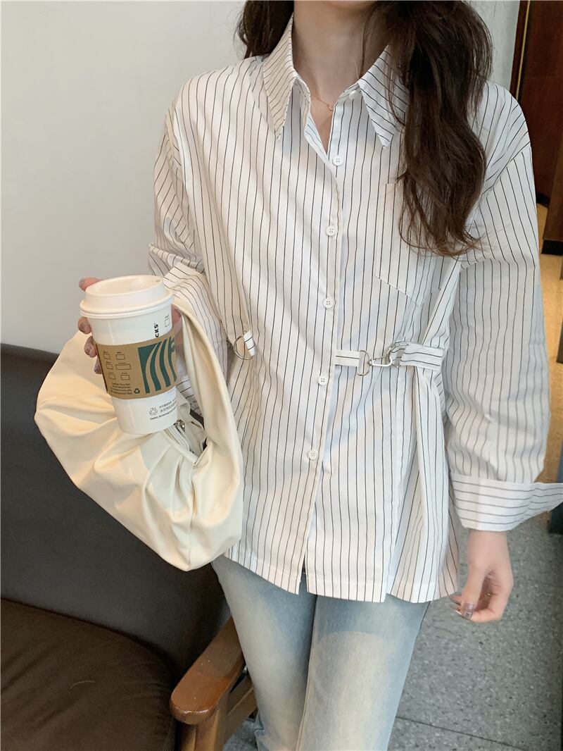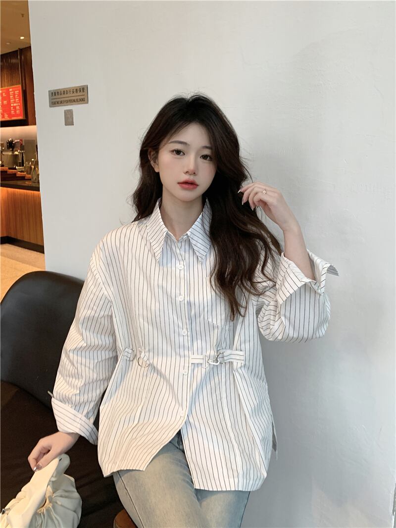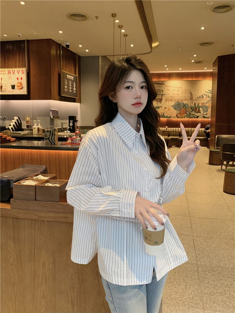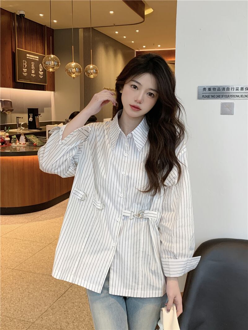 プラスサイズの婦人服 2023 春服ファットシスターズ新ファッションストライプシャツ長袖ルーズウエスト痩身トップス ロング 大きめサイズ スプリング 春物 8884160993165688