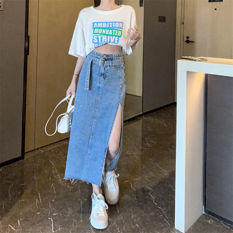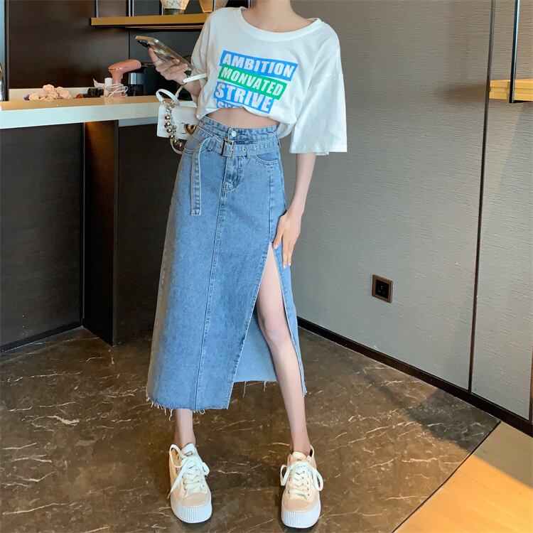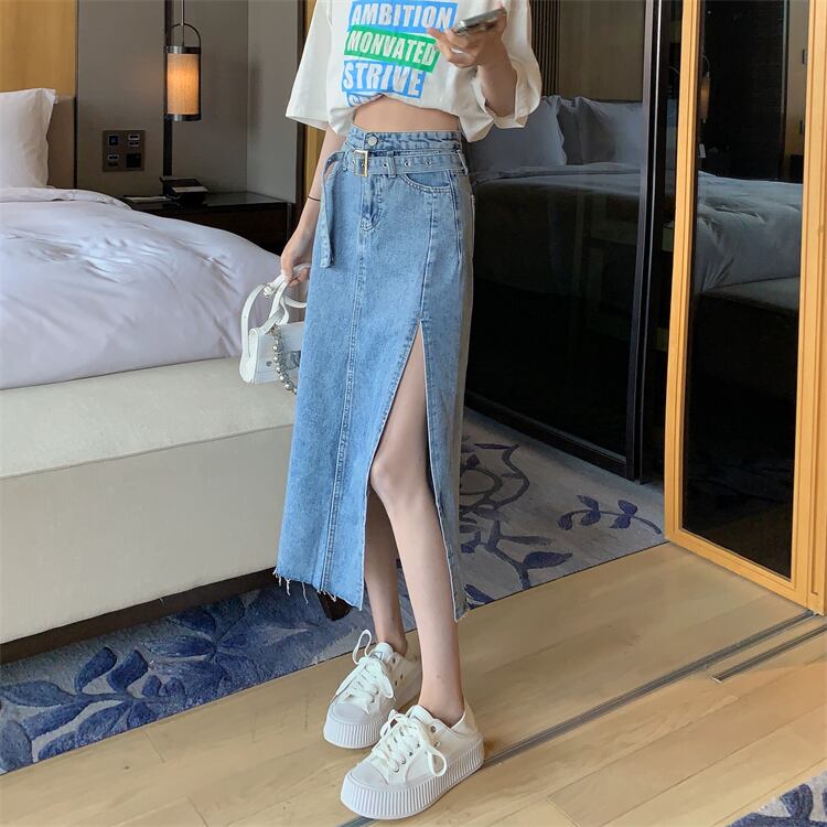 プラスサイズの婦人服 2023 春服脂肪姉妹新しいミッドレングスベルトデザイン感スリットデニムスカート女性 大きめサイズ スプリング 春物 ハーネス 8884132392341954