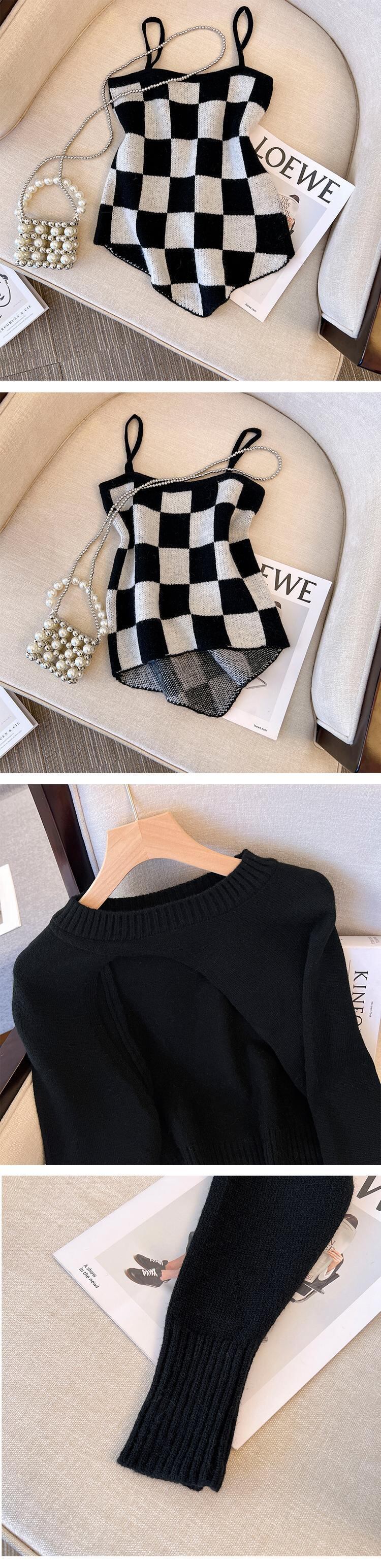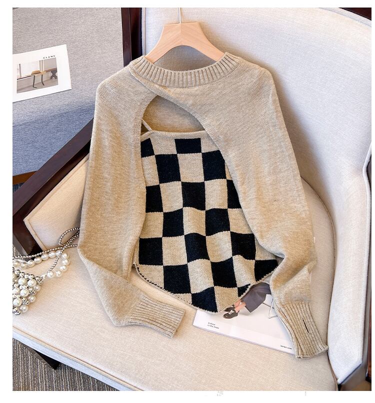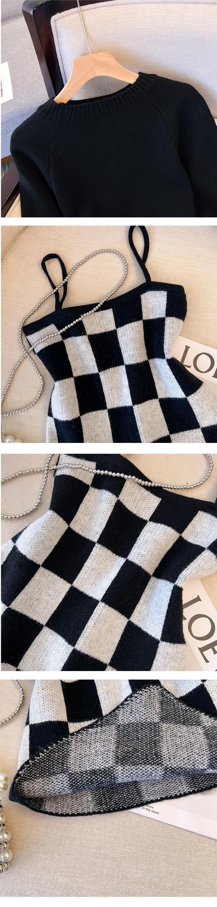 プラスサイズの婦人服 2023 ファットシスター春の新オールマッチニットセーターブラウスチェック柄サスペンダーツーピーススーツ 大きめサイズ スプリング 春物 8884187697839555