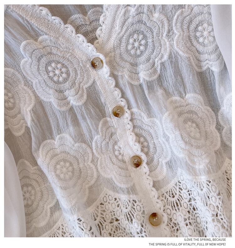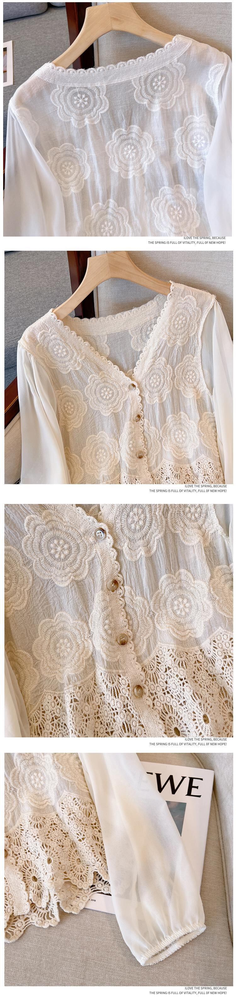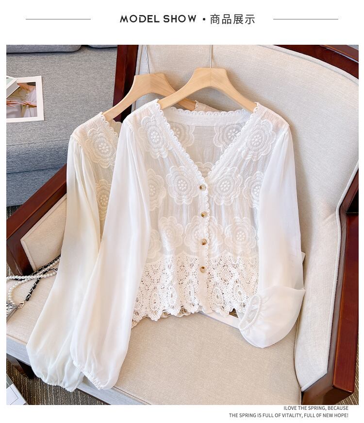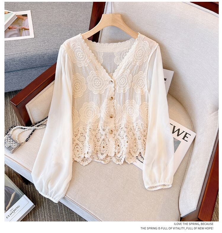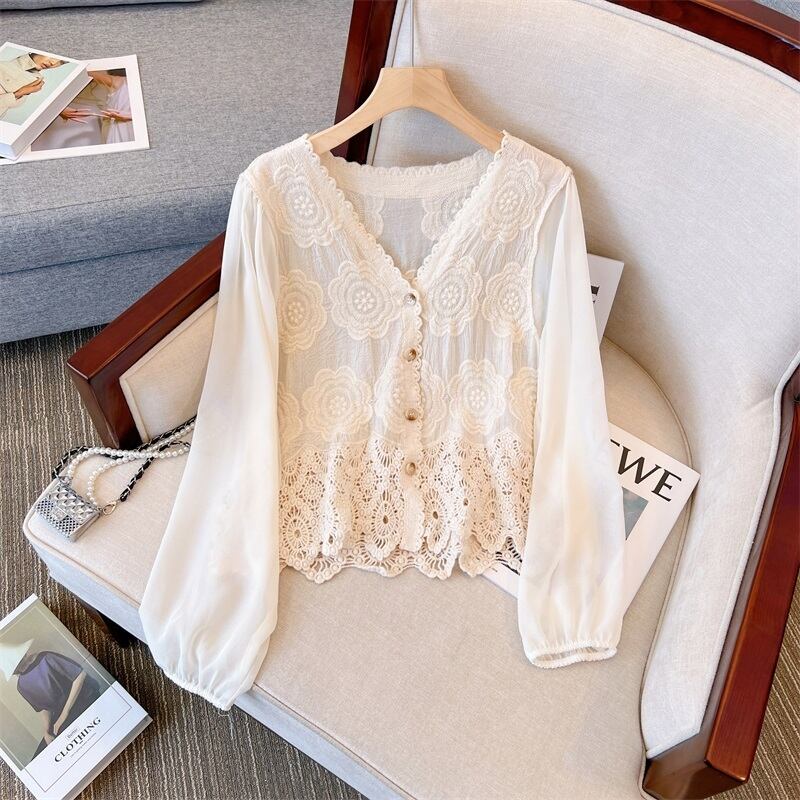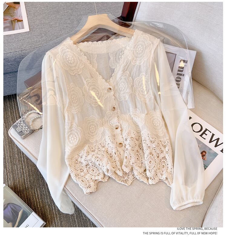 プラスサイズの婦人服2023春服ファットシスターズ新気質中空レースカーディガンVネック長袖オールマッチシャツ ロング 大きめサイズ スプリング 春物 888414292009898