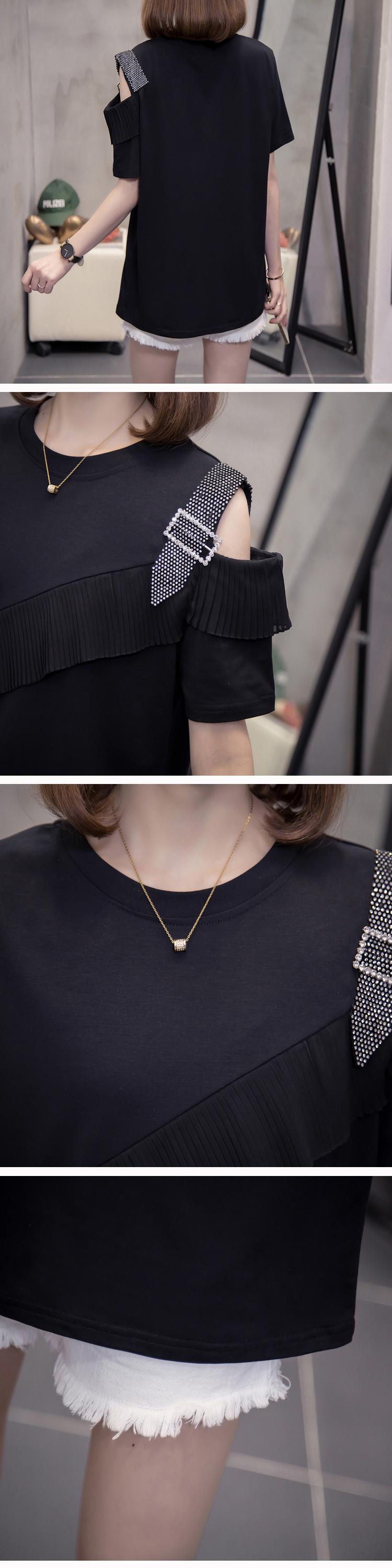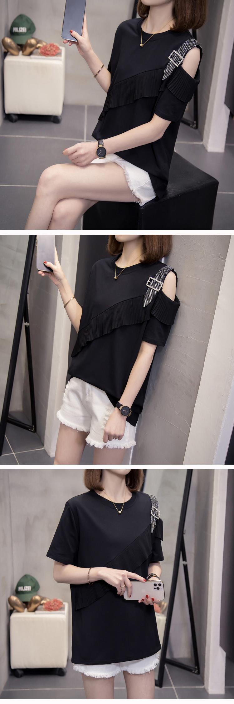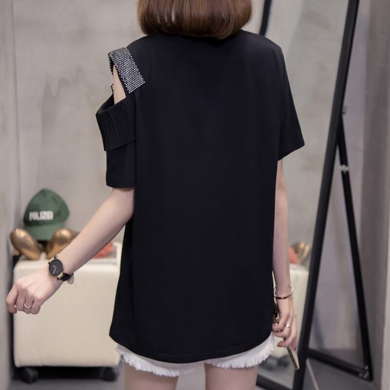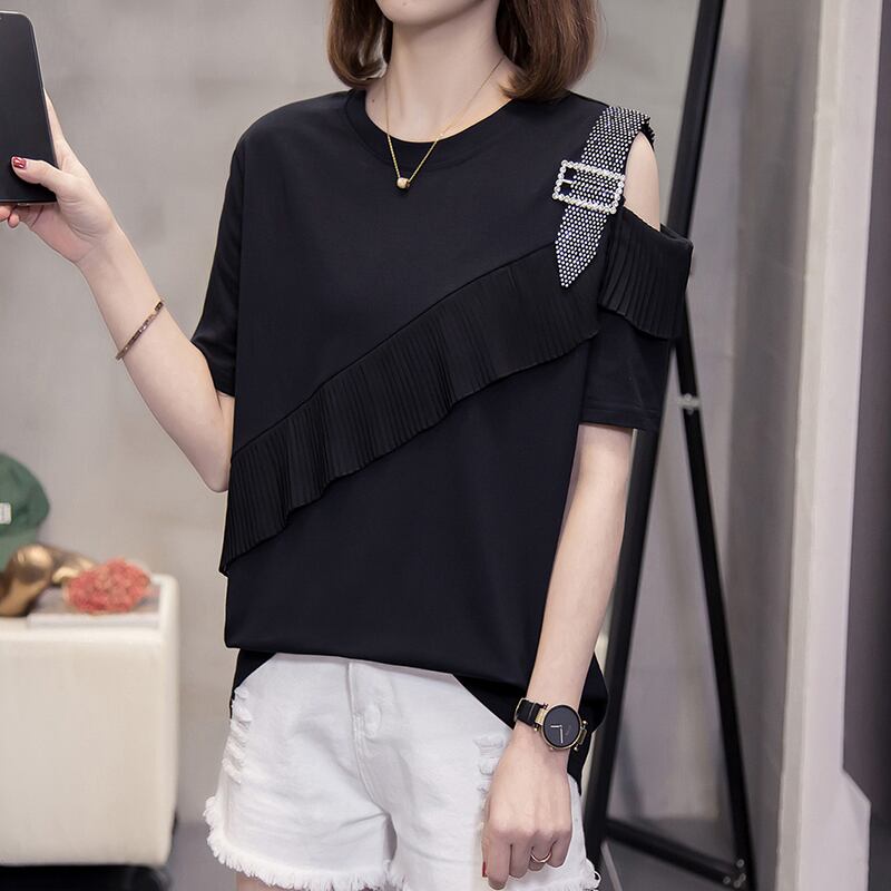 プラスサイズの婦人服2023夏の新しいファットシスタールースストラップレスデザインダイヤモンド半袖シックなフレンチTシャツ ショート ハーフスリーブ 大きめサイズ サマー 夏物 888419540309870