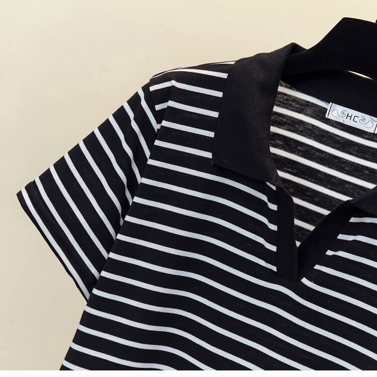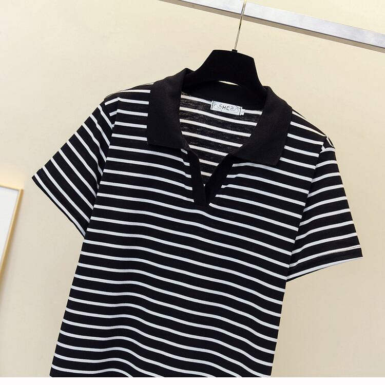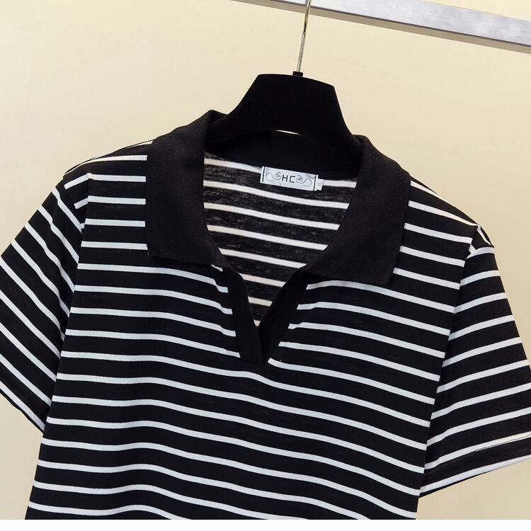大きいサイズの婦人服 2023 夏の新しいファット シスター ストライプ デザイン センス ルーズ オールマッチ ラペル 半袖 Tシャツ 女性 大きめサイズ サマー 夏物 8884145659997810