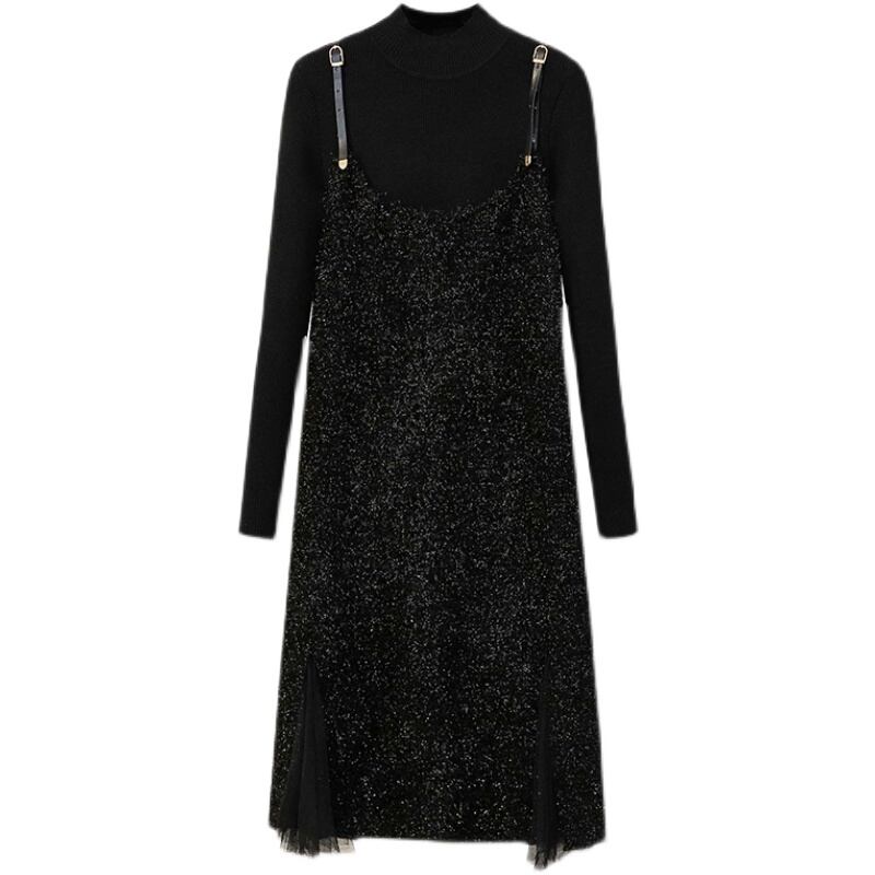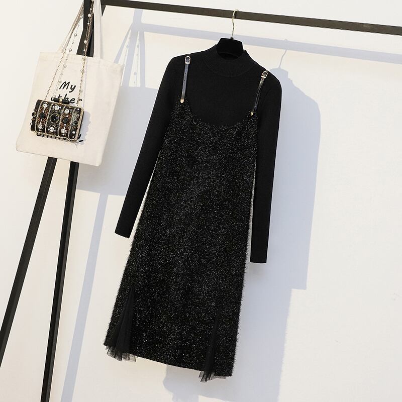 プラスサイズの婦人服 2023 春の新しいファットシスターファッションソリッドカラーのニットウェア年齢を減らすサスペンダードレス 2 点セット 大きめサイズ スプリング 春物 8884161810053088