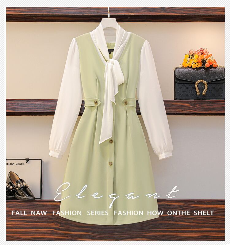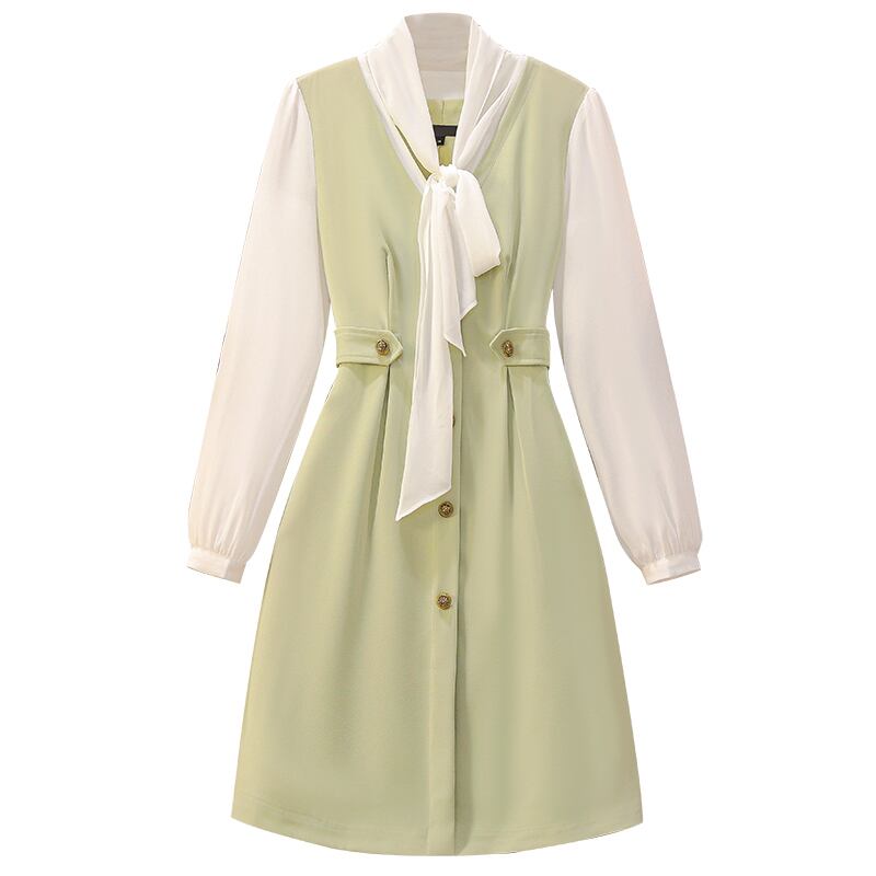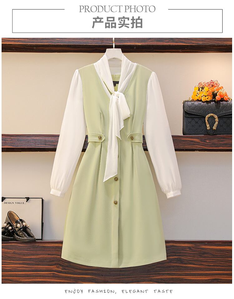 プラスサイズの婦人服 2023 春の新しい太った姉妹フランスの弓 v ネック薄い偽のツーピースのファッションドレス リボン 大きめサイズ スプリング 春物 Vネック 8884122579952759