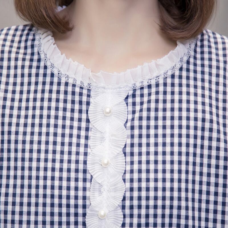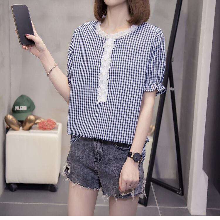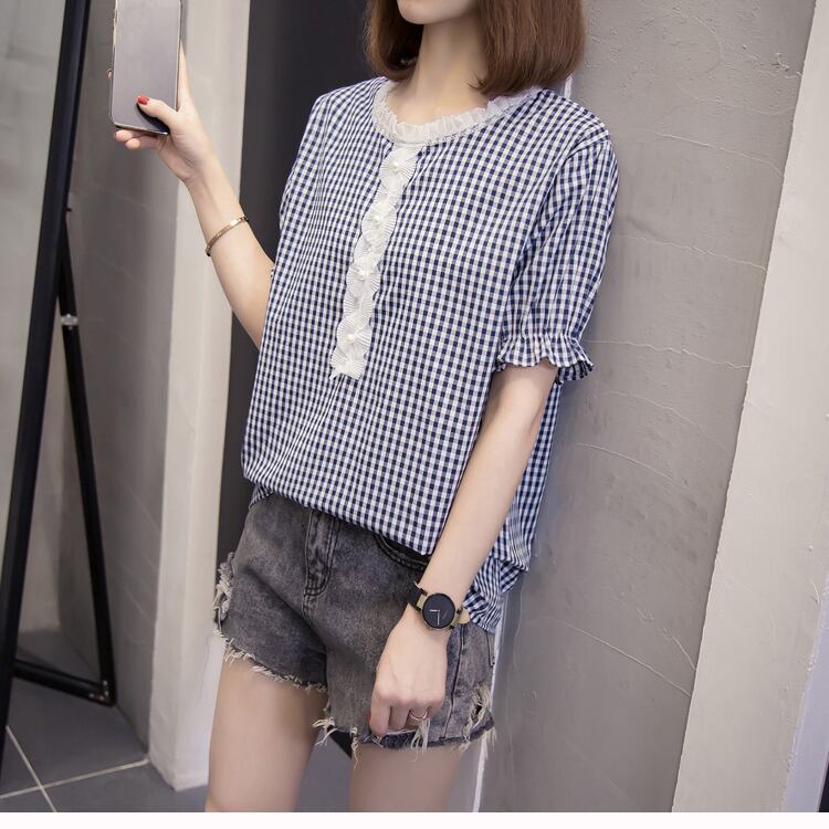 プラスサイズの婦人服 2023 夏新脂肪姉妹シックなシフォンルースレースステッチチェック柄半袖シャツ女性 大きめサイズ サマー 夏物 8884155453141313