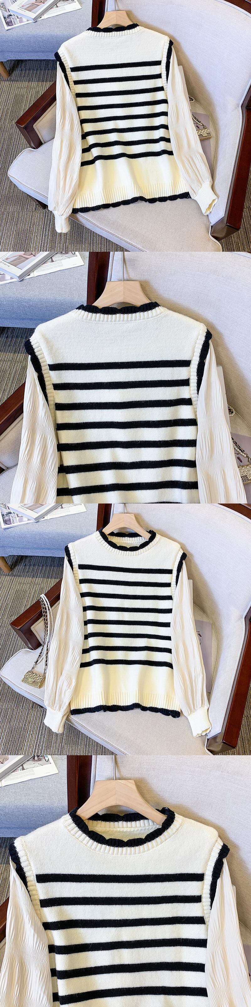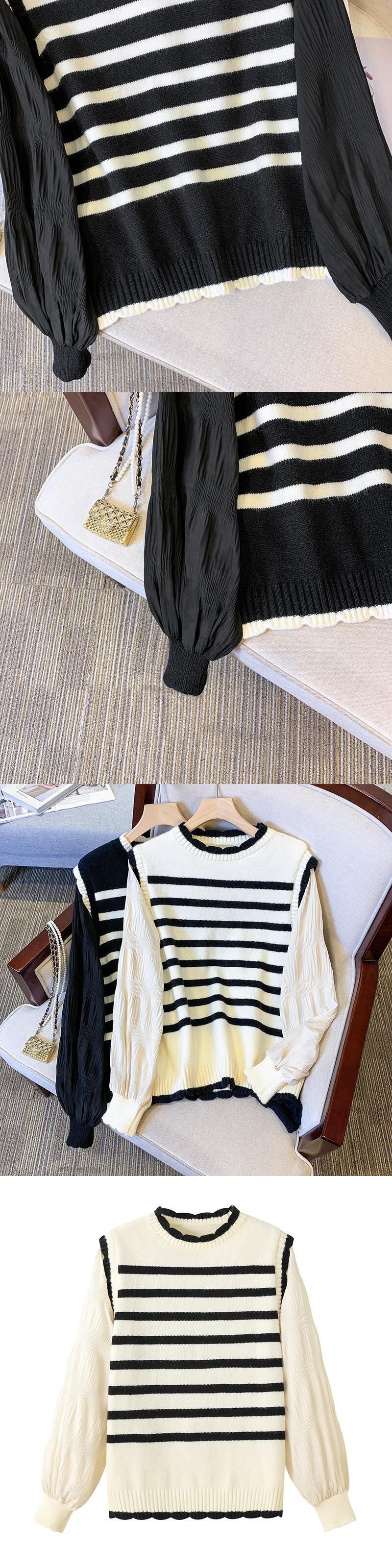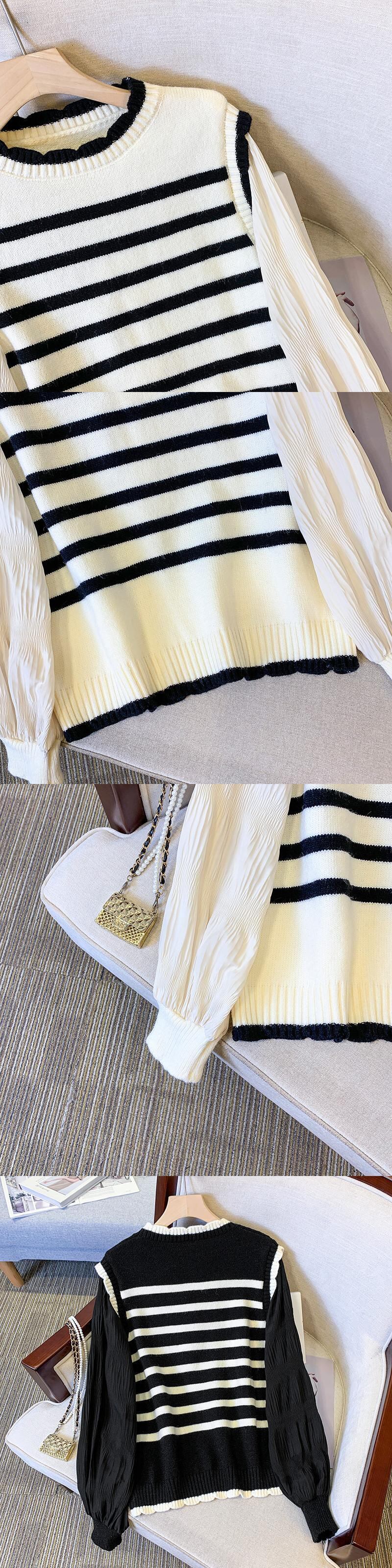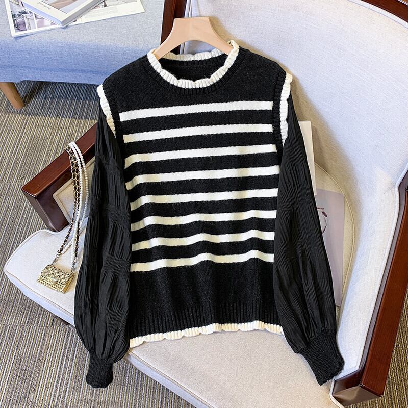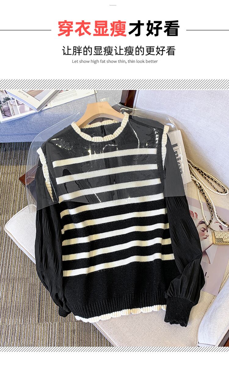 プラスサイズの婦人服 2023 春服脂肪姉妹新しいフレンチストライプ偽のツーピースニットセーターパフスリーブ女性 大きめサイズ スプリング 春物 8884156406550458