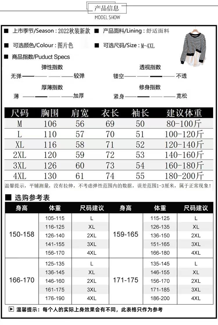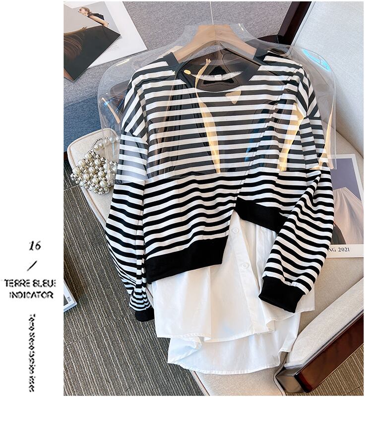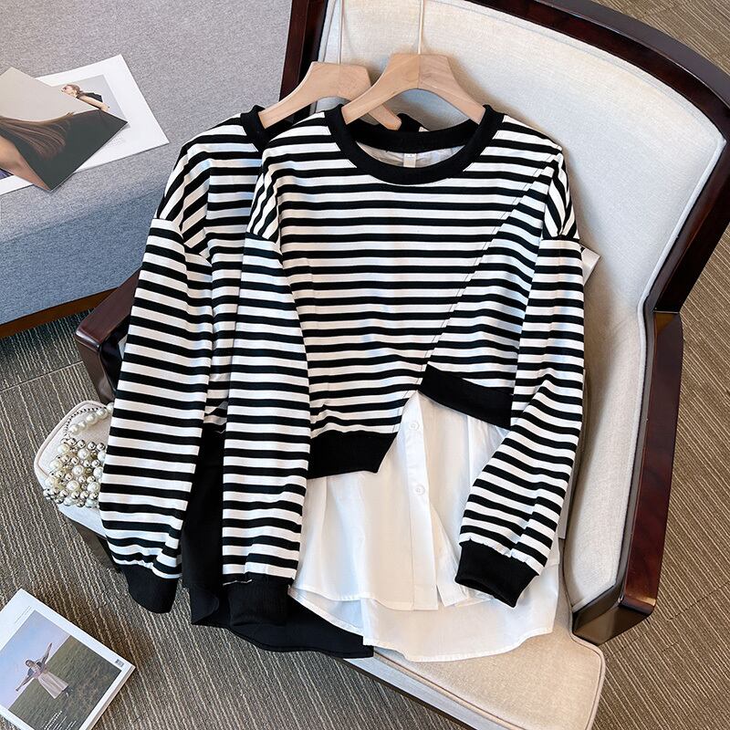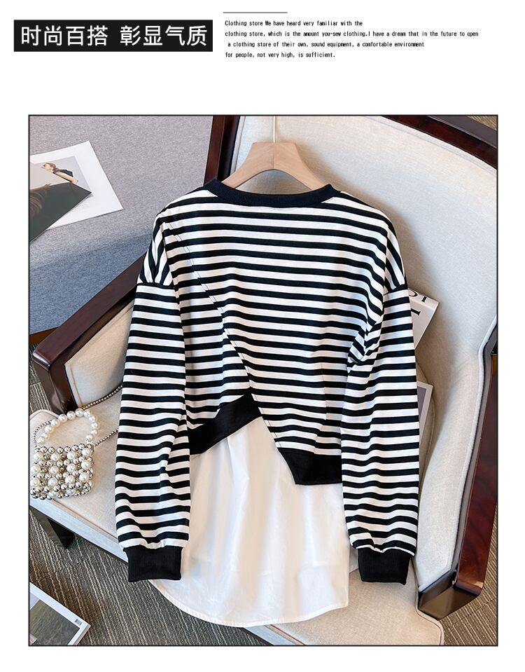 プラスサイズの婦人服 2023 春服脂肪姉妹新しいストライプ偽ツーピースルーズセーターデザインスプライシングトップ 大きめサイズ スプリング 春物 8884189428451565