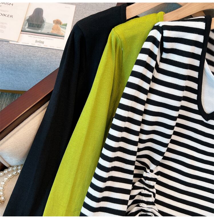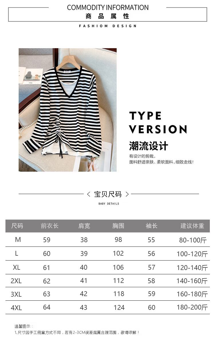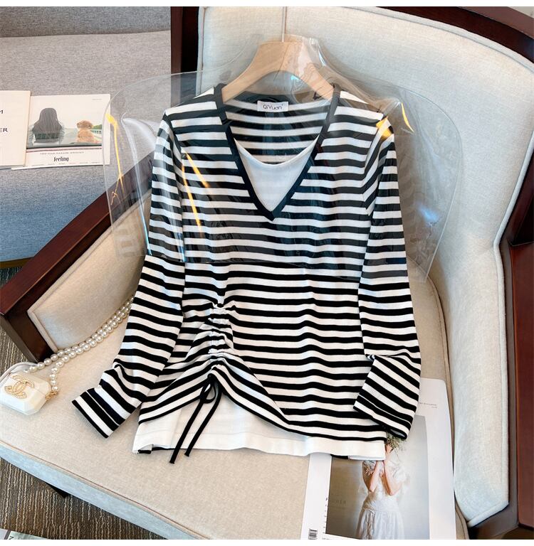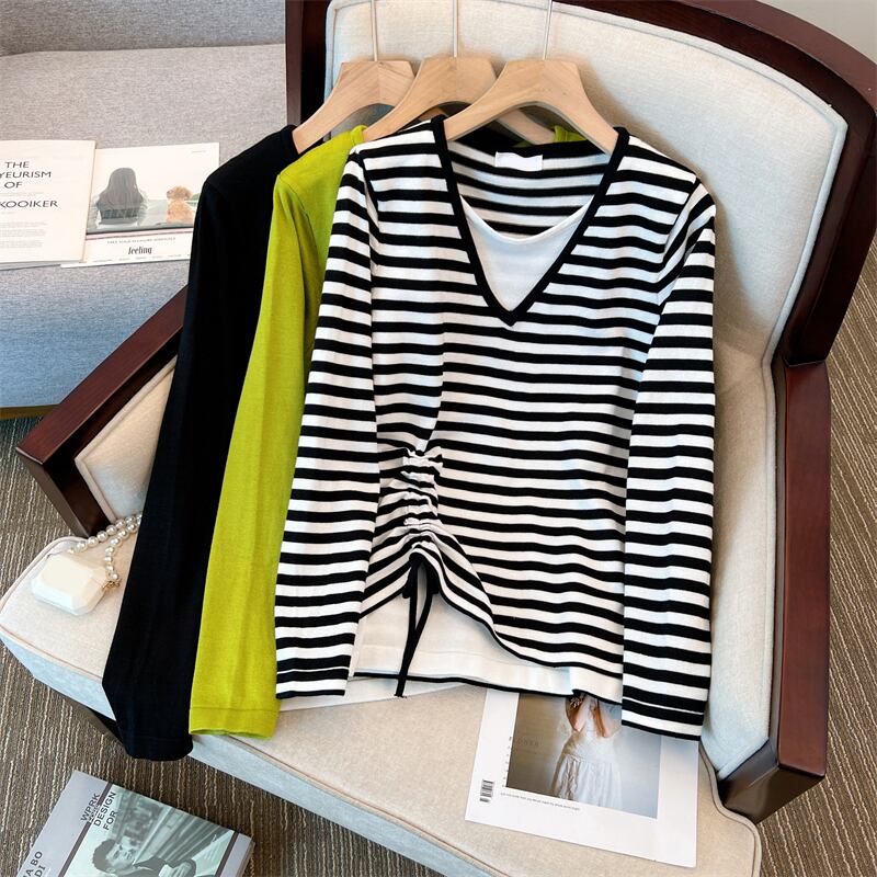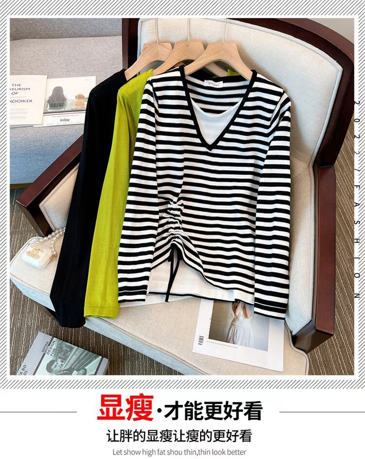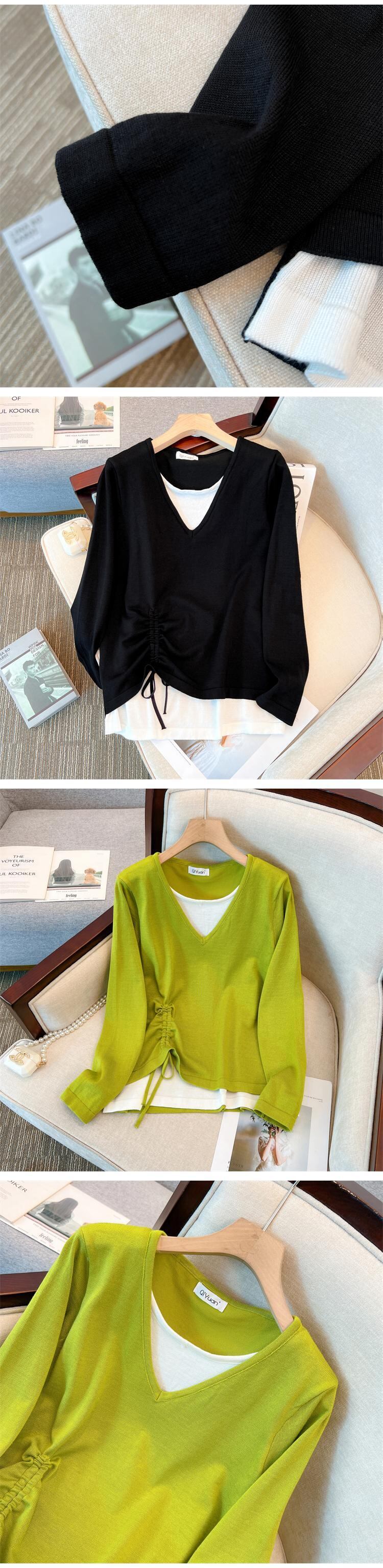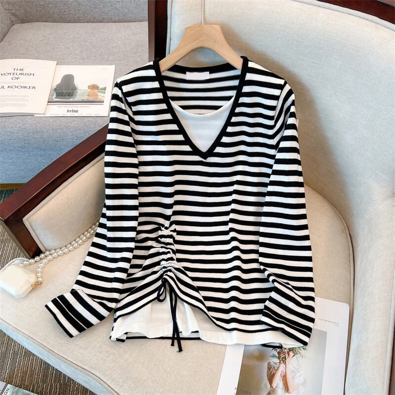 大きいサイズの婦人服 2023 春の新しいゆるいコントラスト カラー V ネック ドローストリング スリム フェイク ツーピース ニット トップ 大きめサイズ スプリング 春物 Vネック 8884113147967454