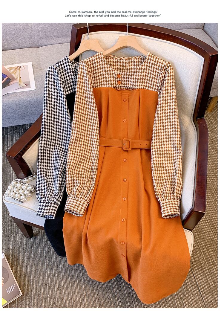 プラスサイズの婦人服 2023 春服脂肪姉妹新しいフレンチティーブレイク薄いチェック柄フェイクツーピース長袖ドレス ロング 大きめサイズ スプリング 春物 8884199254472229