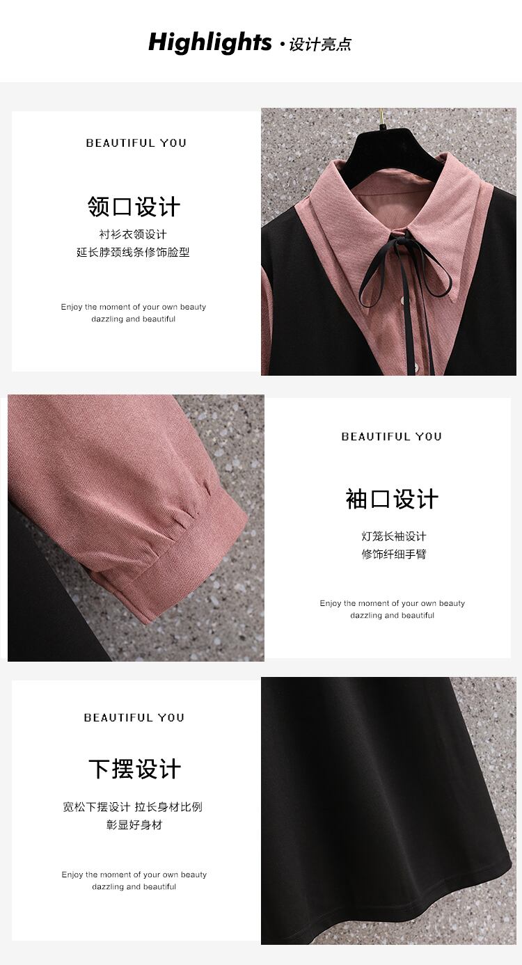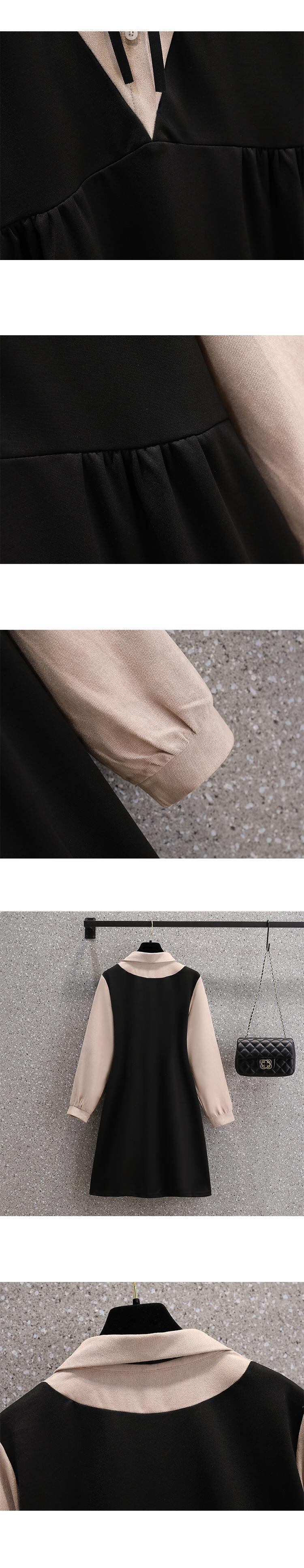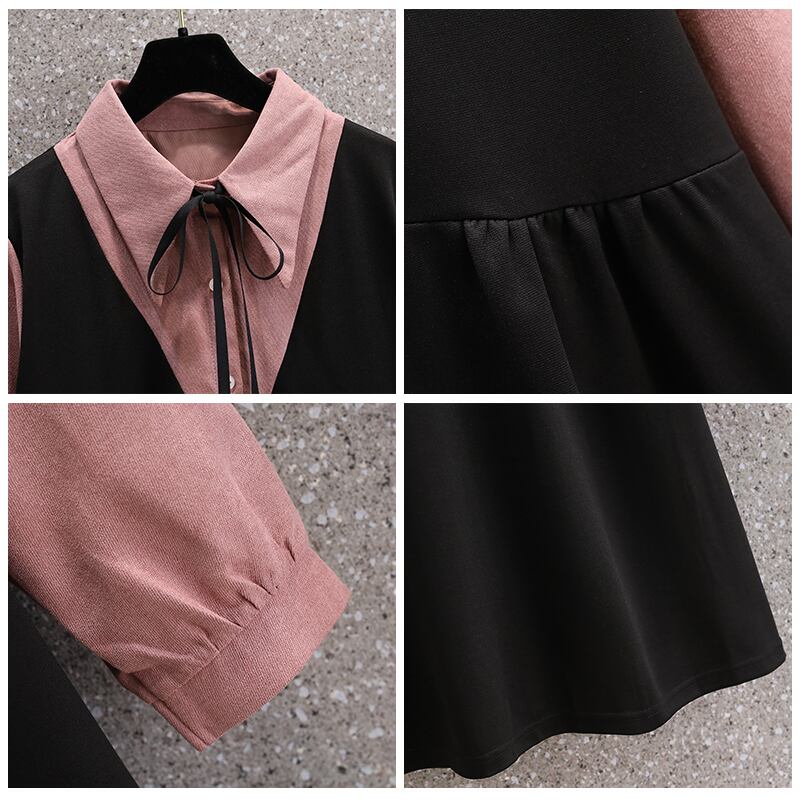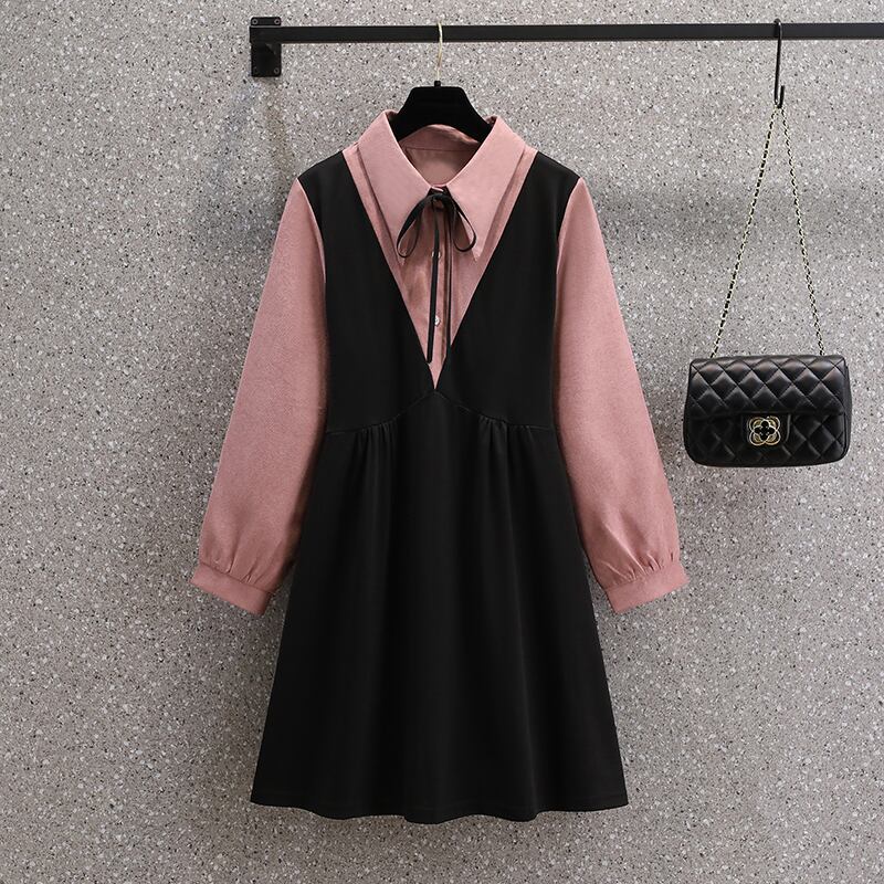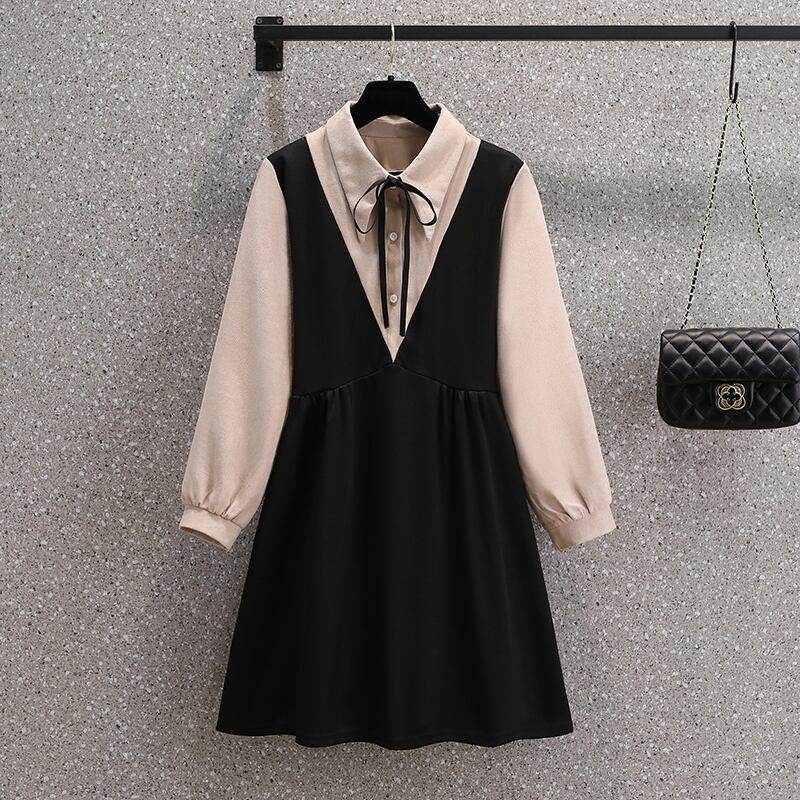 プラスサイズの婦人服 2023 年春の新しいフレンチ スタイルのデザイン センス ニッチ コントラスト カラー 年齢を減らす長袖フェイク ツーピース ドレス ロング 大きめサイズ スプリング 春物 8884130880323434