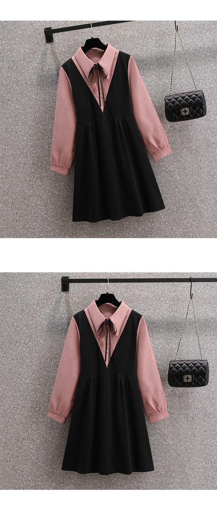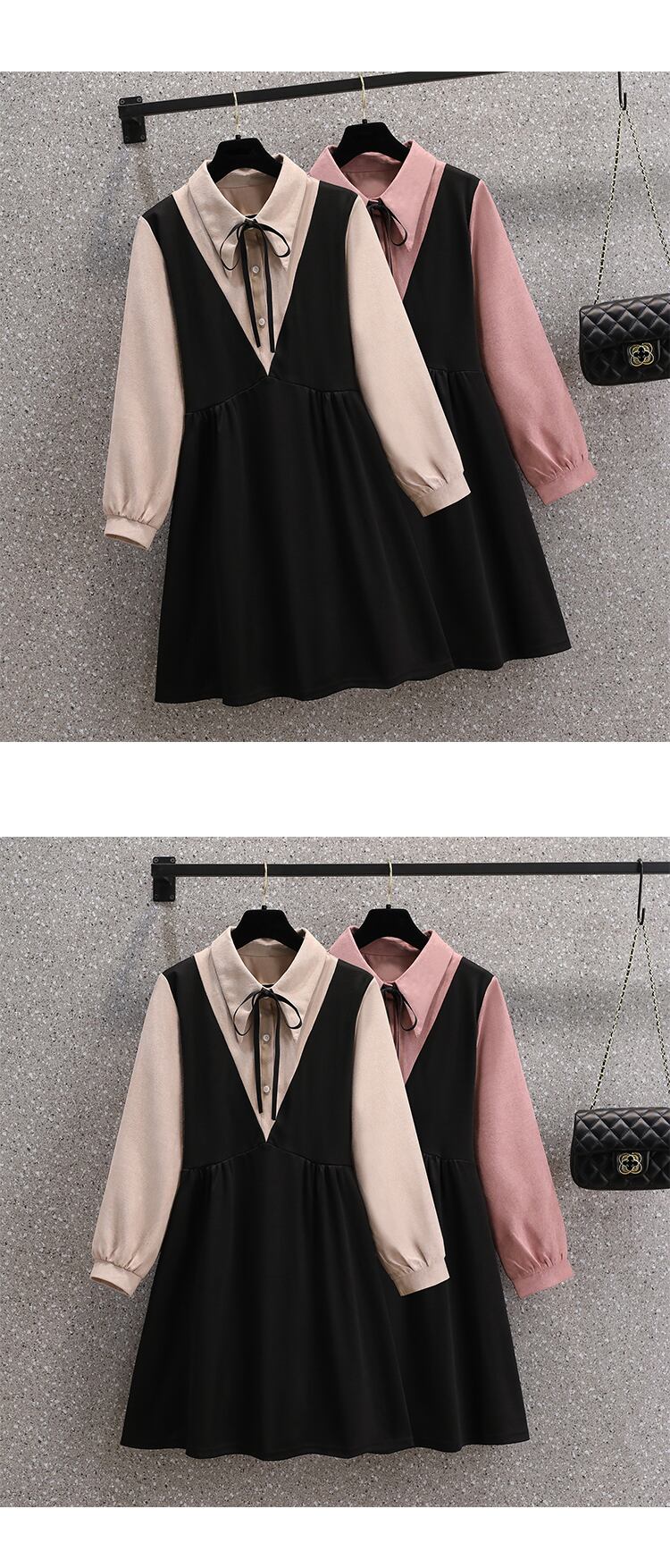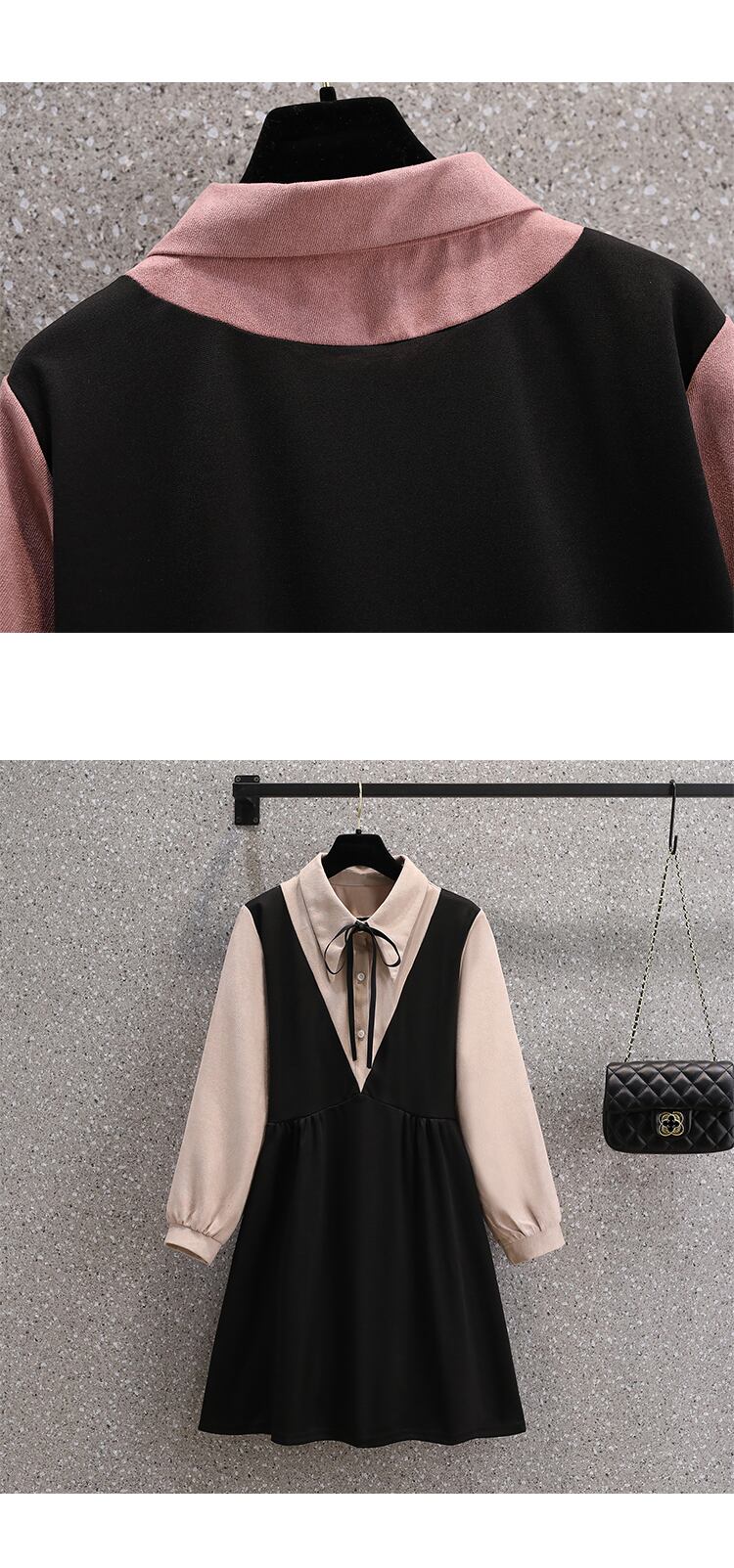 プラスサイズの婦人服 2023 年春の新しいフレンチ スタイルのデザイン センス ニッチ コントラスト カラー 年齢を減らす長袖フェイク ツーピース ドレス ロング 大きめサイズ スプリング 春物 8884130880323434