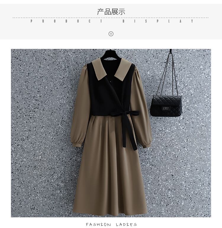 プラスサイズの婦人服 2023 春の新しいファットシスター eign スタイル年齢削減ポロ襟ウエスト痩身コントラストカラードレス女性 大きめサイズ スプリング 春物 8884135865652187