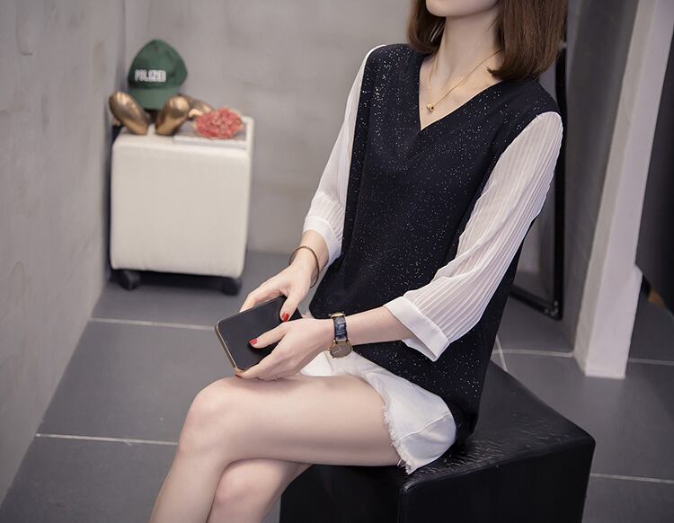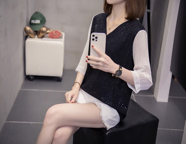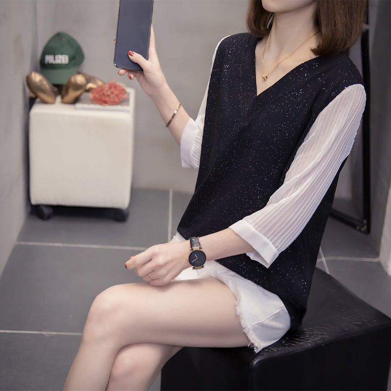 プラスサイズの婦人服 2023 夏の新しいファットシスタールーズシックなスプライシングデザインセンス七分袖腹カバートップ 大きめサイズ サマー 夏物 8884150351922510