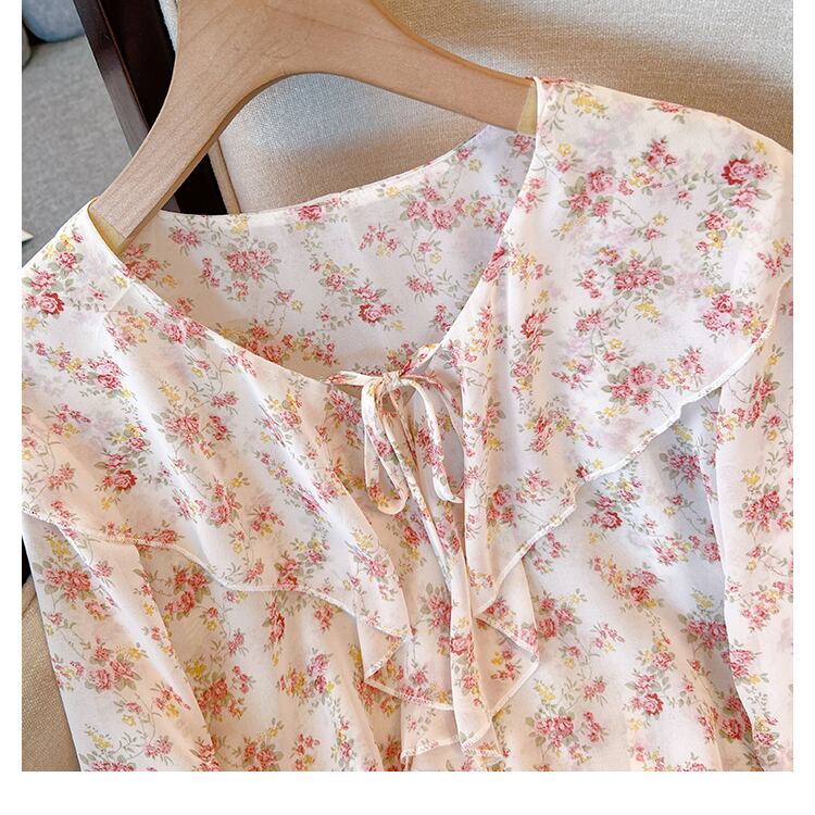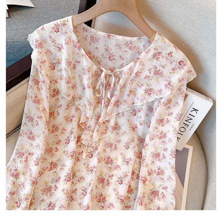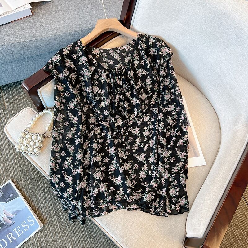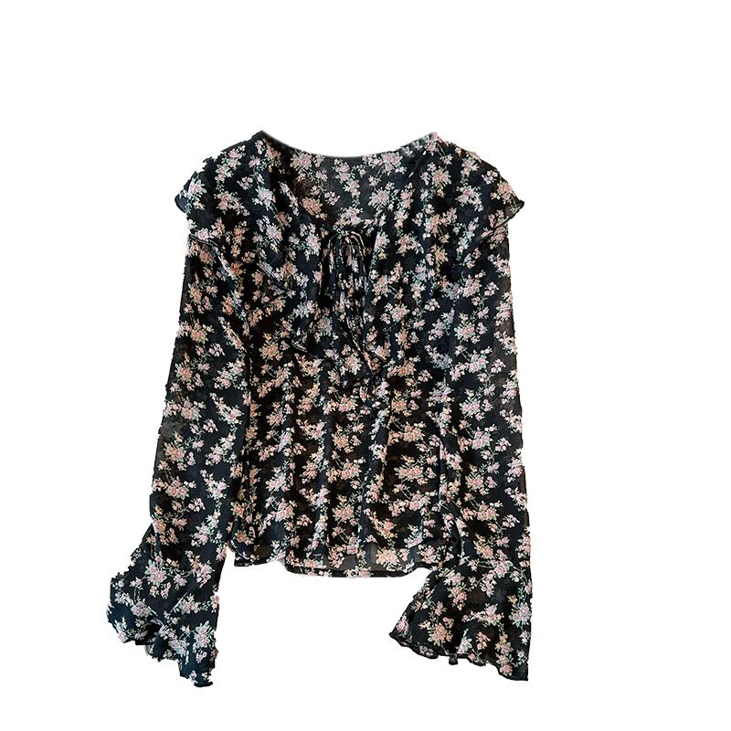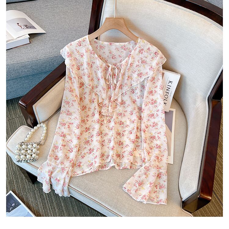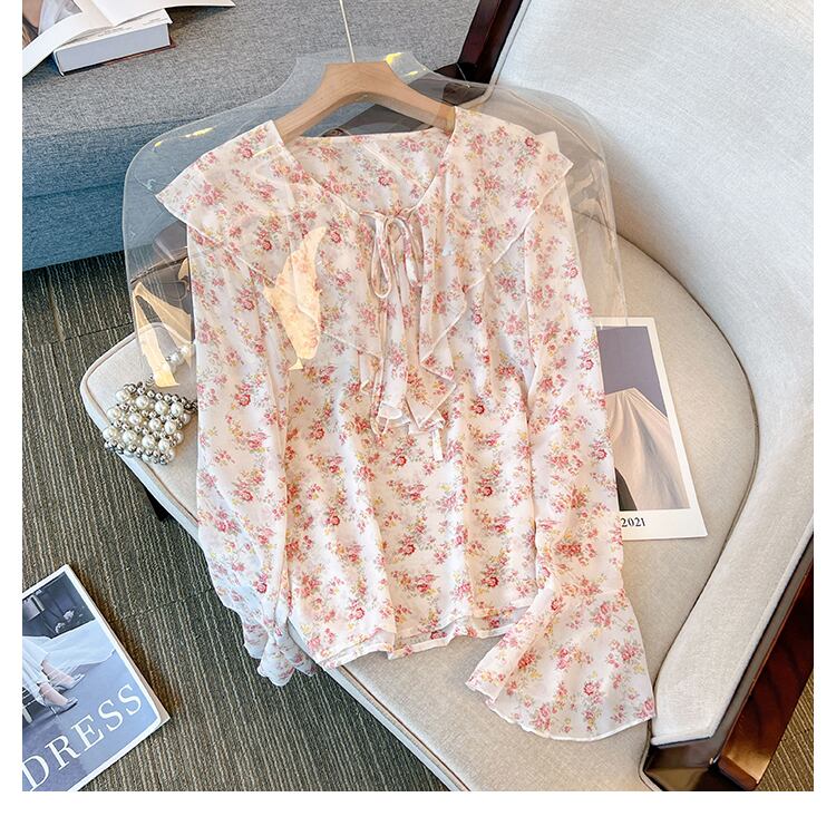 プラスサイズの婦人服 2023 春の新しいスタイルのファットシスターカジュアル花柄シフォン eign スタイルフリル長袖シャツ女性 ロング 大きめサイズ スプリング 春物 888411037645349