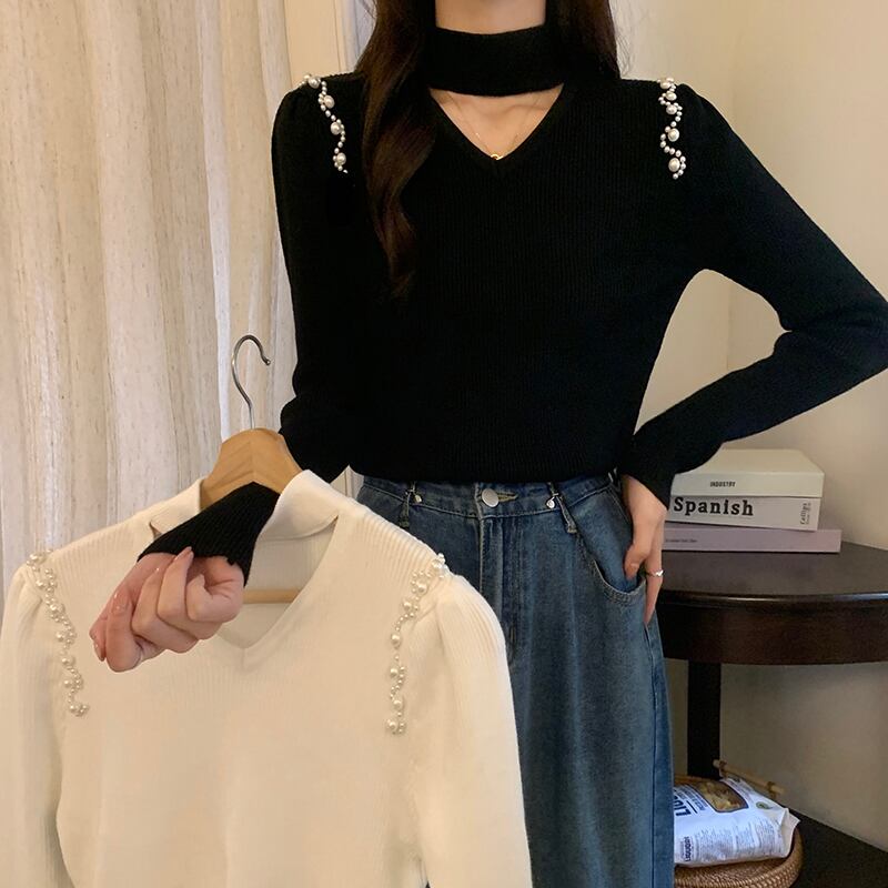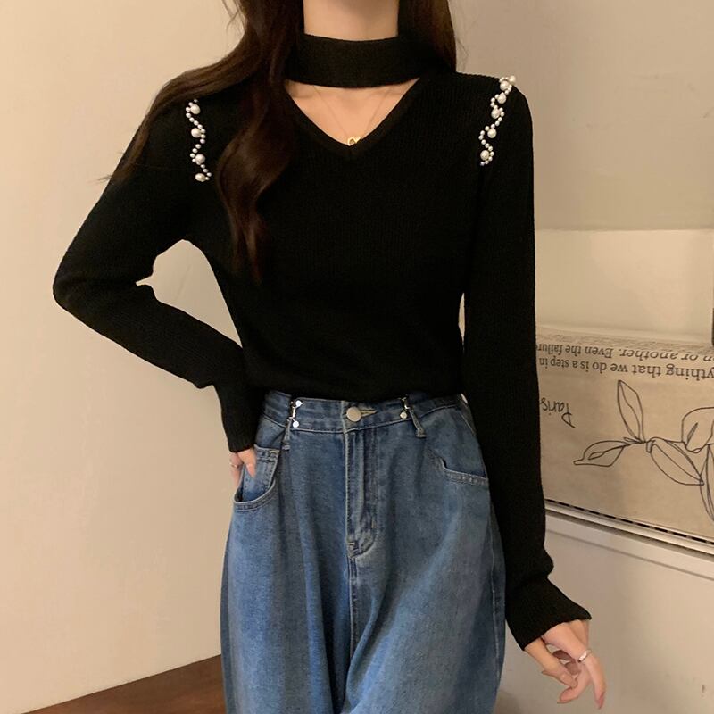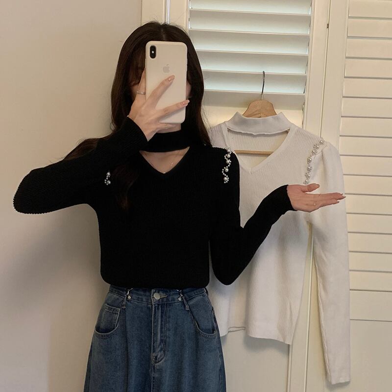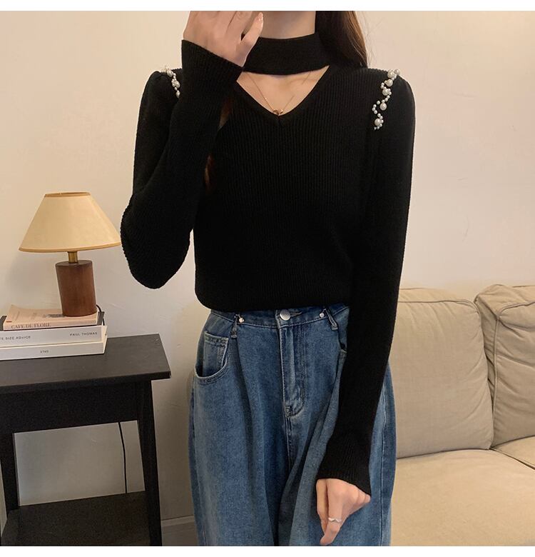 プラスサイズの婦人服 2023 ファットシスター春の新オールマッチビーズハンギングネックニットトップ痩身ボトミングセーター 大きめサイズ スプリング 春物 8884166940623788