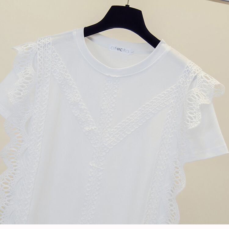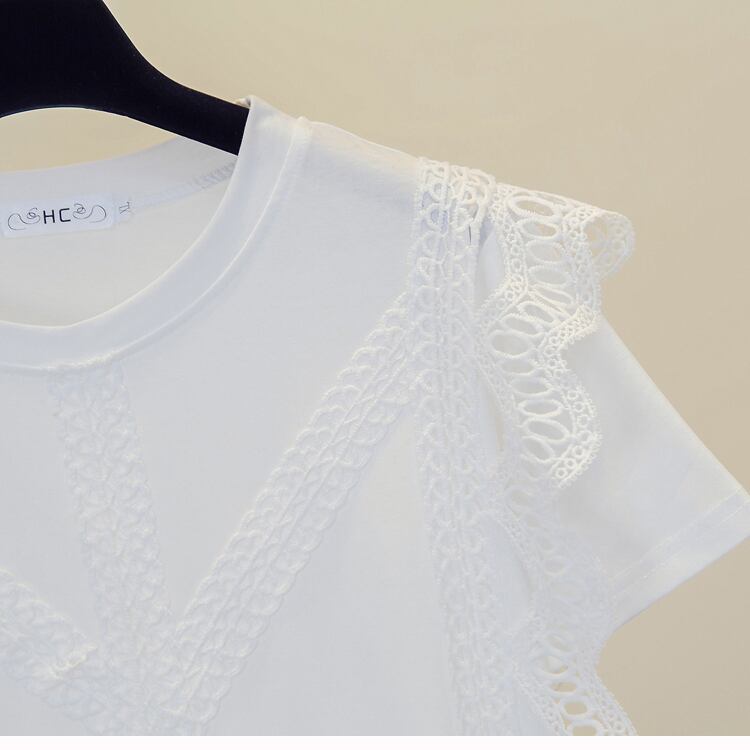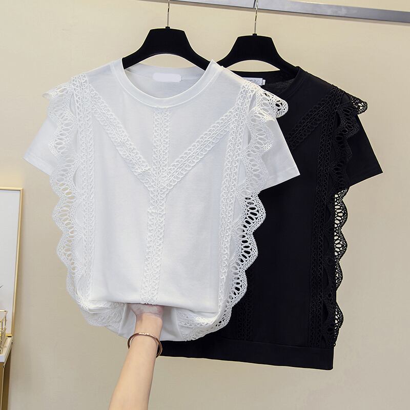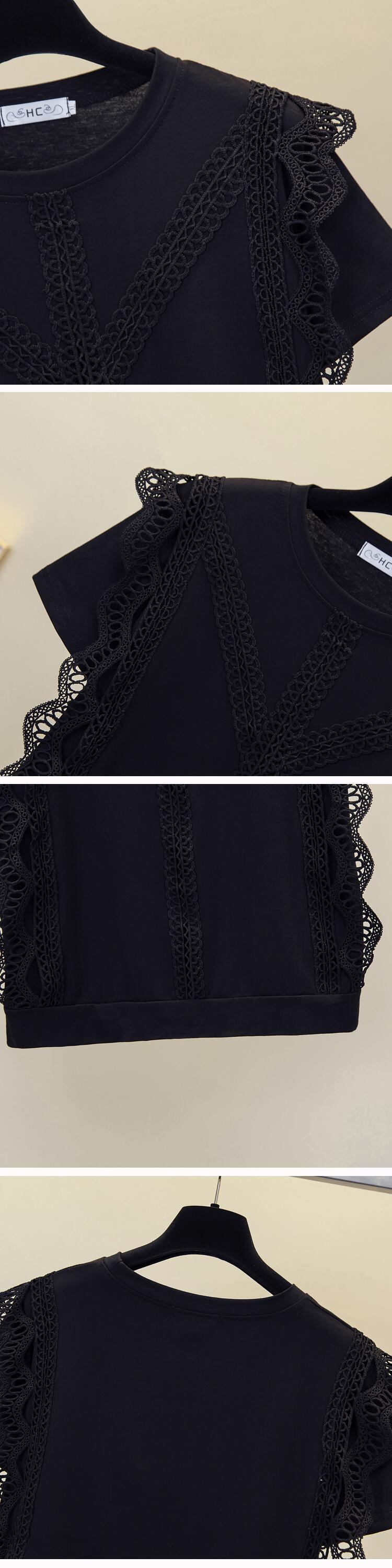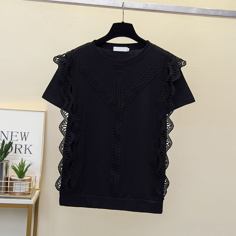 プラスサイズの婦人服 2023 夏の新しいファットシスター気質緩い eign スタイルオールマッチレースステッチ半袖 Tシャツ女性 大きめサイズ サマー 夏物 8884190119219328