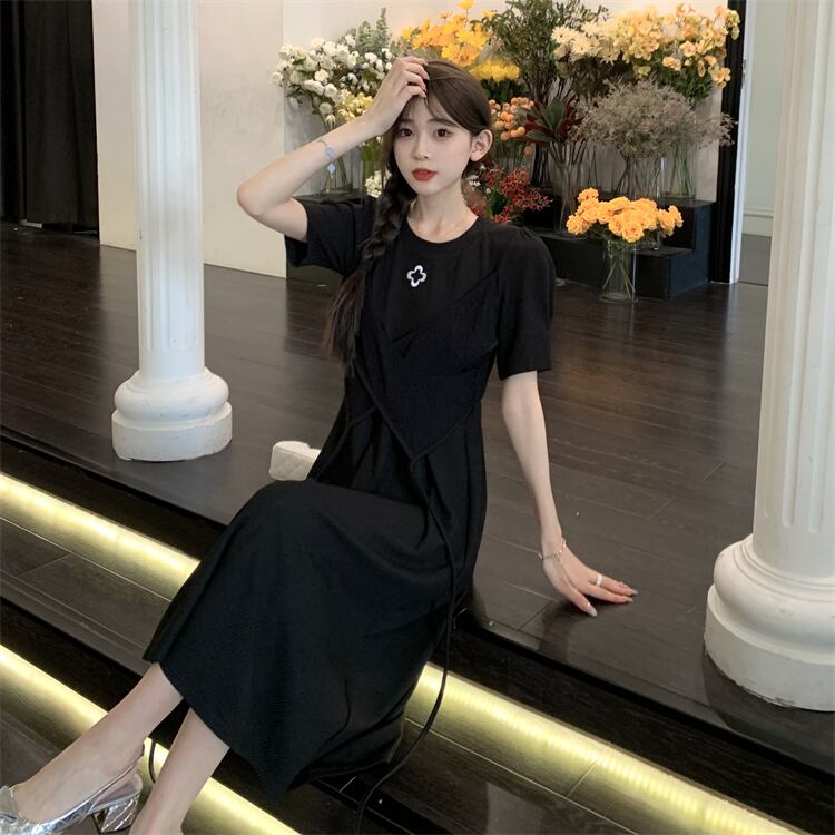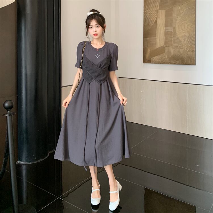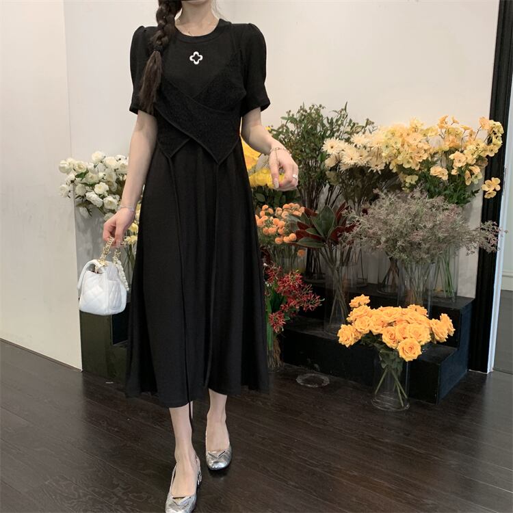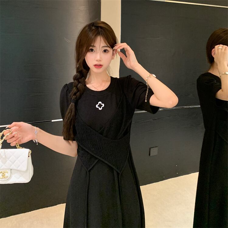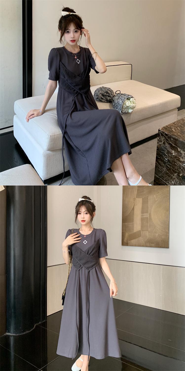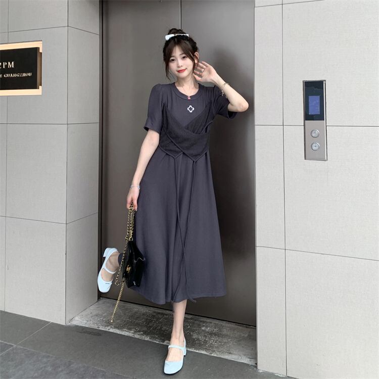 プラスサイズの婦人服 2023 ファットシスター夏の新しいフレンチ刺繍ウエストフェイクツーピース薄い半袖ドレス 大きめサイズ サマー 夏物 8884161854040391