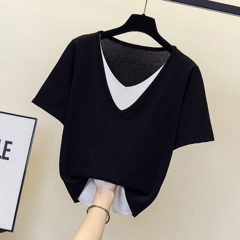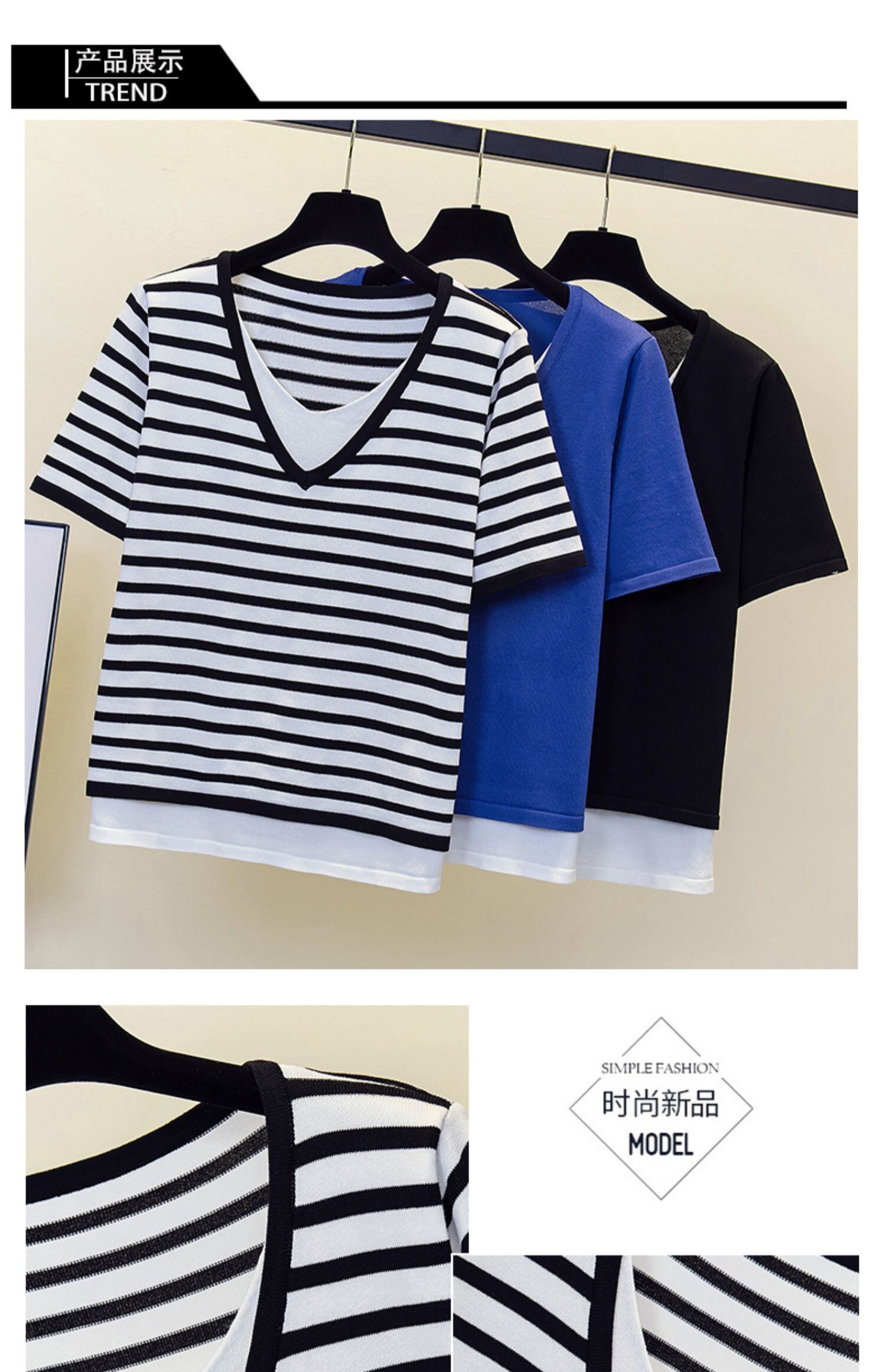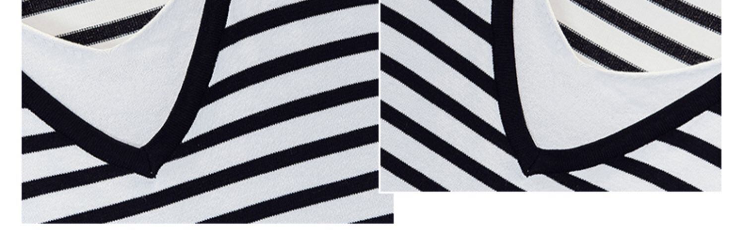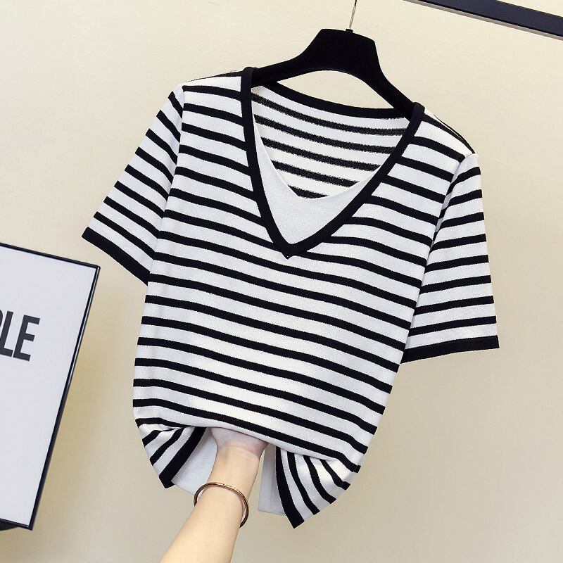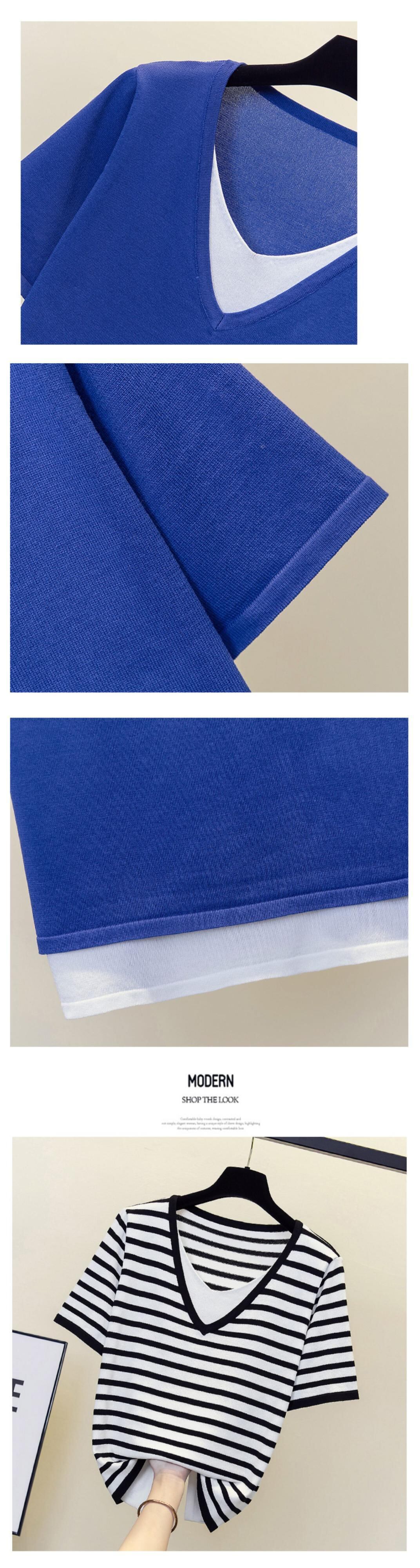 プラスサイズの婦人服 2023 夏の新しいファット シスター オールマッチ スプライシング フェイク ツーピース デザイン ストライプ ベリーカバー Tシャツ 大きめサイズ サマー 夏物 8884116915880310