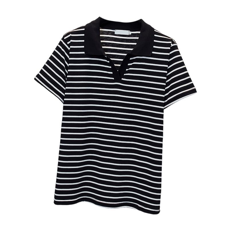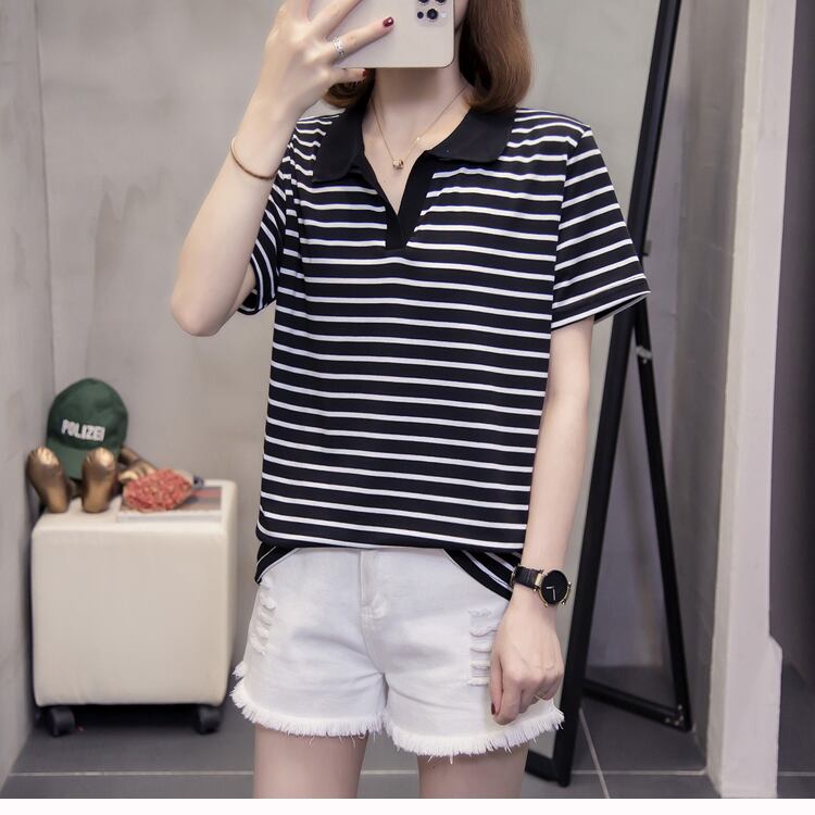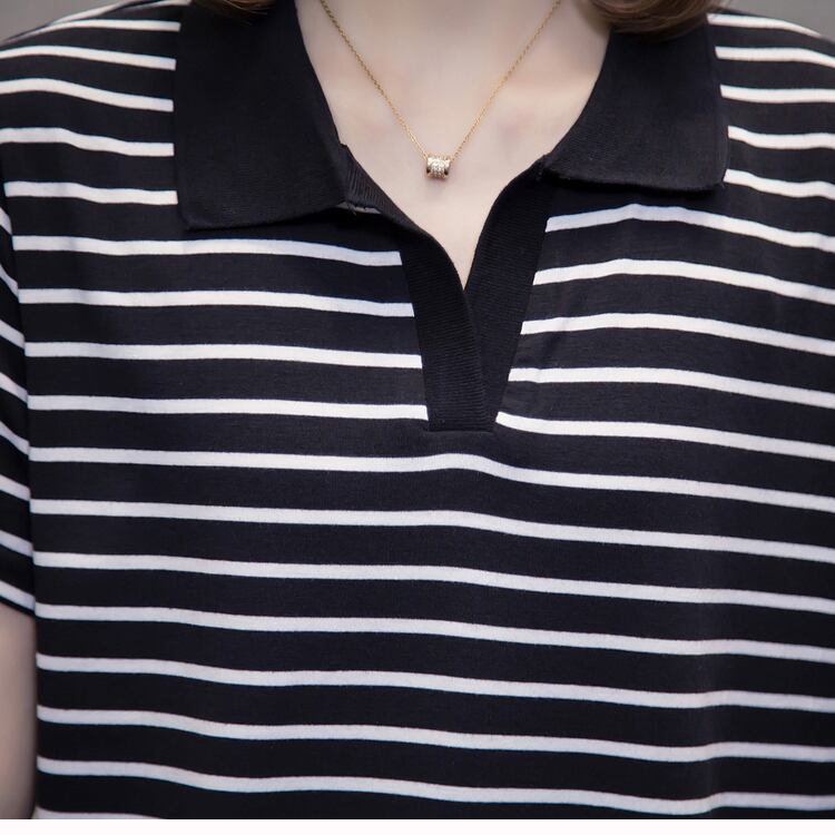 プラスサイズの婦人服2023夏の新しいファットシスタールーズで薄いオールマッチラペルストライプ半袖気質Tシャツ 大きめサイズ サマー 夏物 8884170014403585