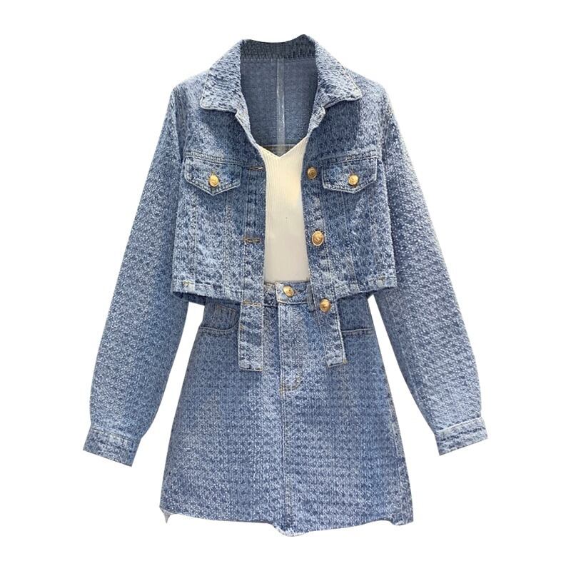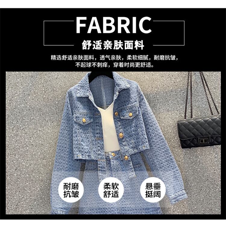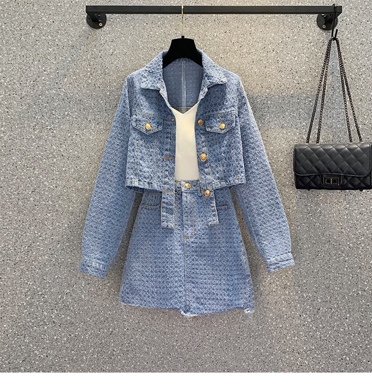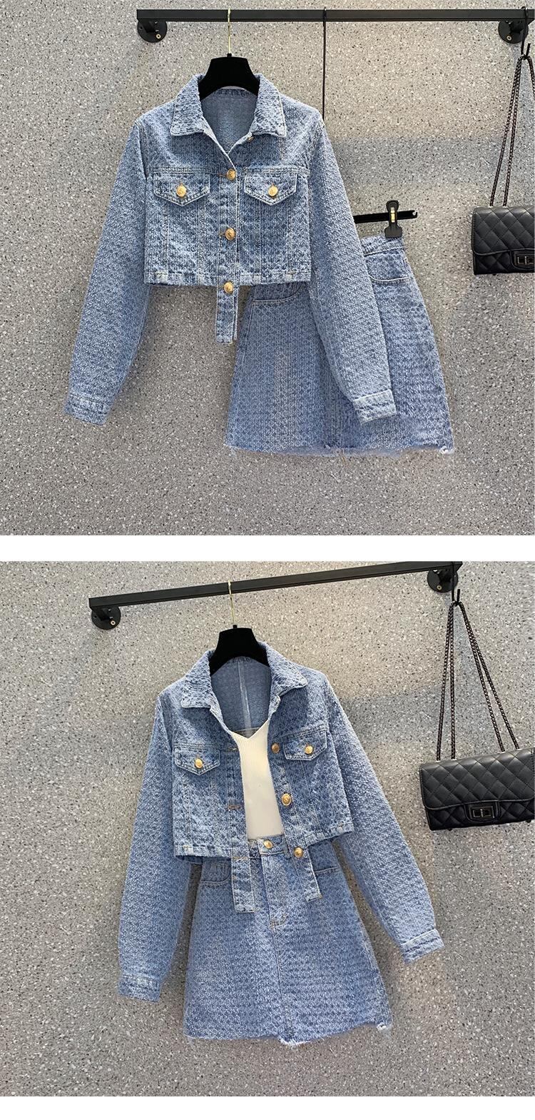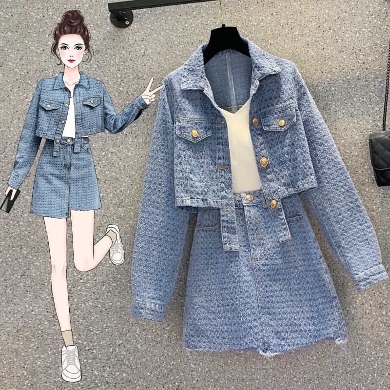 大きいサイズの婦人服 2023 トレンディな女性の春の新しいファット シスター不規則な長袖デニム ジャケット スカート ツーピース スーツ ロング 大きめサイズ スプリング 春物 8884193312740409