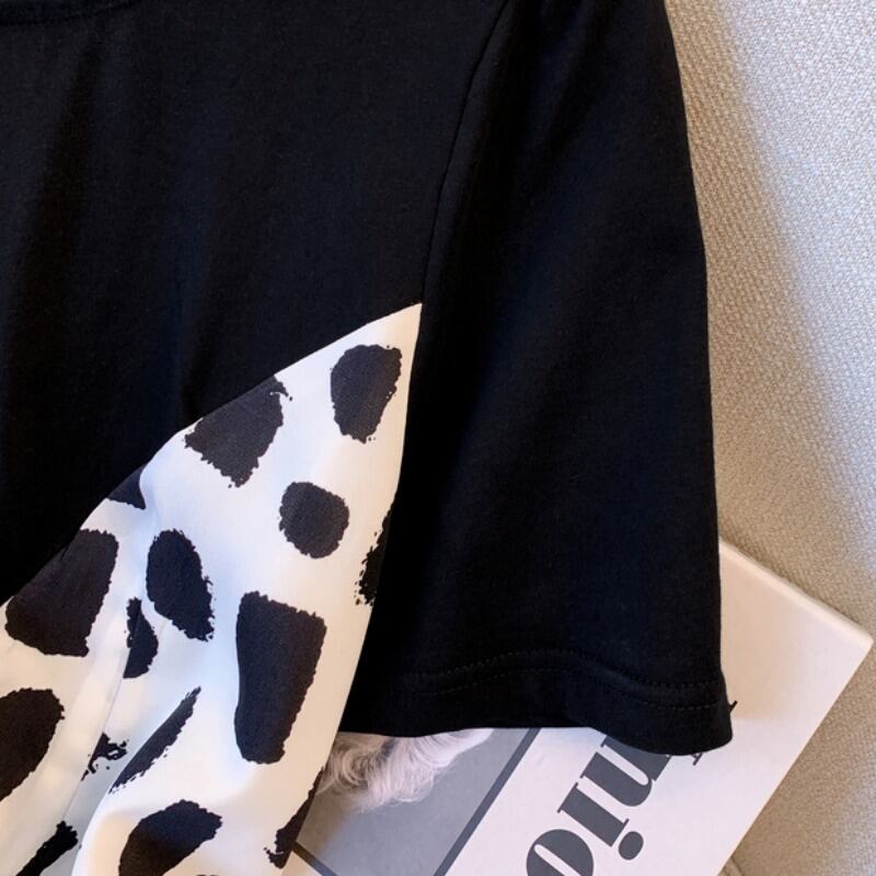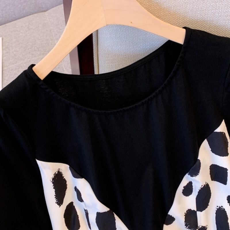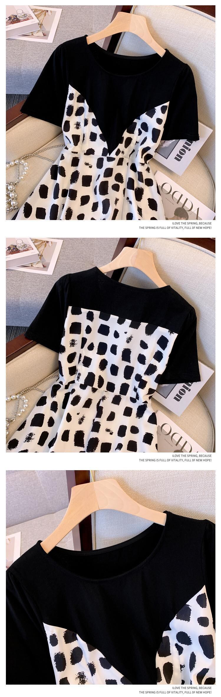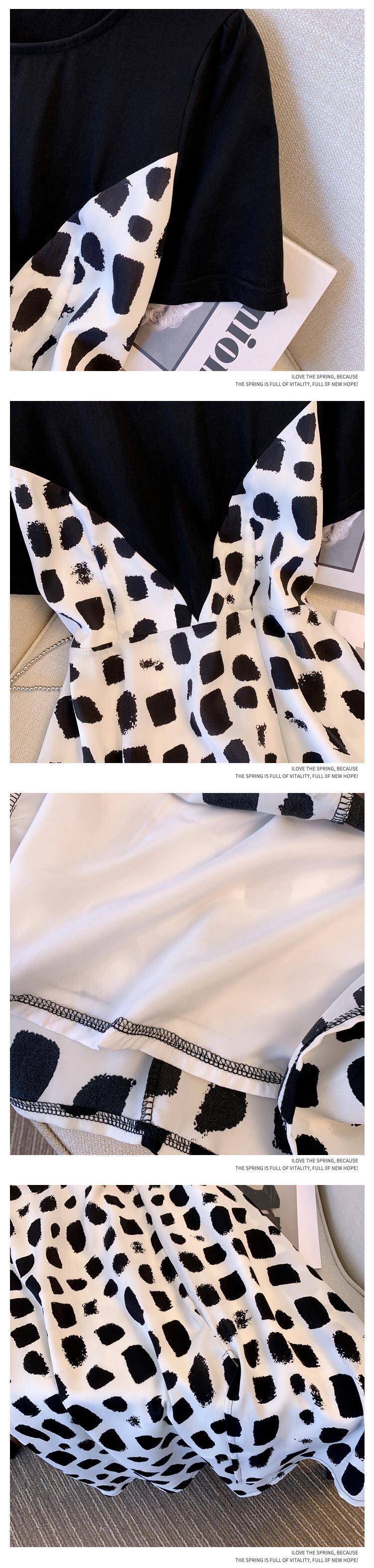 プラスサイズの婦人服 2023 夏の新しいファットシスターデザインセンスウエストフレンチフェイクツーピースラウンドネックドレス女性 大きめサイズ サマー 夏物 Oネック 8884177725408163