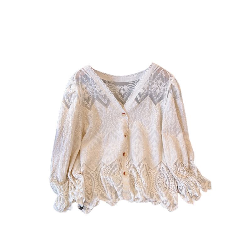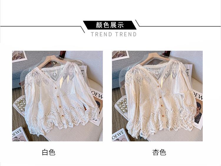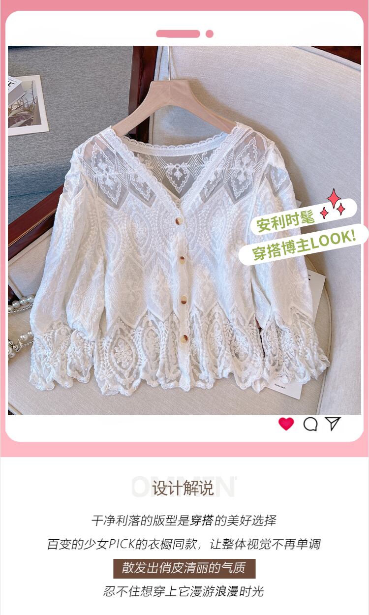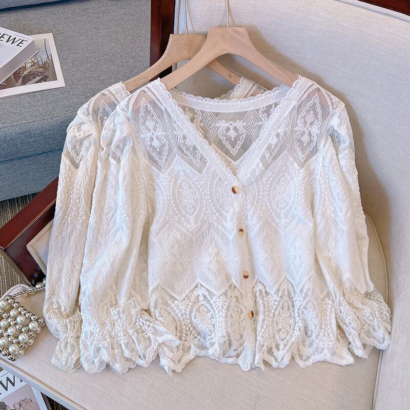 プラスサイズの婦人服 2023 ファットシスター春の新フレンチスタイル甘い九分袖シャツ気質フックフラワーショートレースシャツ 大きめサイズ 大人ガーリー スウィート キュート カジュアル スプリング 春物 フラワーデザイン 8884136612591669