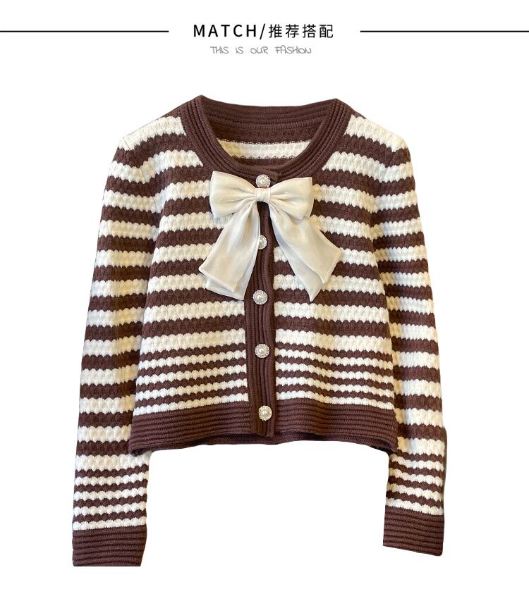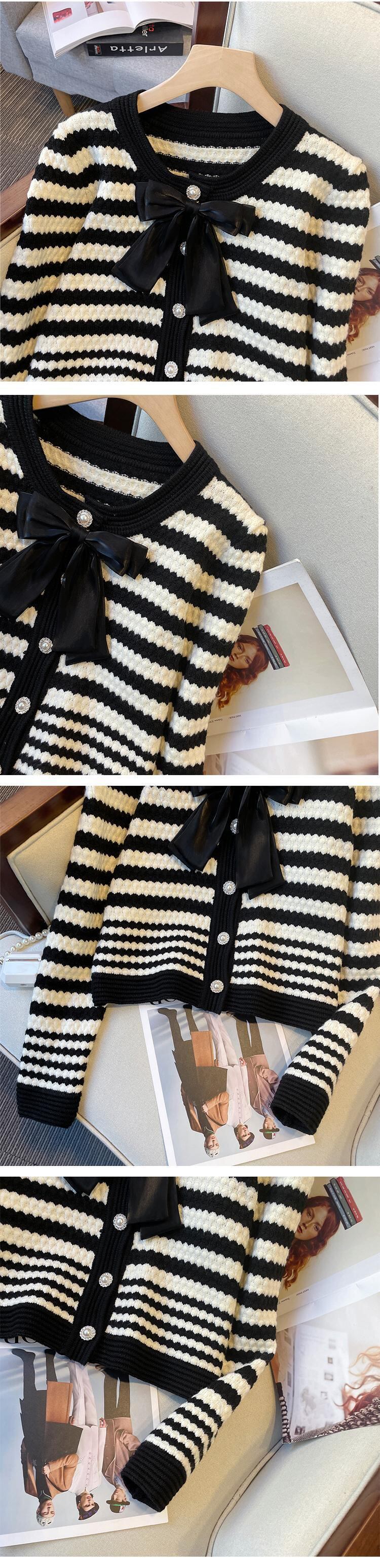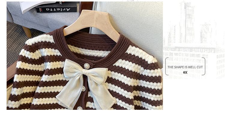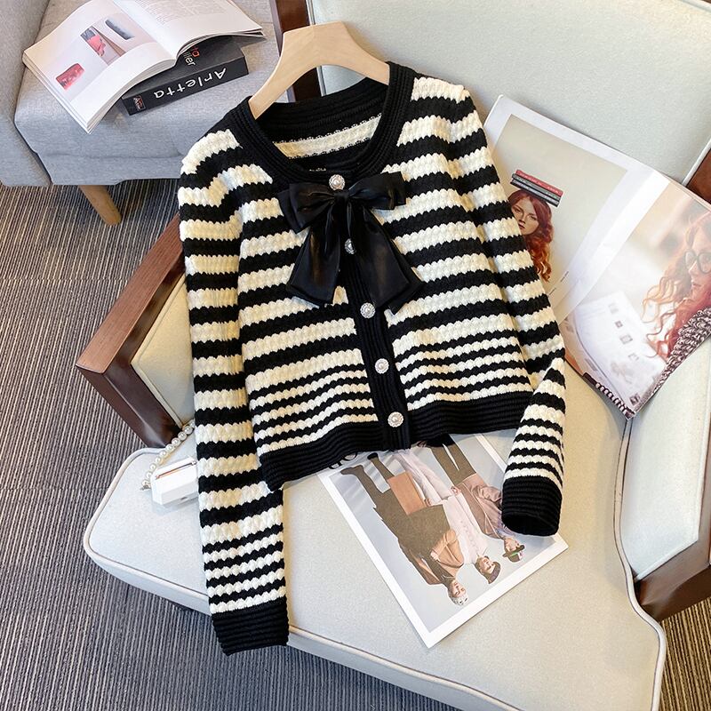プラスサイズの婦人服 2023 脂肪姉妹春の新痩身ストライプちょう結びカーディガンニットトップ女性 リボン 大きめサイズ スプリング 春物 8884132460354161