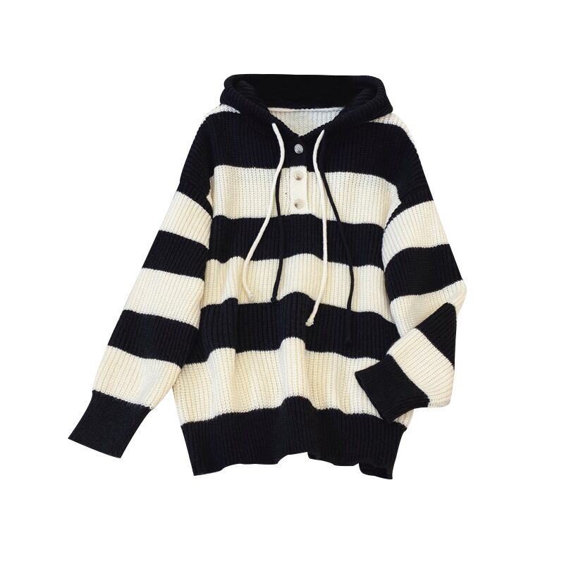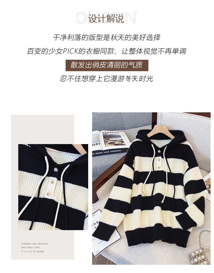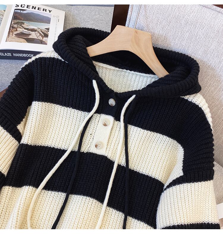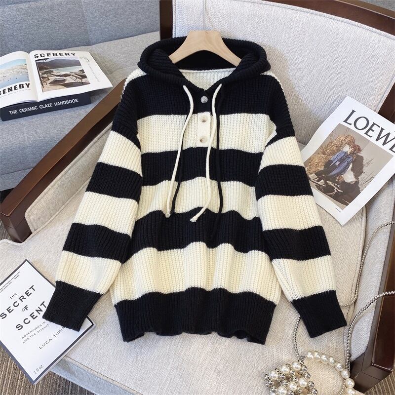 プラスサイズの婦人服2023ファットシスター春の新しいファッションルーズで薄いオールマッチニットセーターストライプフード付きセーター 大きめサイズ スプリング 春物 8884165471994904