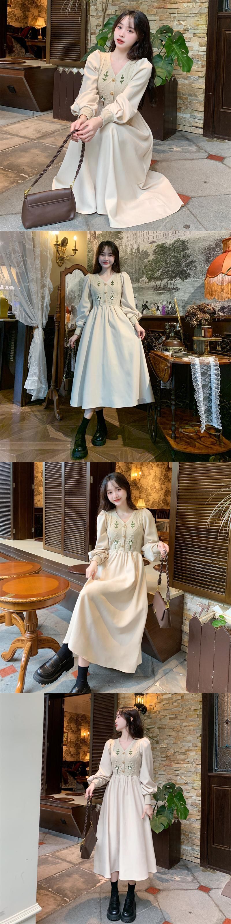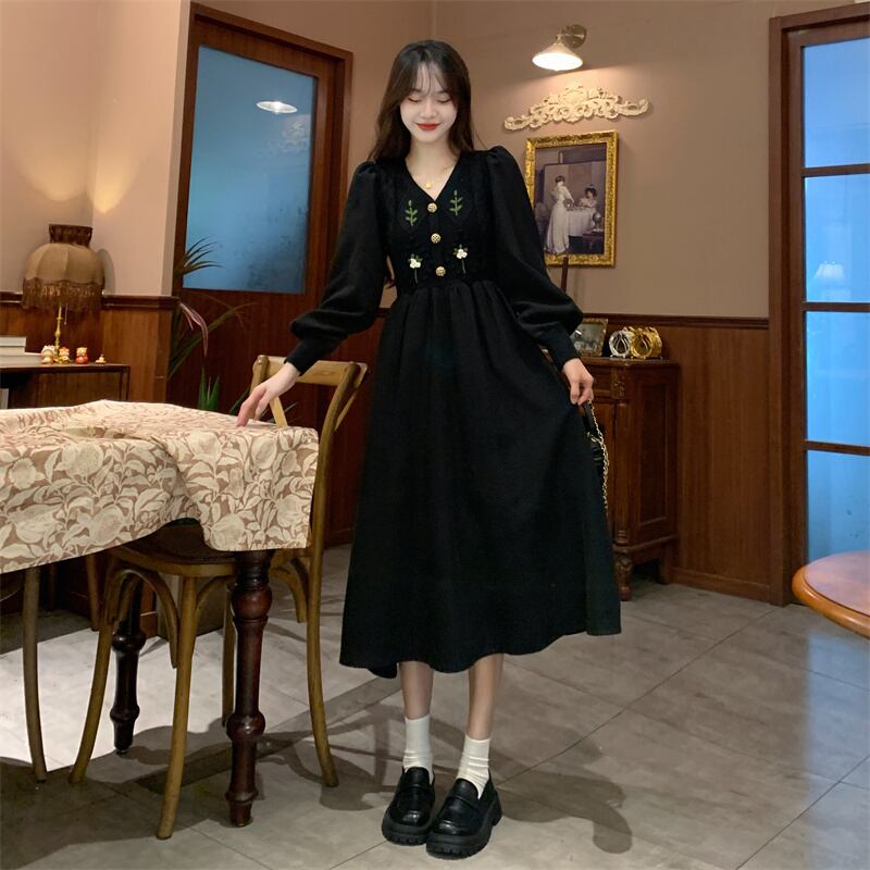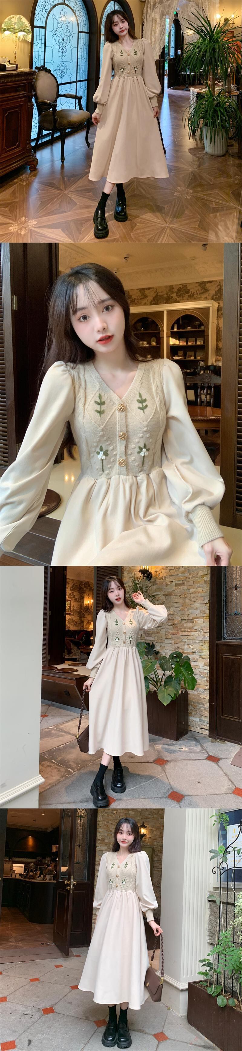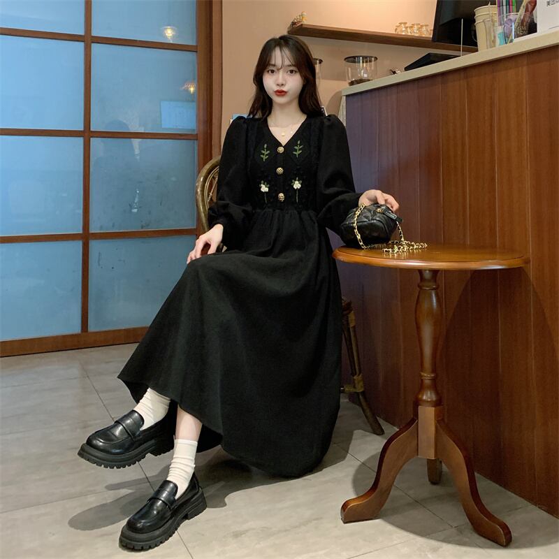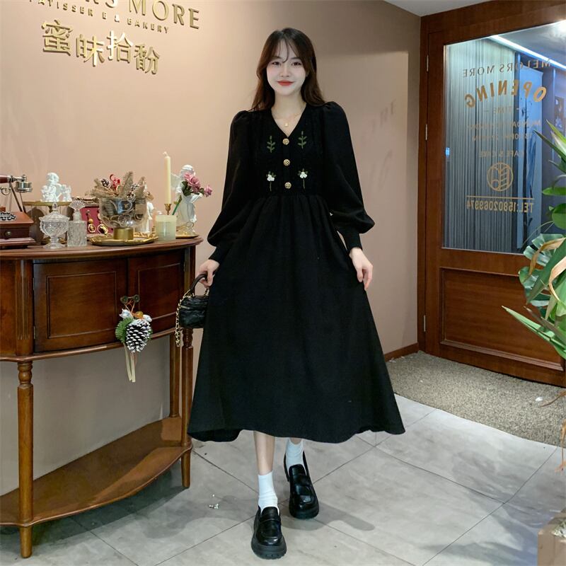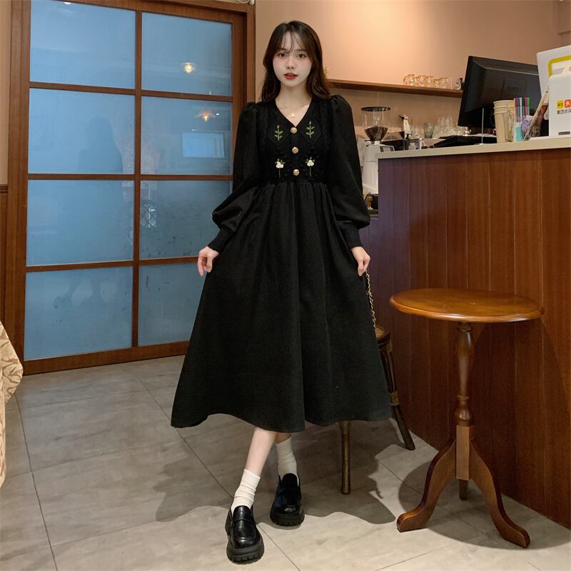 プラスサイズの婦人服 2023 ファットシスター春の新気質 v ネック刺繍ニットツイストコーデュロイドレス 大きめサイズ スプリング 春物 Vネック 8884130478009428