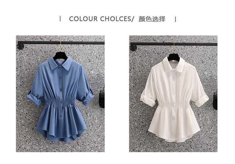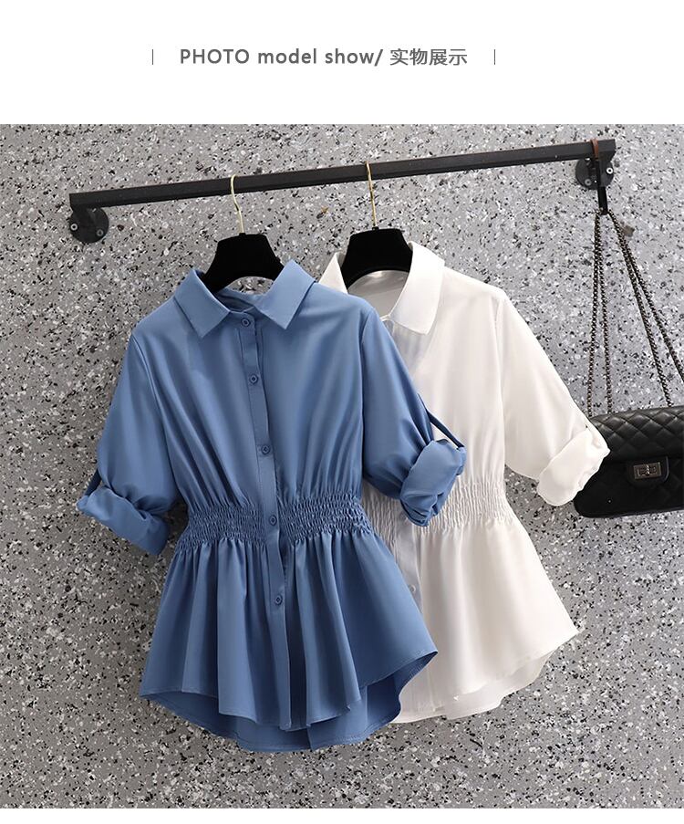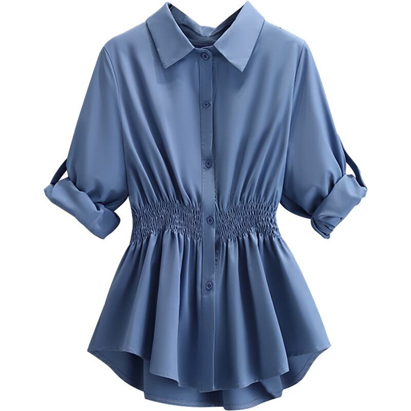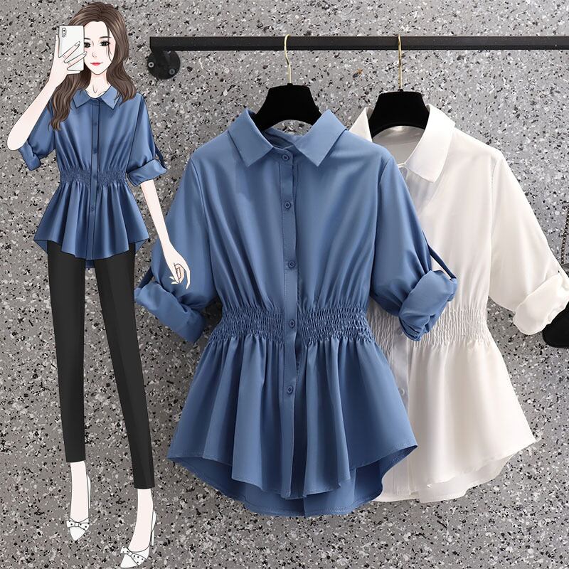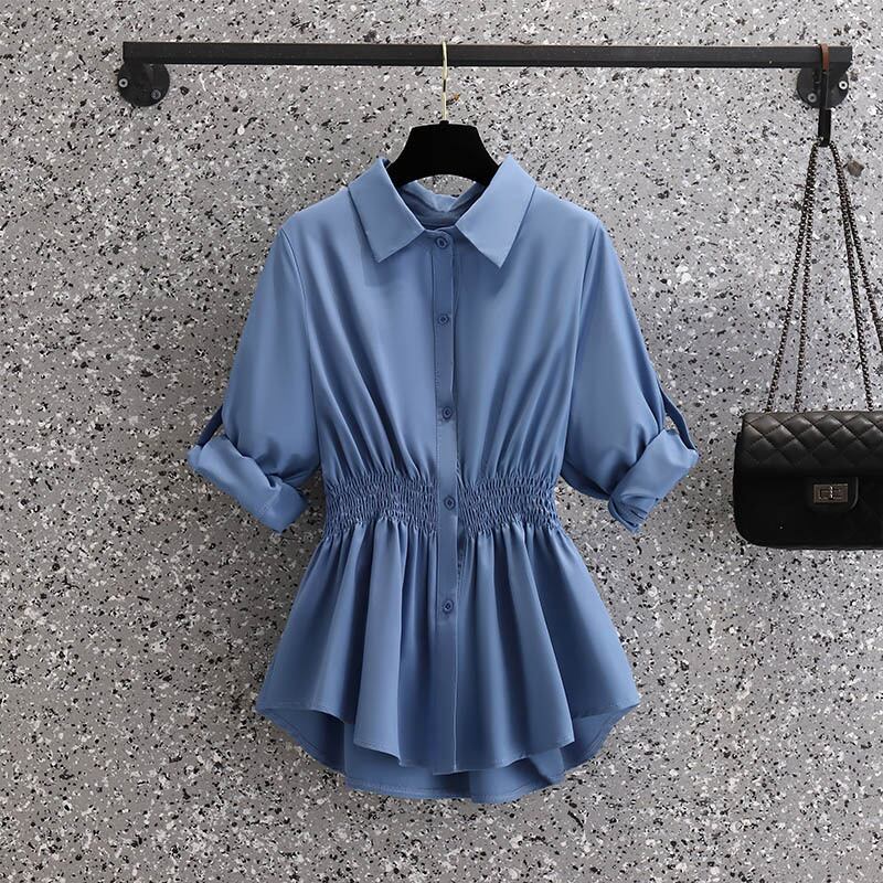 プラスサイズの婦人服 2023 春の新スタイル脂肪姉妹ファッションルーズウエストプリーツデザイン無地カジュアルシャツ 大きめサイズ スプリング 春物 ソリッドカラー 8884196125549713