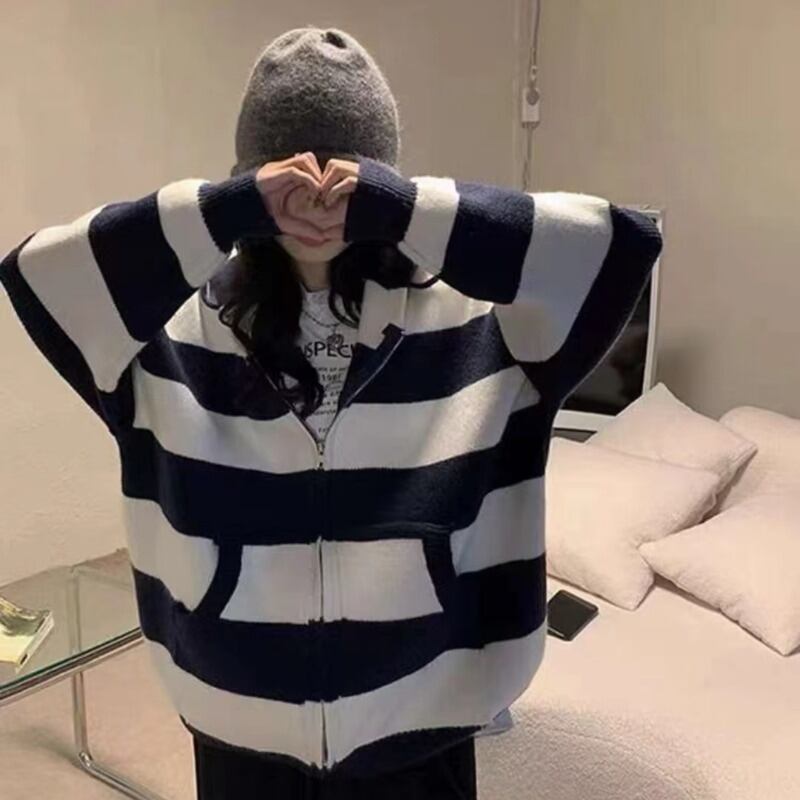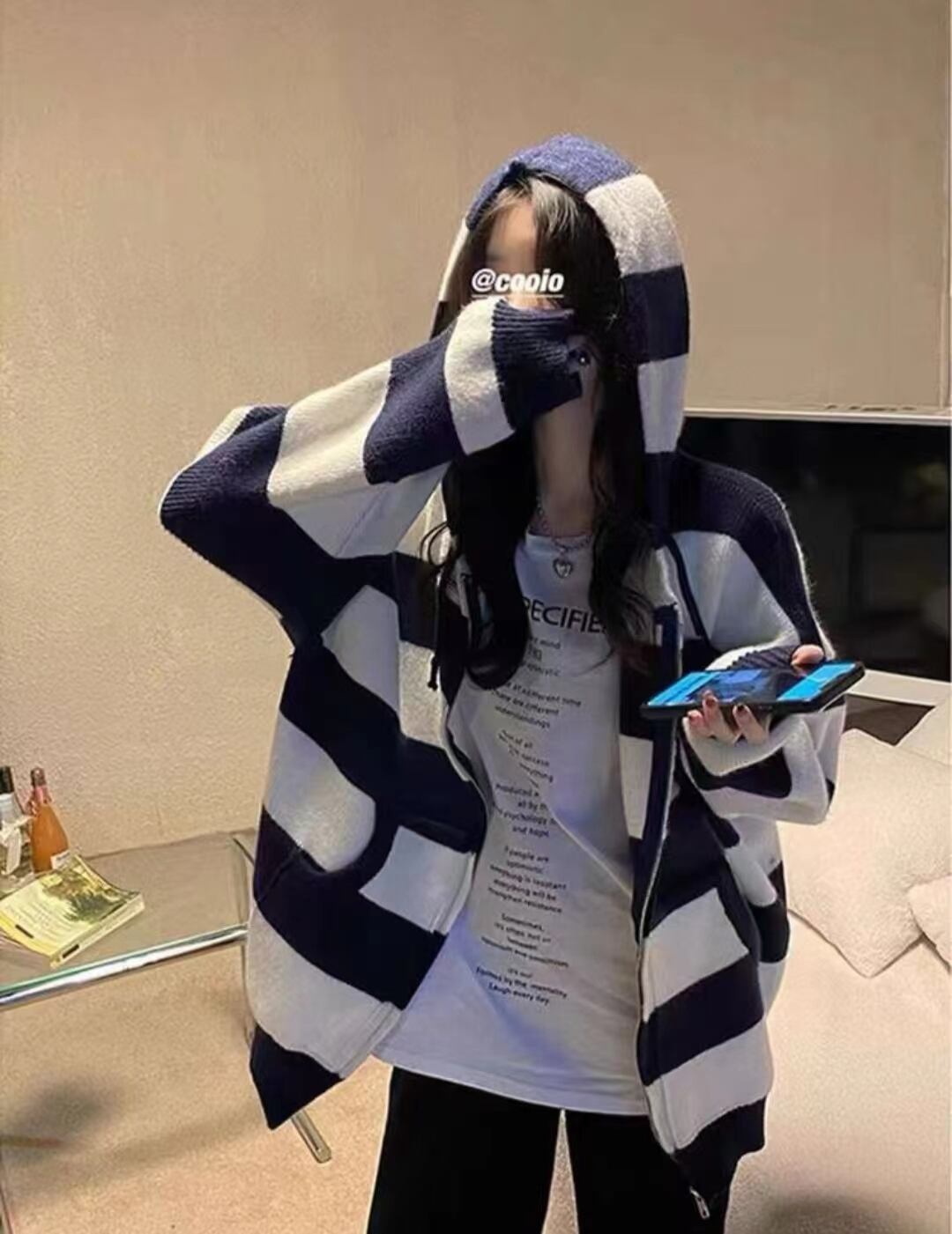 プラスサイズの婦人服 2023 ファットシスター春の新ストライプフード付き巾着ジッパーセーターカーディガン緩いジャケット 大きめサイズ スプリング 春物 8884190591968054