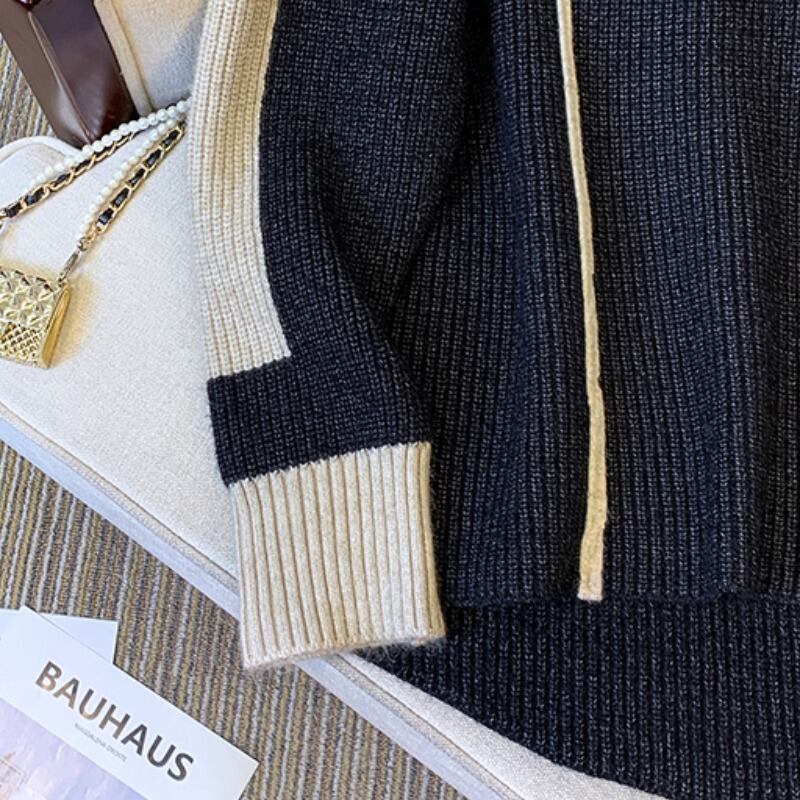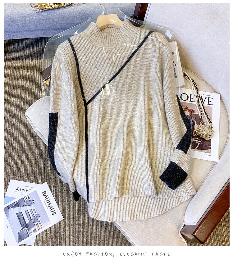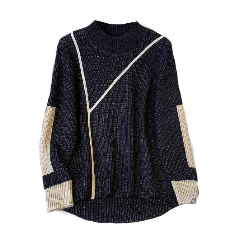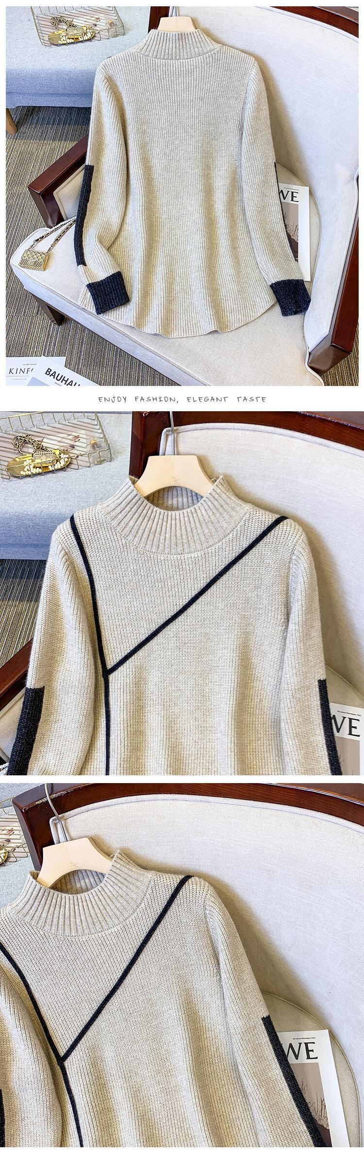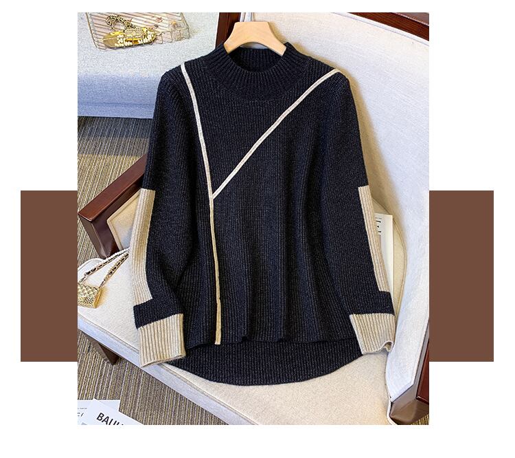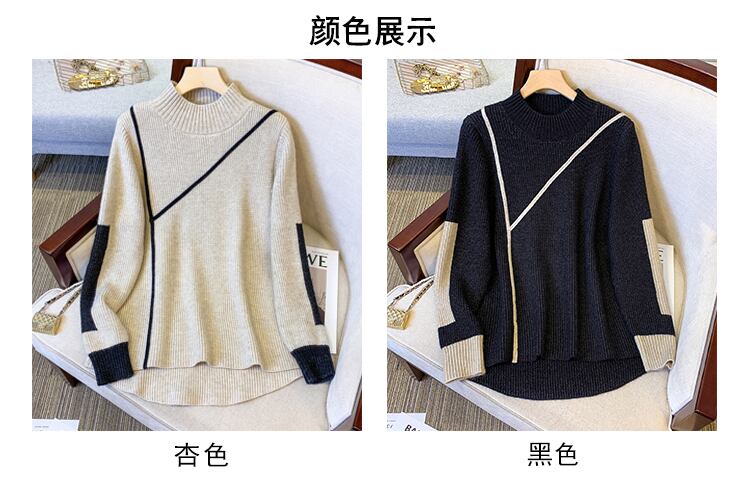 プラスサイズの婦人服 2023 春の新しいファットシスターカラーコントラストステッチハーフハイカラースリムレトロニットセーター女性 大きめサイズ スプリング 春物 8884114677607342