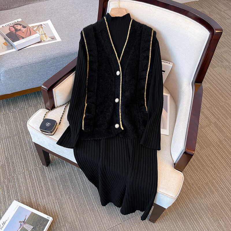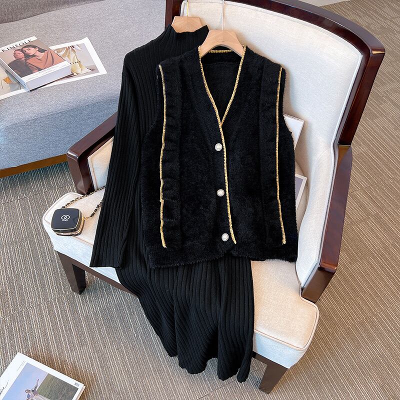 プラスサイズの婦人服2023ファットシスター春の新作Vネックベストニットハーフハイカラードレスツーピースセット 大きめサイズ スプリング 春物 8884166131948863