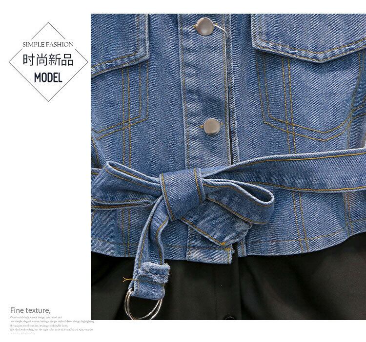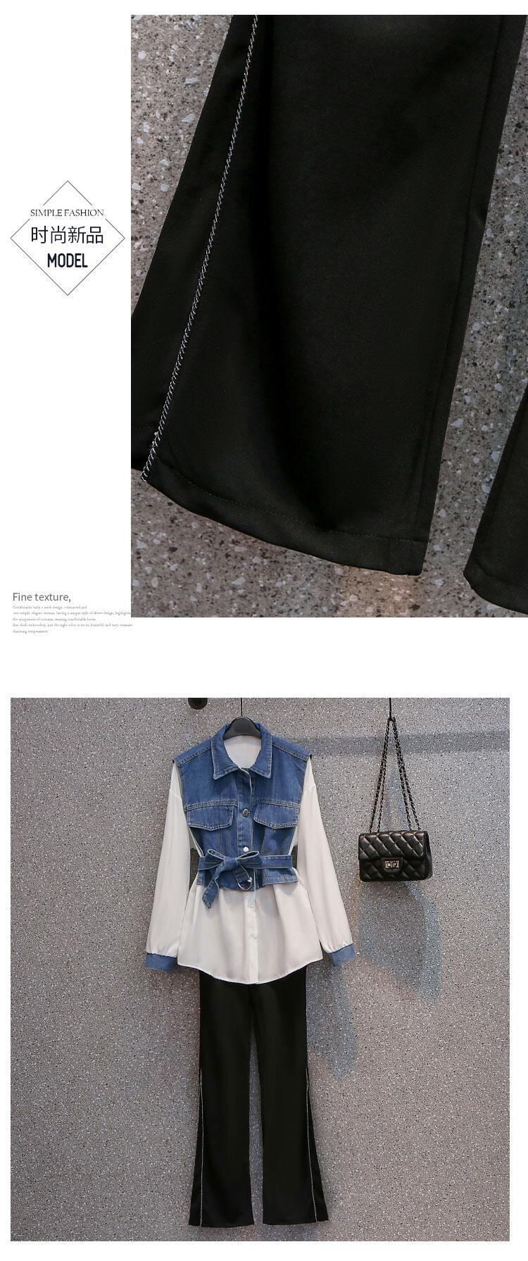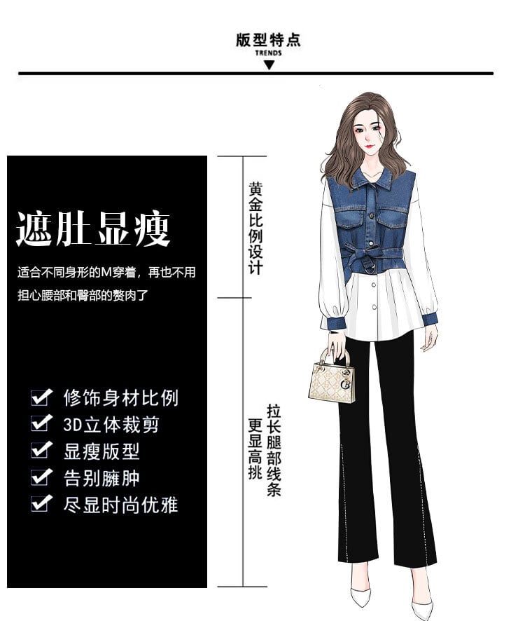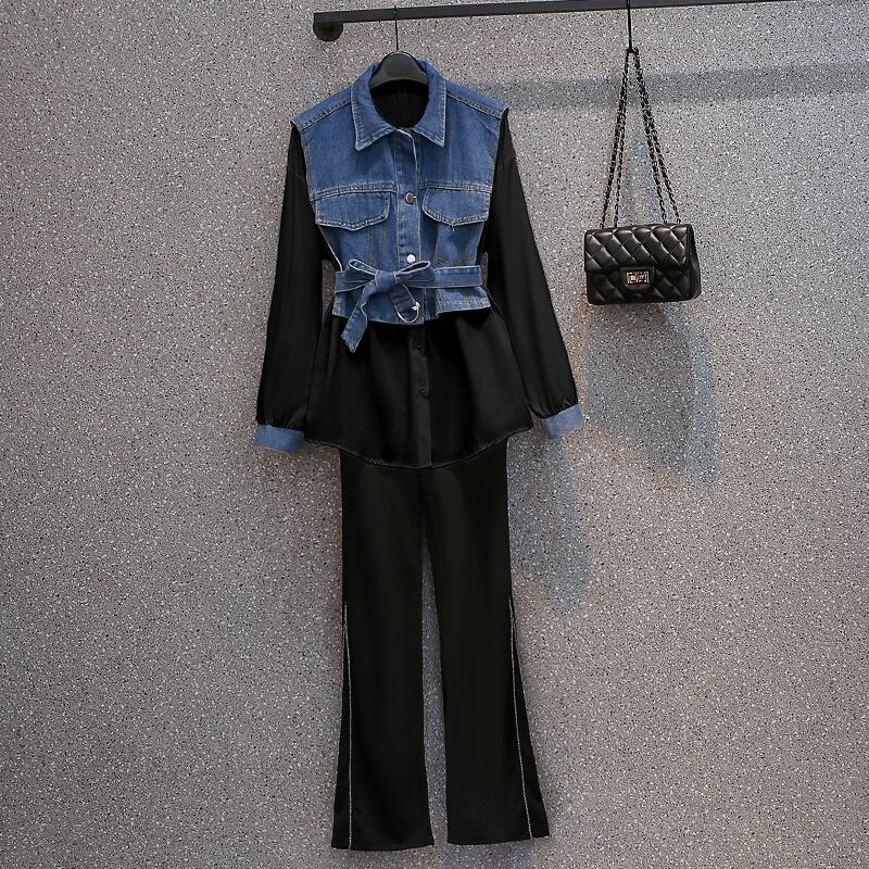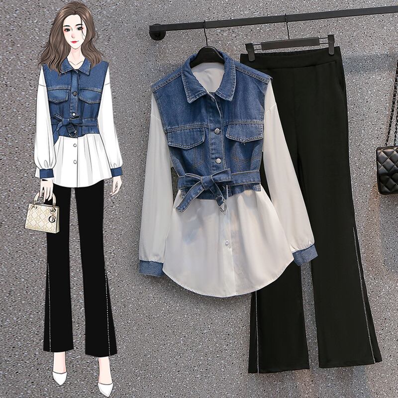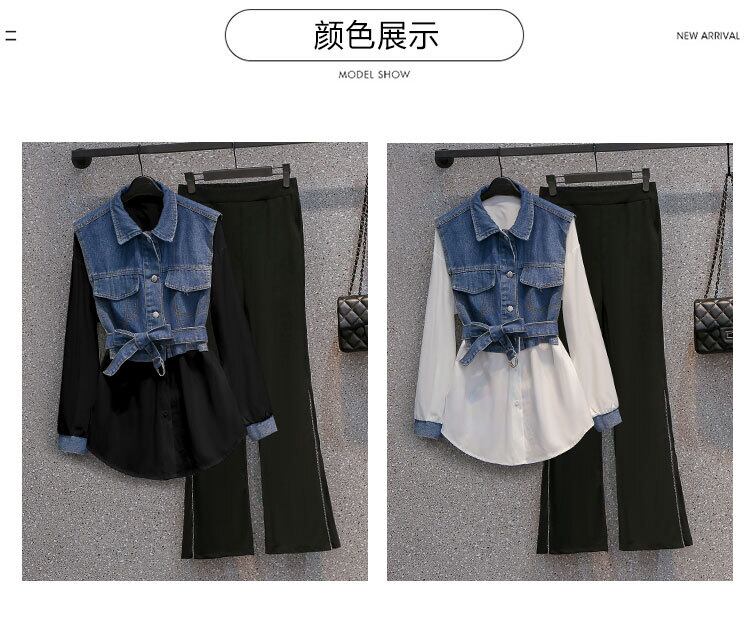 プラスサイズの婦人服 2023 ファットシスター春の新作デニムスプライシングシャツ表示薄いボディカバーカジュアルパンツ 2 点セット 大きめサイズ スプリング 春物 8884161195621192