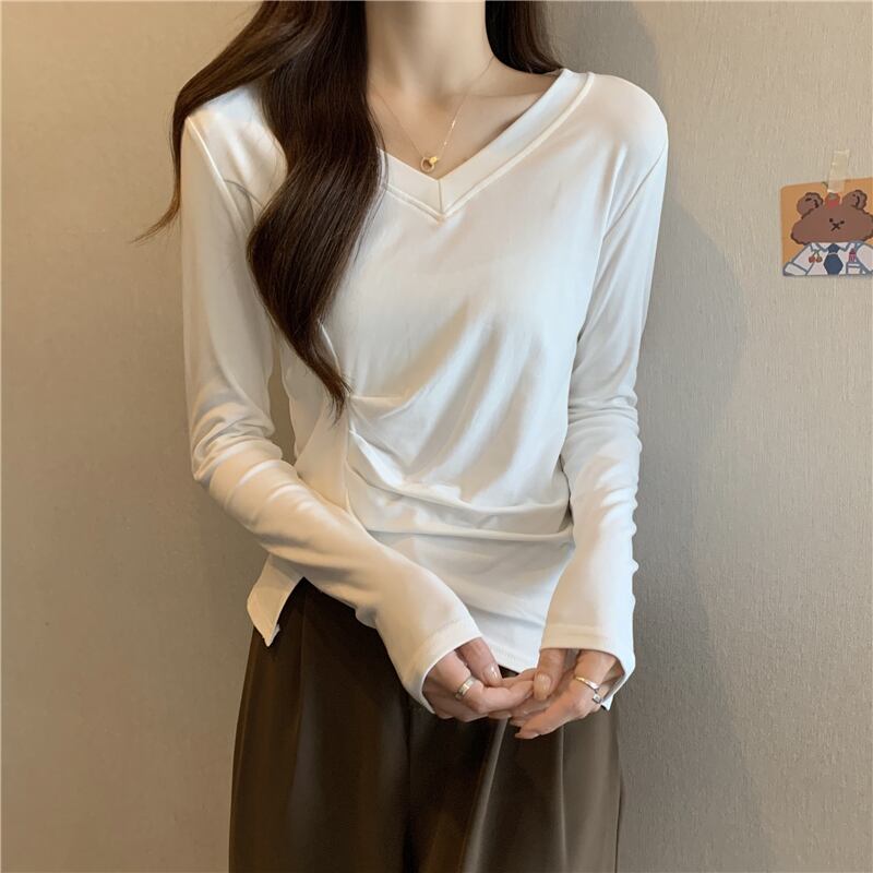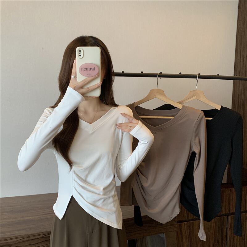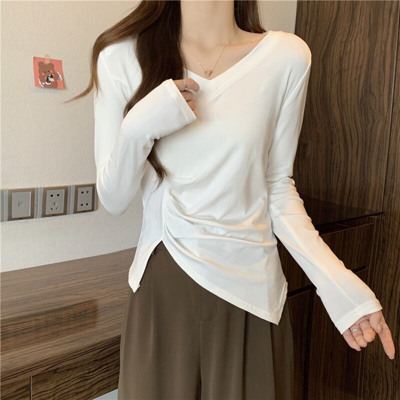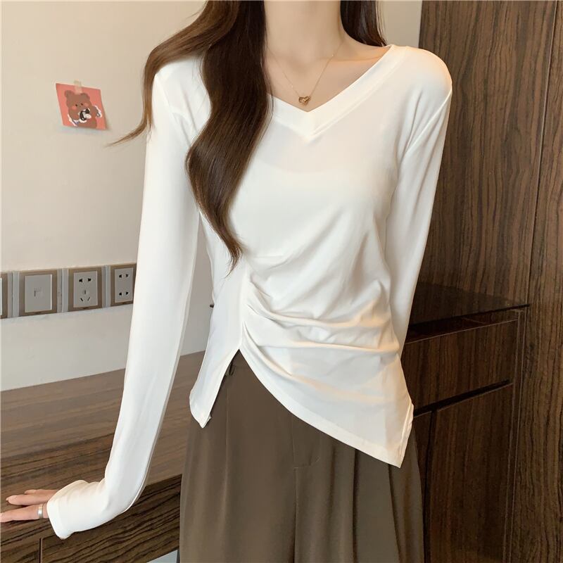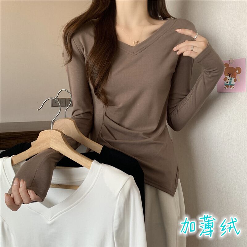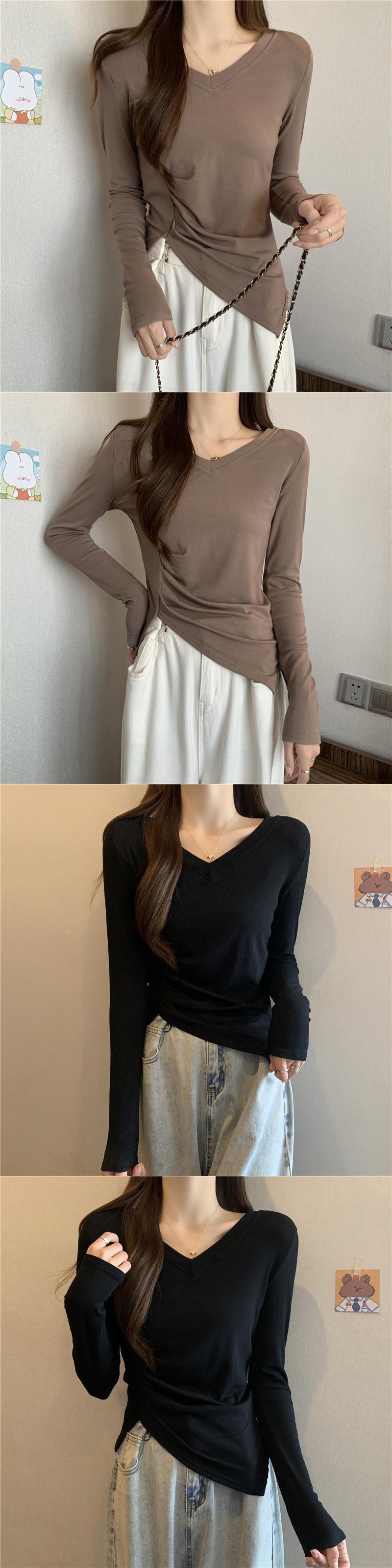 大きいサイズの婦人服 2023 トレンディな女性の春の新しいファット シスター V ネック肥厚ファッション デザイン センス不規則な底入れ T シャツ 大きめサイズ スプリング 春物 Vネック Tシャツ 8884167286279490