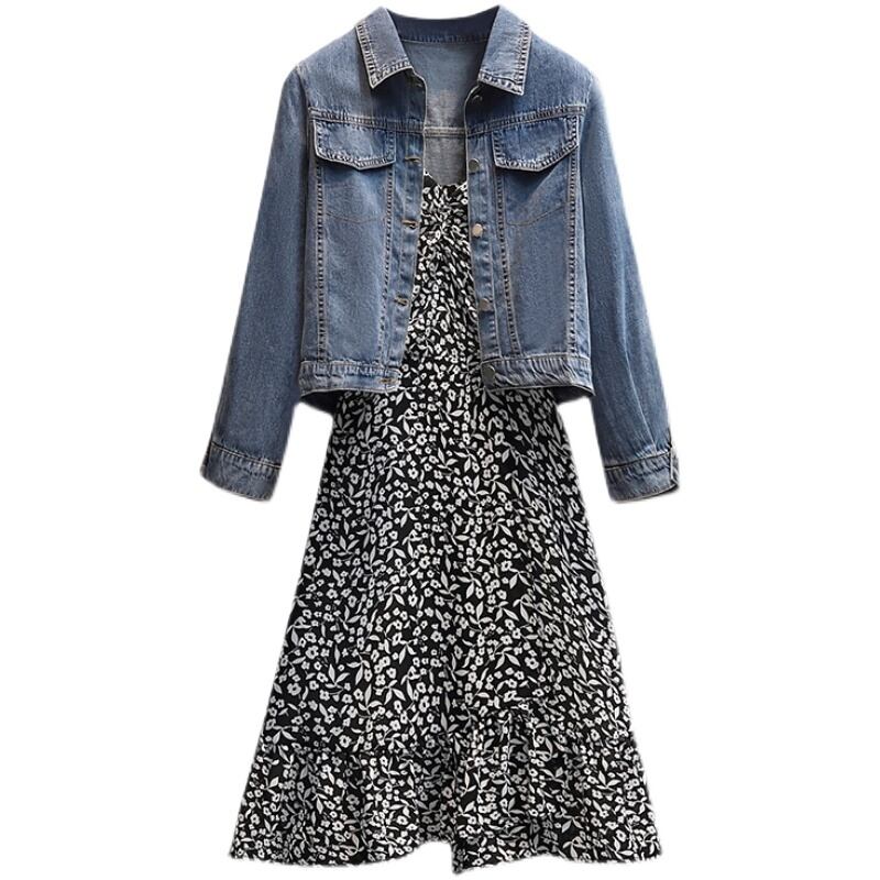 大きいサイズの婦人服 2023 ファット シスター 春の新しいファッション 年齢を減らすデニム ジャケット 花柄サスペンダー スカート ツーピース スーツ 大きめサイズ スプリング 春物 8884166495020978