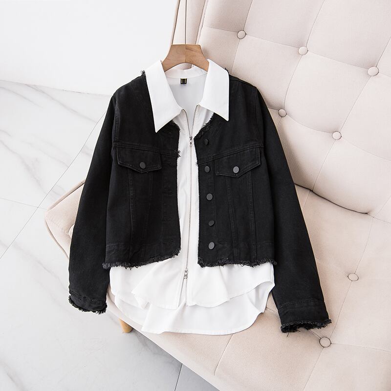 プラスサイズの婦人服 2023 春服ファットシスターズ新しいオールマッチジッパーシャツショートデニムジャケットツーピーススーツ 大きめサイズ スプリング 春物 8884152696320619