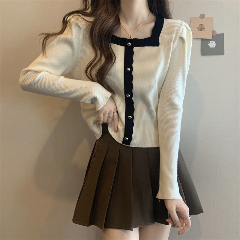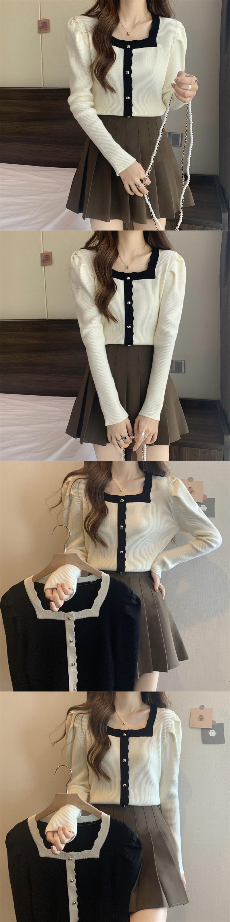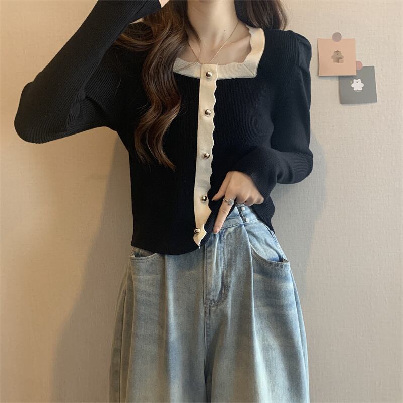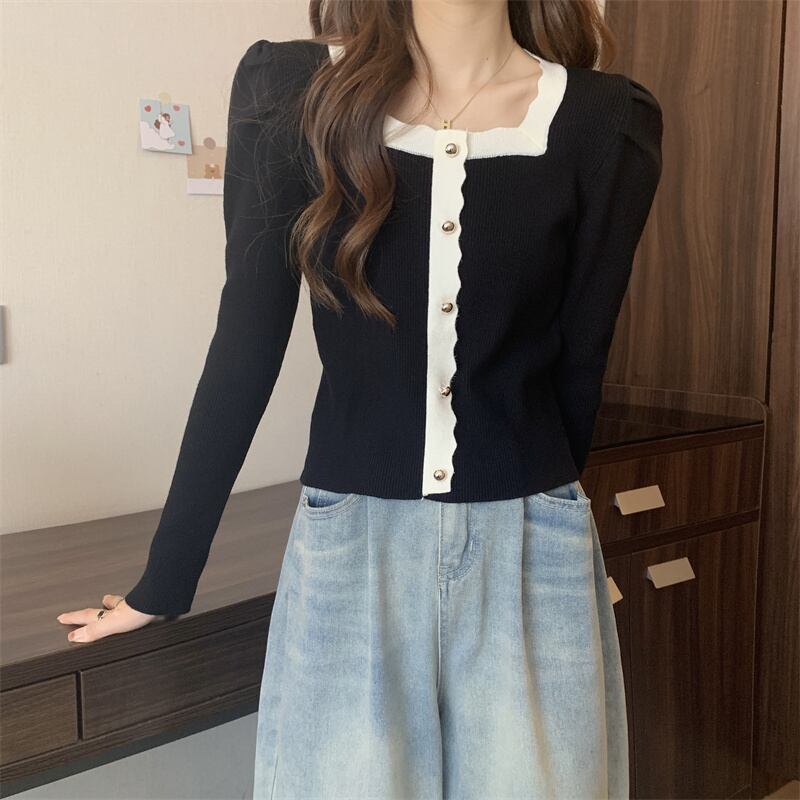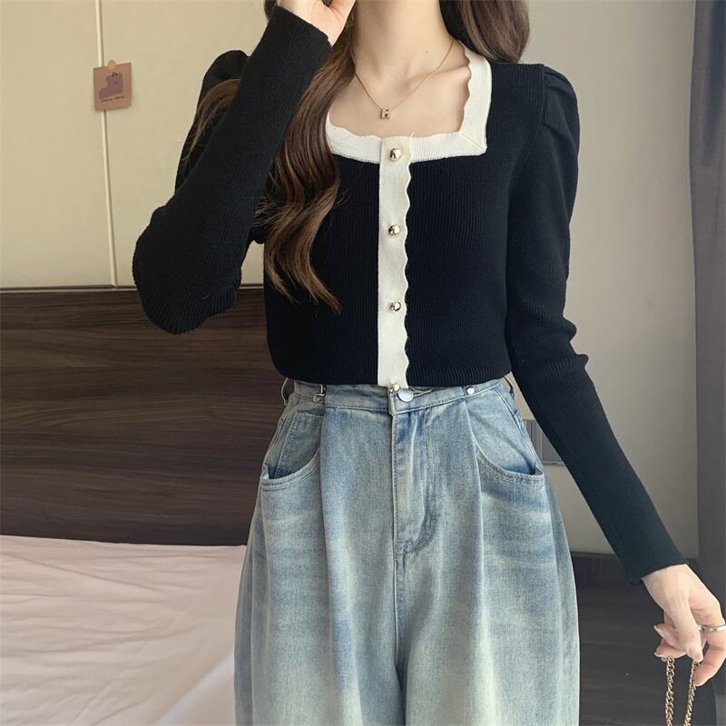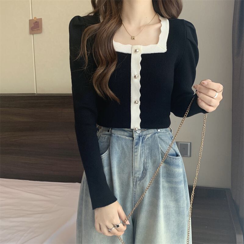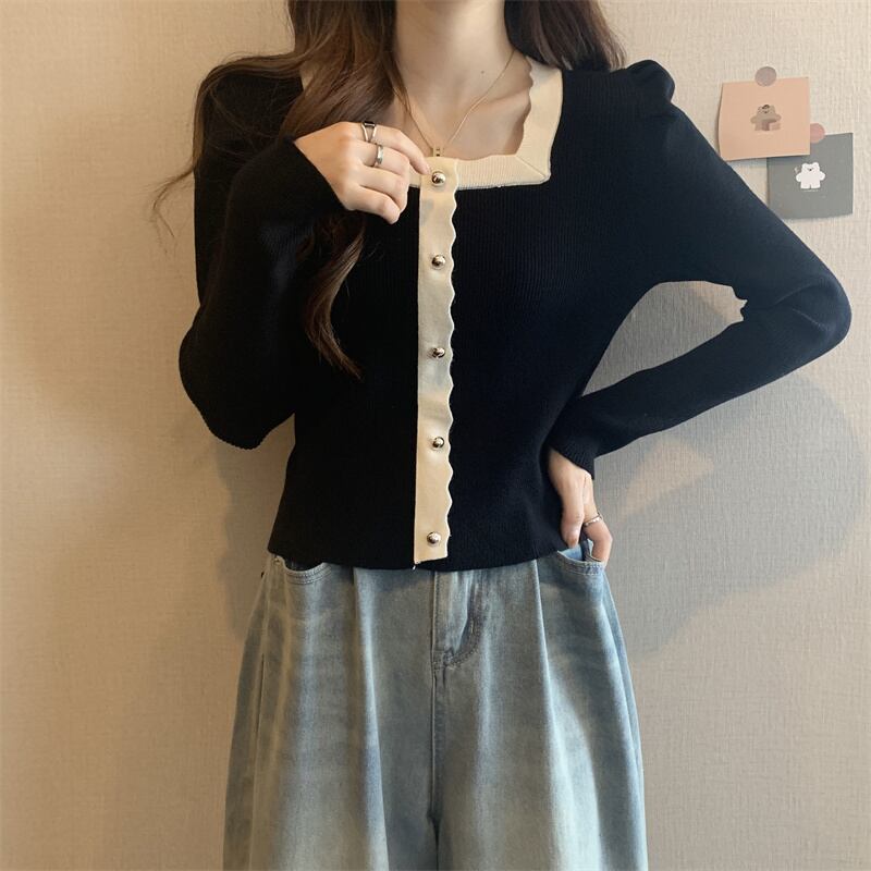 プラスサイズの婦人服 2023 春服脂肪姉妹新しいフレンチ オールマッチ スクエア カラー コントラスト カラー ニット長袖トップ ロング 大きめサイズ スプリング 春物 スクウェア 8884168196109920