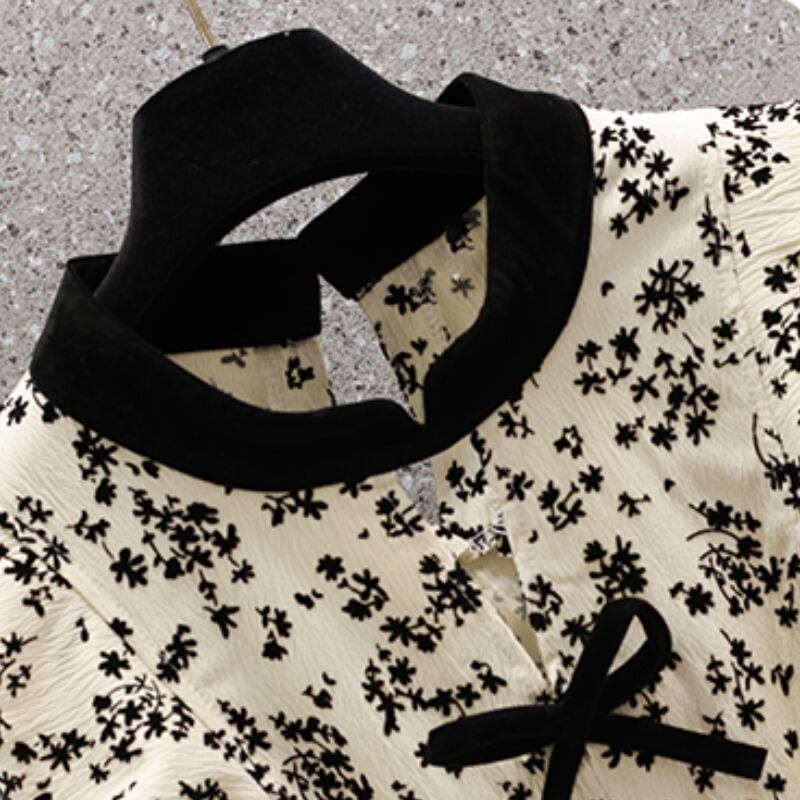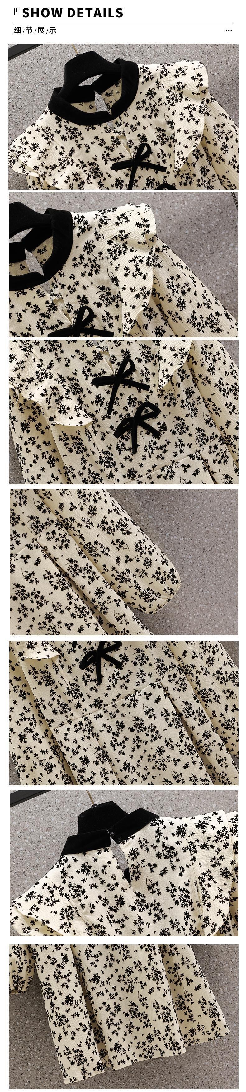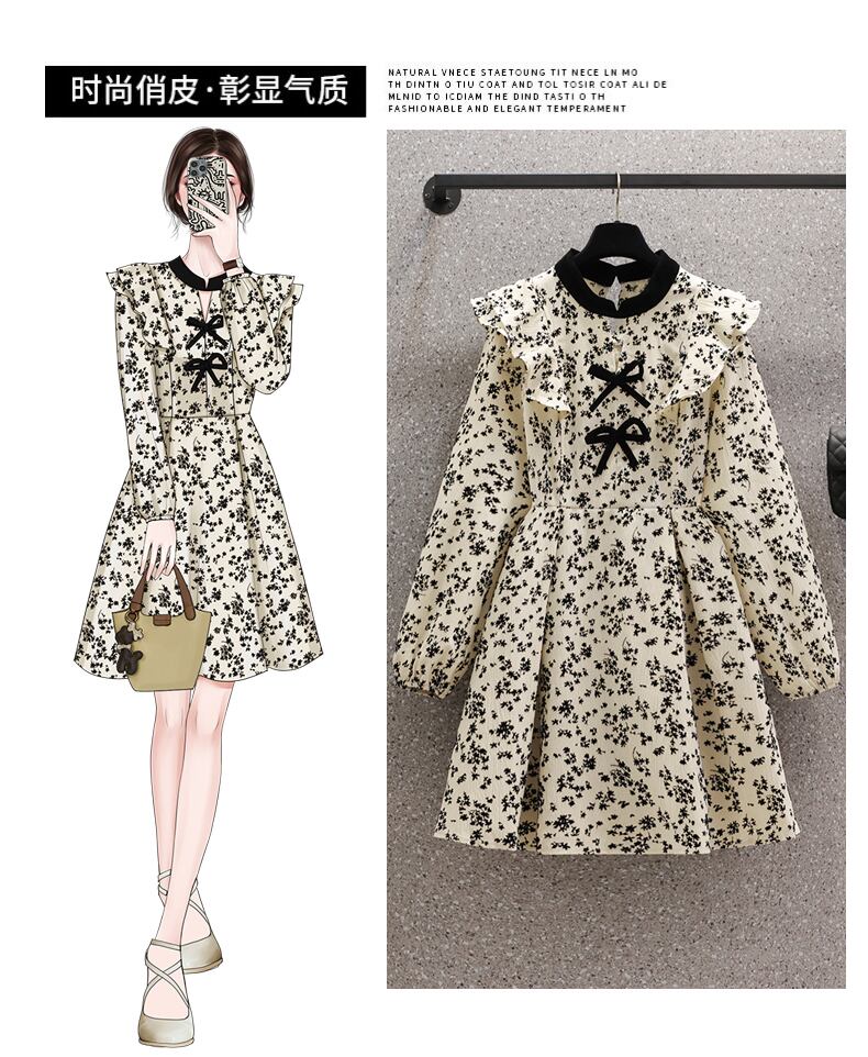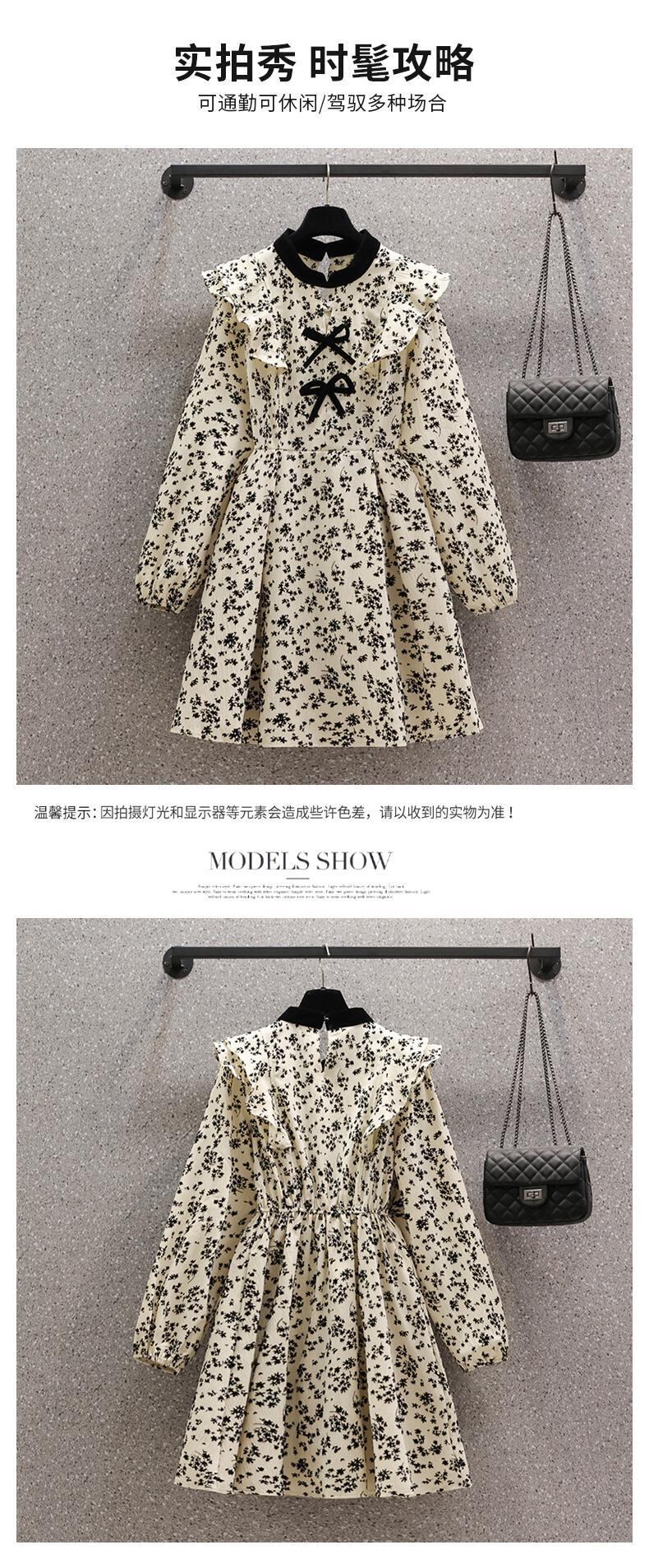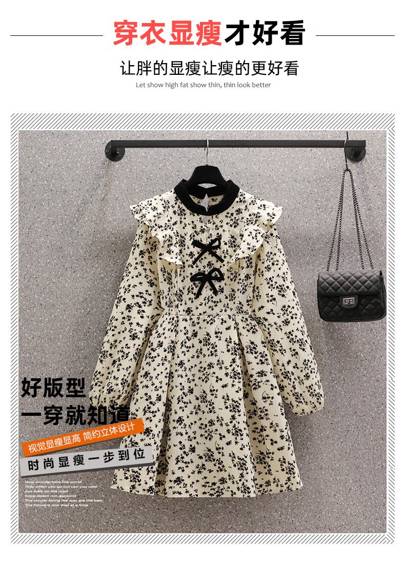 プラスサイズの婦人服 2023 春の新しいファットシスターフレンチレトロフローラルウッドイヤーちょう結び長袖ドレス ロング リボン 大きめサイズ スプリング 春物 花柄 8884134054450708