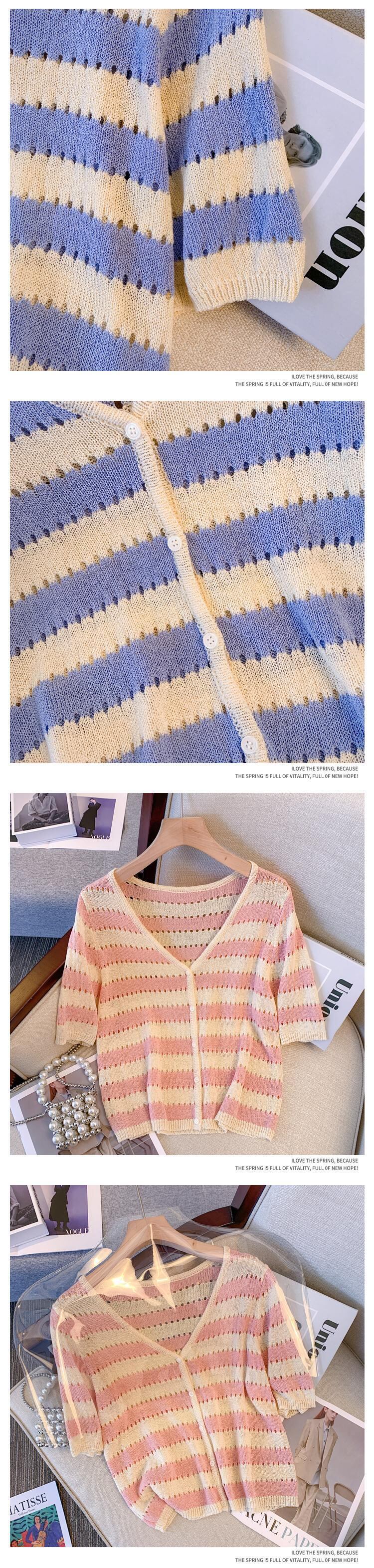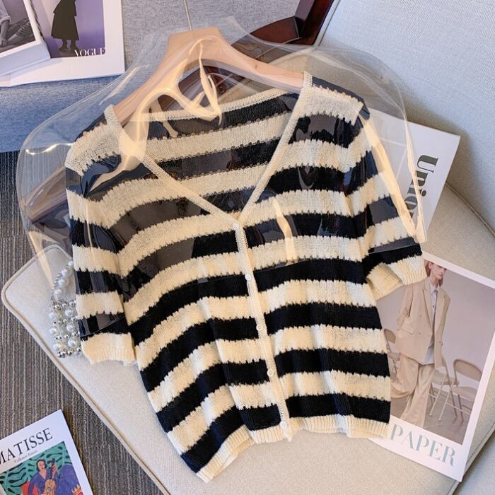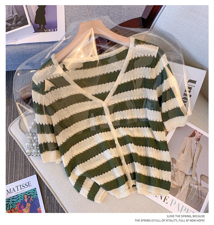 プラスサイズの婦人服 2023 夏の新しい太った姉妹に見える薄いファッション気質 V ネックオールマッチストライプは肉 Tシャツの女性をカバー 大きめサイズ サマー 夏物 Vネック 8884176734441261