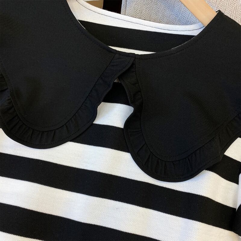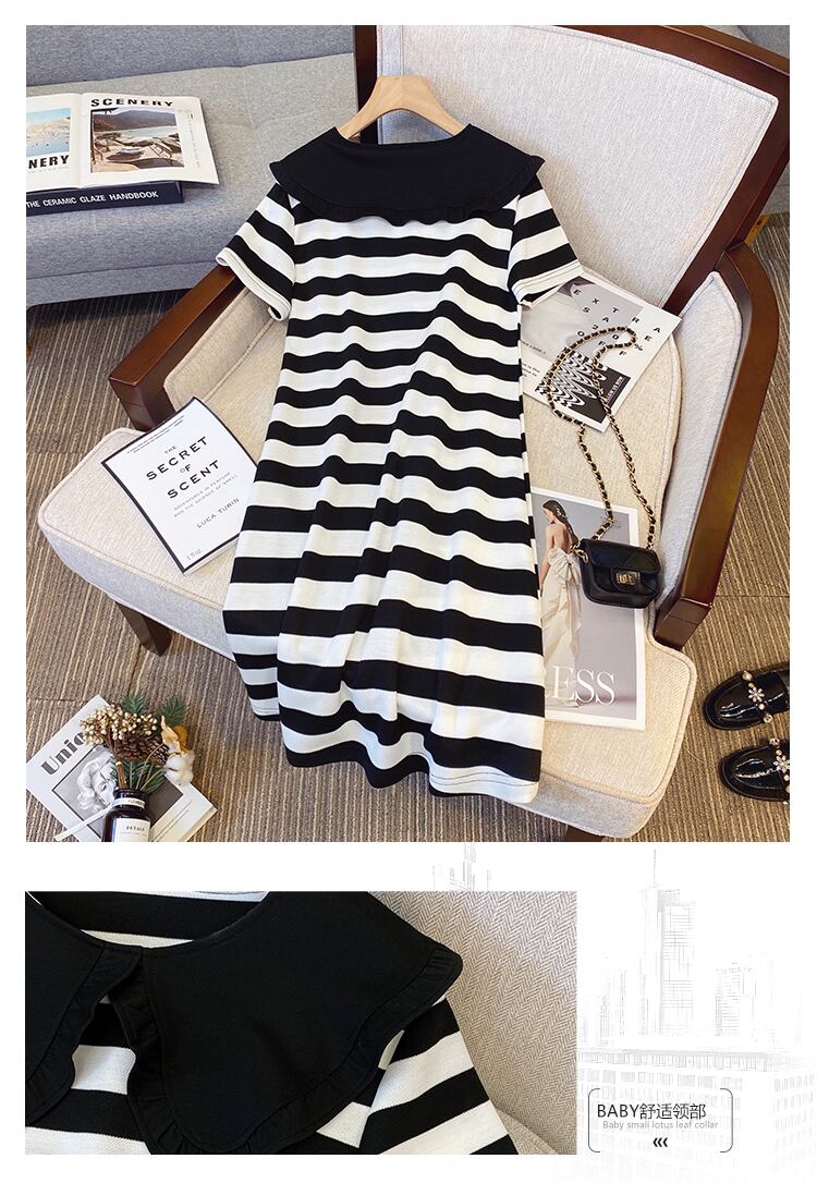 プラスサイズの婦人服 2023 トレンディな女性の夏の新しいファットシスターカジュアルゆるい優しい縞模様の人形の襟のドレス 大きめサイズ サマー 夏物 ストライプ 8884181147590263