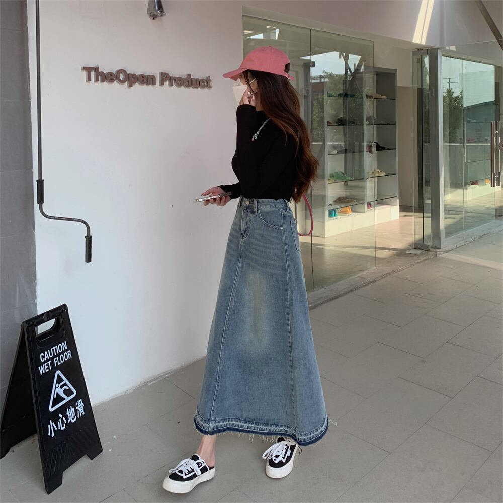 プラスサイズの婦人服 2023 脂肪姉妹春の新生エッジデニムスカートの女性のレトロなハイウエスト一言ロングスカートの女性 ハイウェスト 大きめサイズ スプリング 春物 8884135525477110