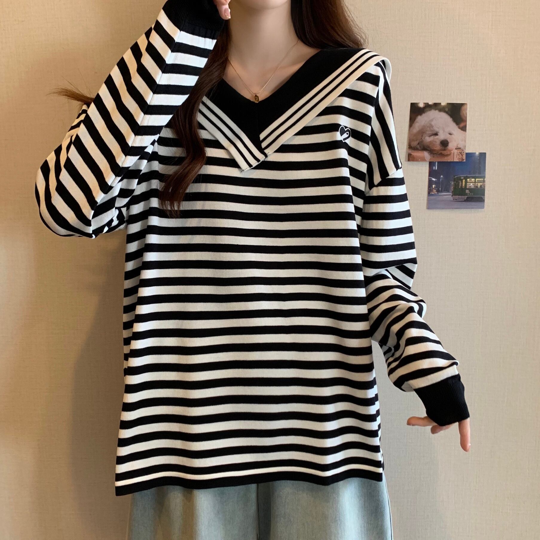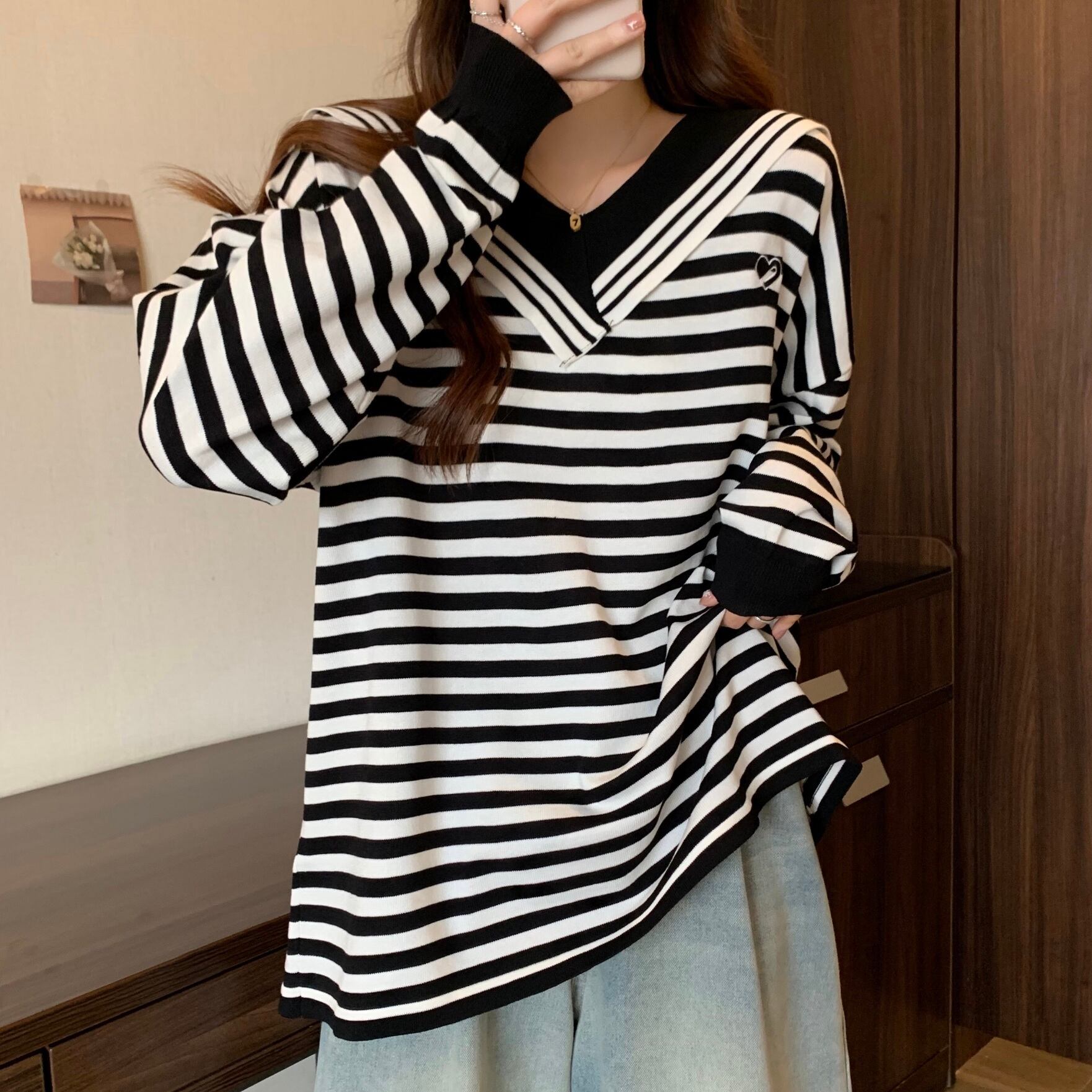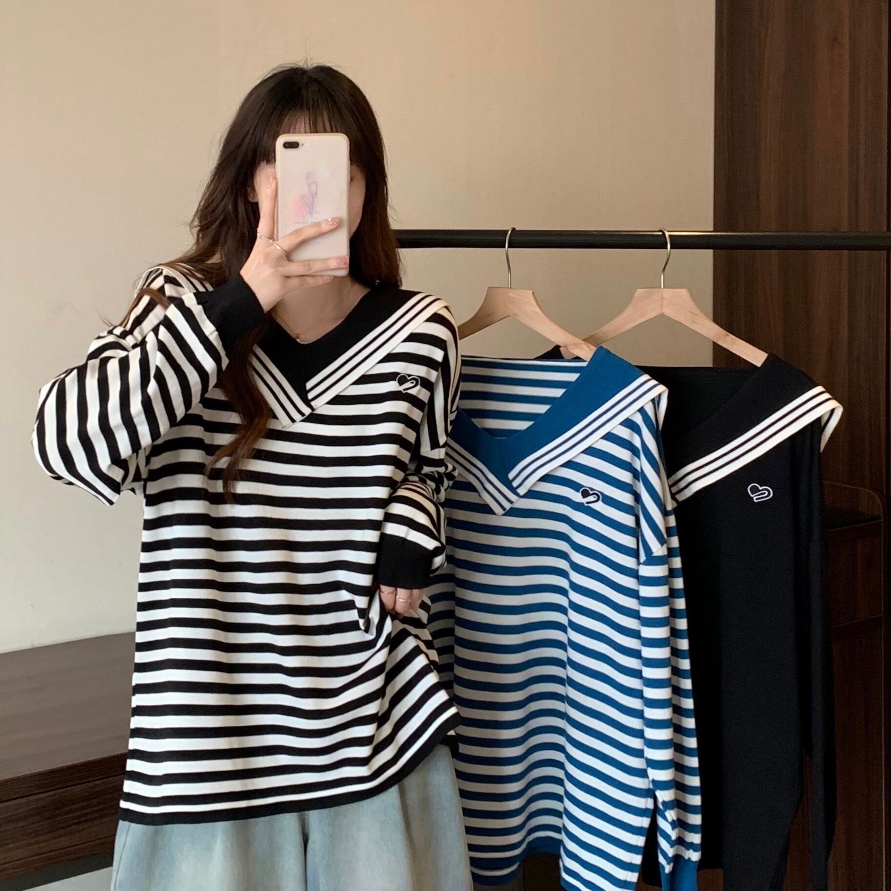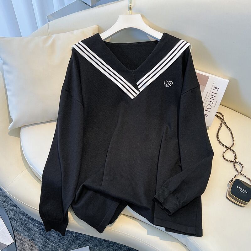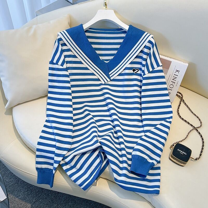 大きいサイズの婦人服 2023 春の新しいファット シスター V ネック ストライプ ルーズ ロングスリーブ ウエスタン スタイル 年齢を減らすニット トップ 大きめサイズ スプリング 春物 Vネック 8884134862631767