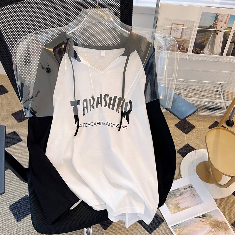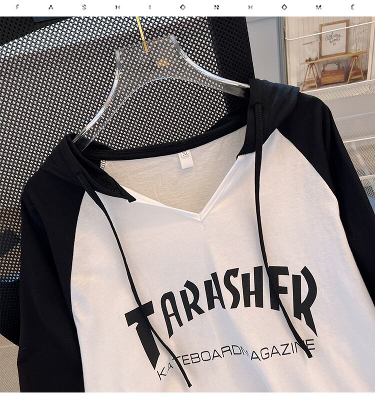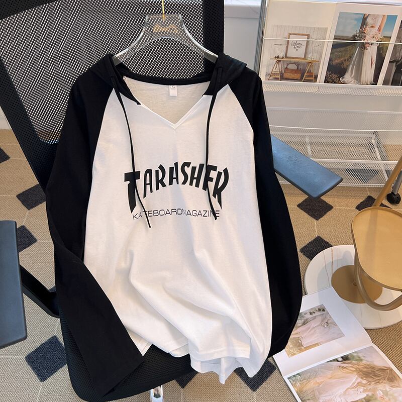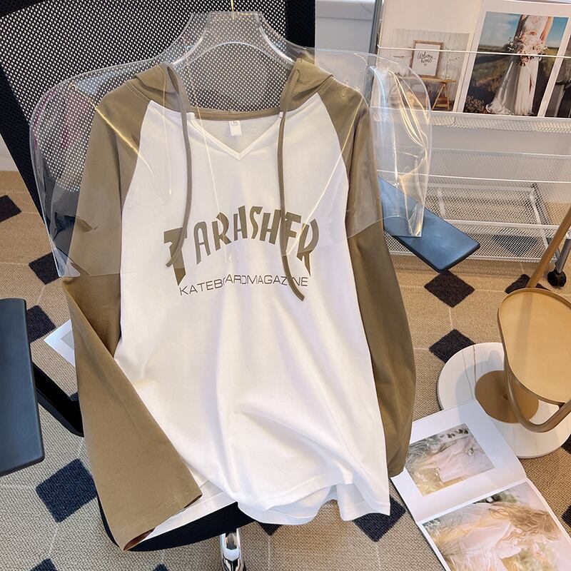 大きいサイズの婦人服2023ファットシスター春の新しいフード付きTシャツレタールーズカジュアルラグランスリーブトップ女性 大きめサイズ スプリング 春物 8884131422298827